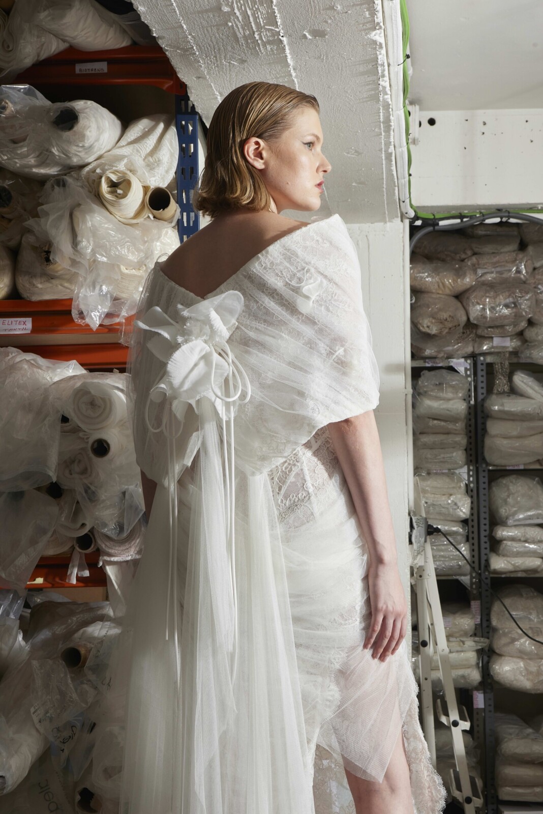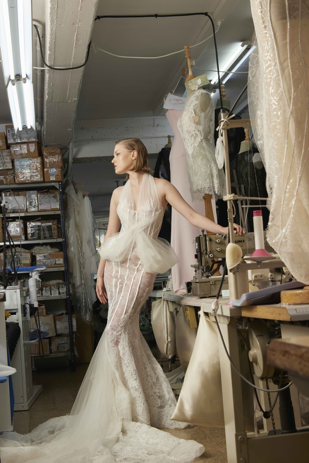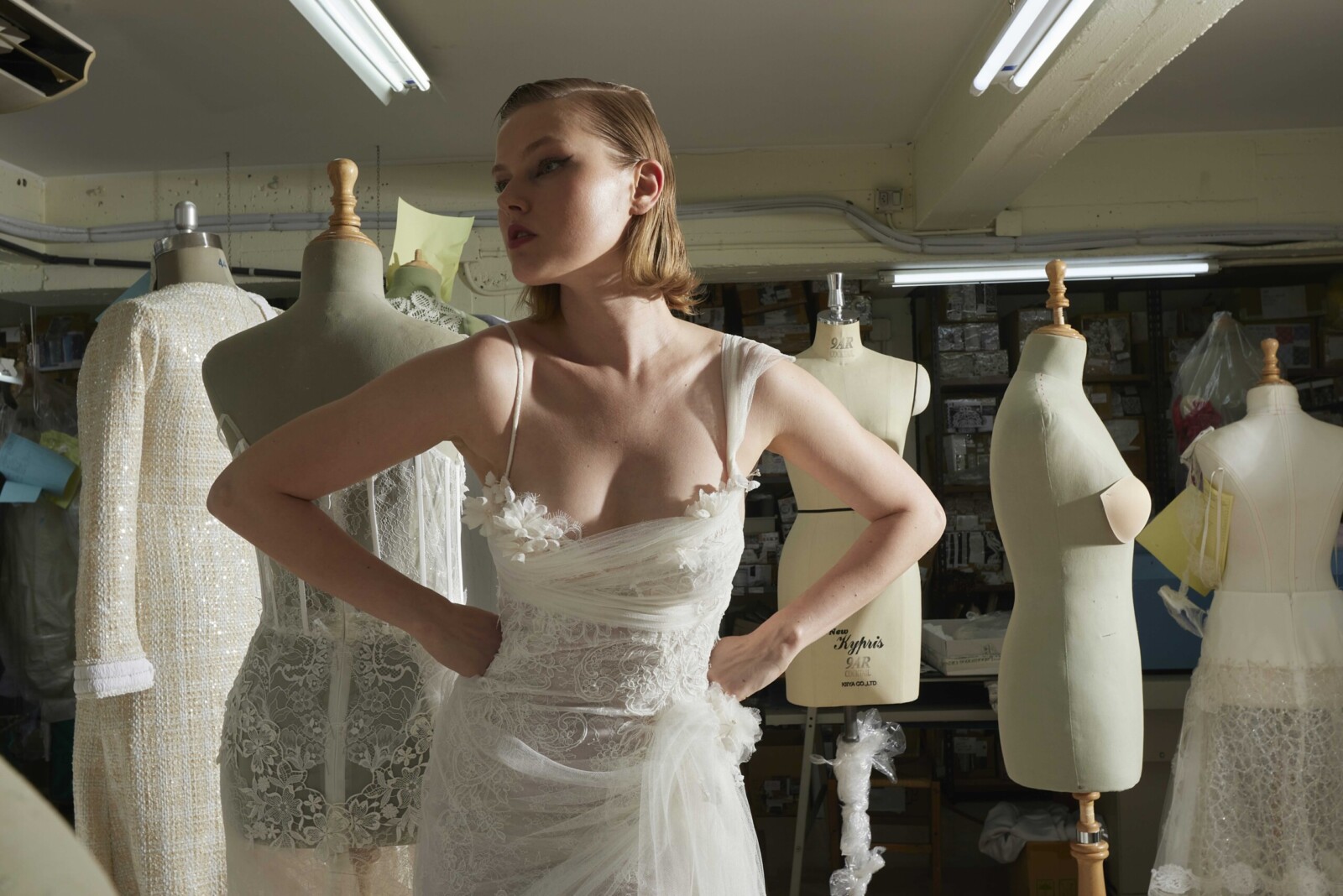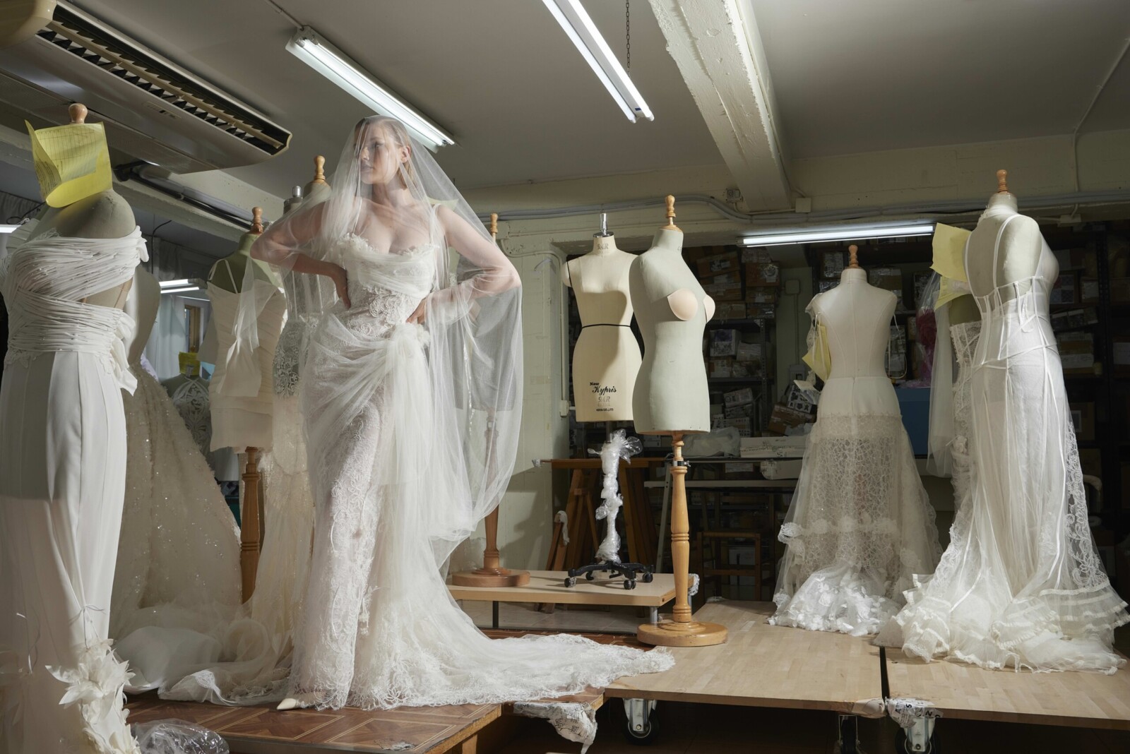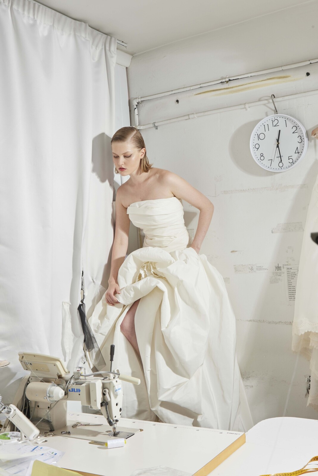 For Couture , we worked with hand -painted tulle, silk mikados, preserved and handmade flowers, hand-embroidered embellishments, Chantilly, and Calais lace — capturing eternally feminine beauty.