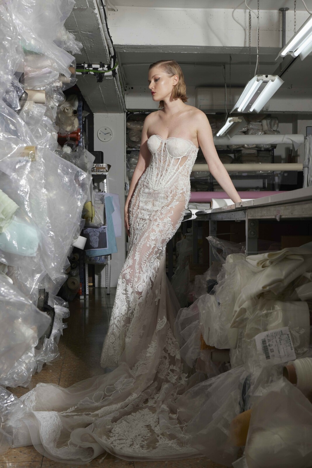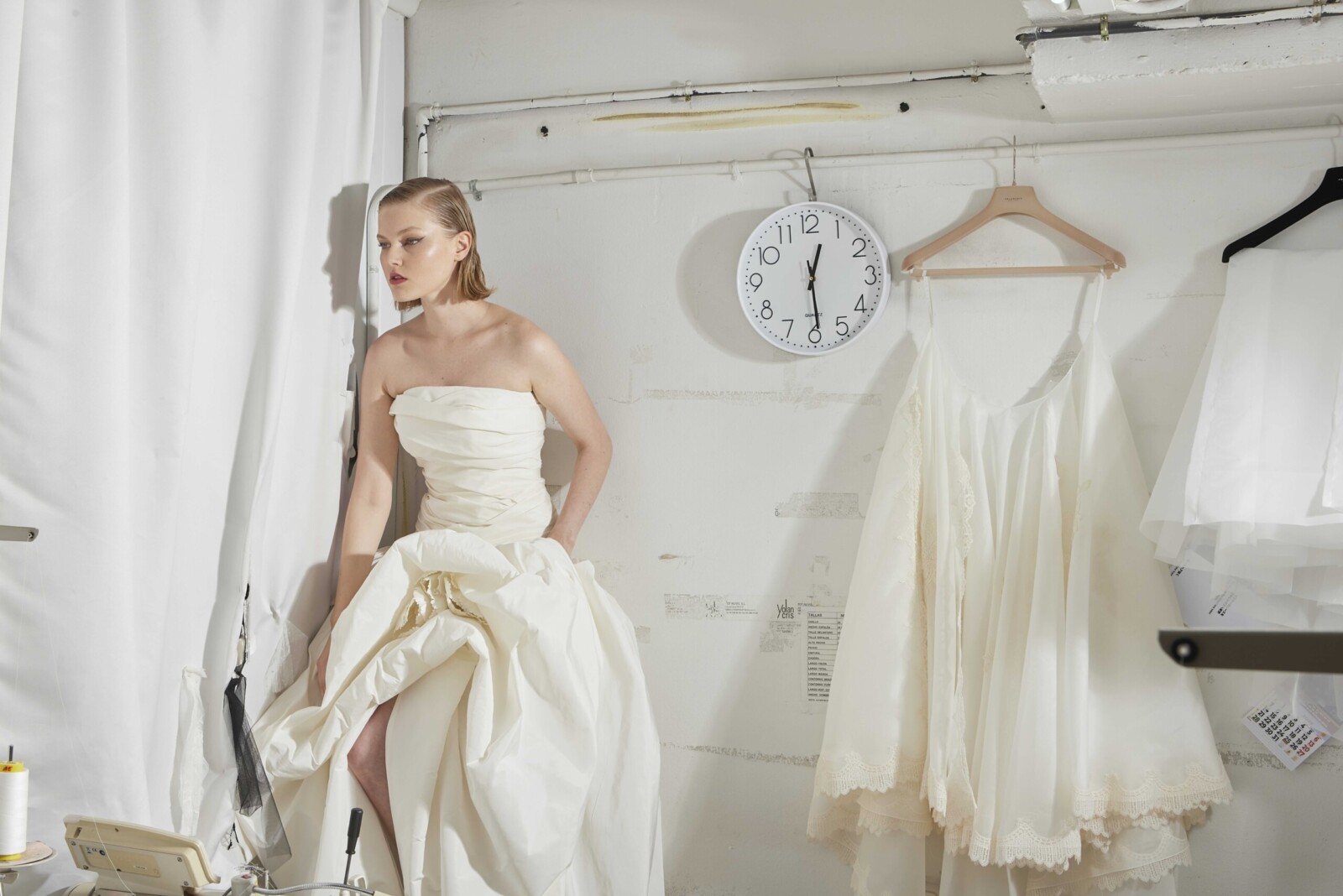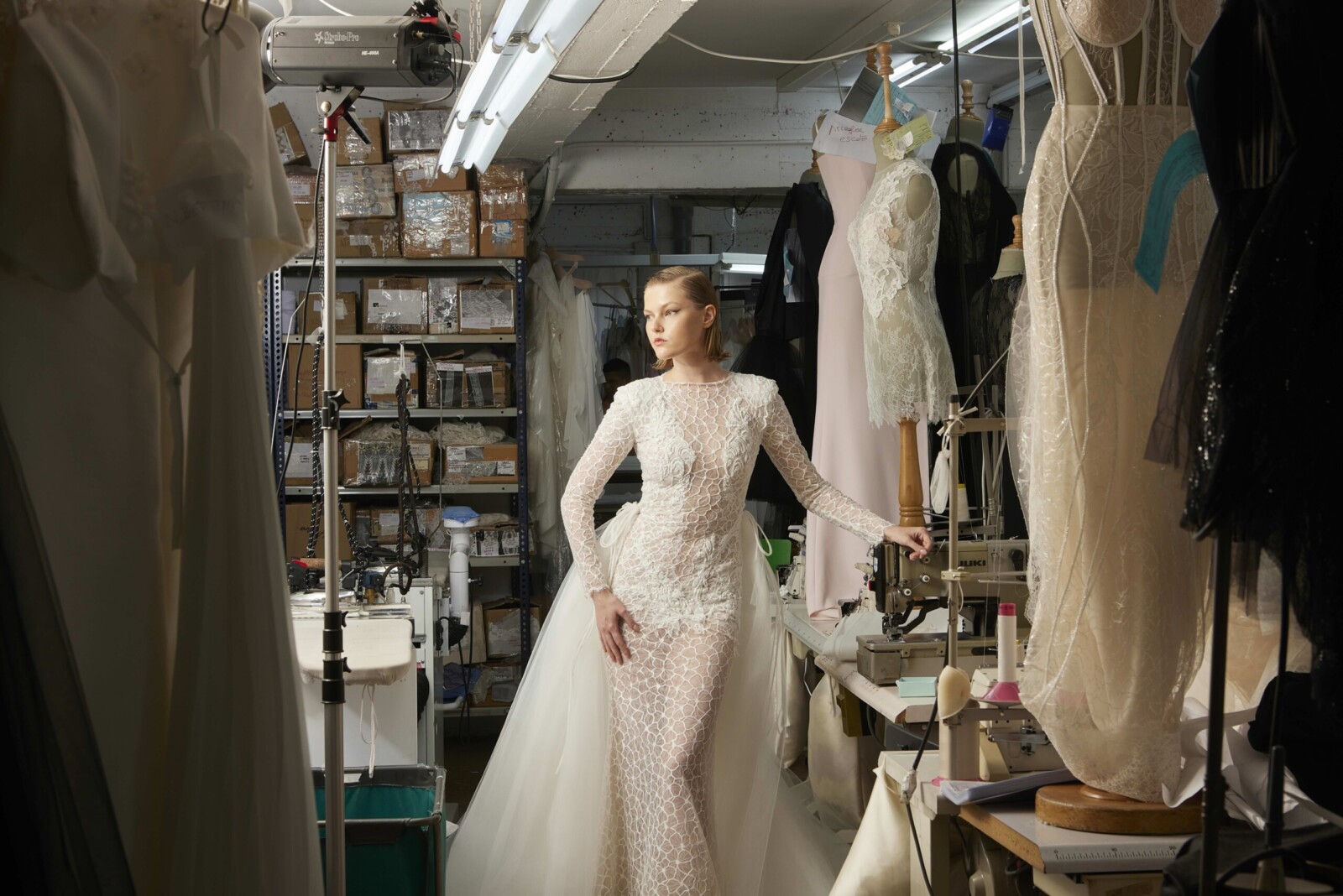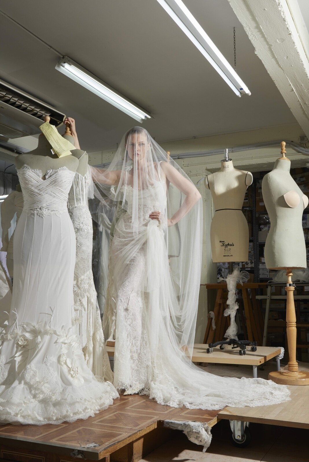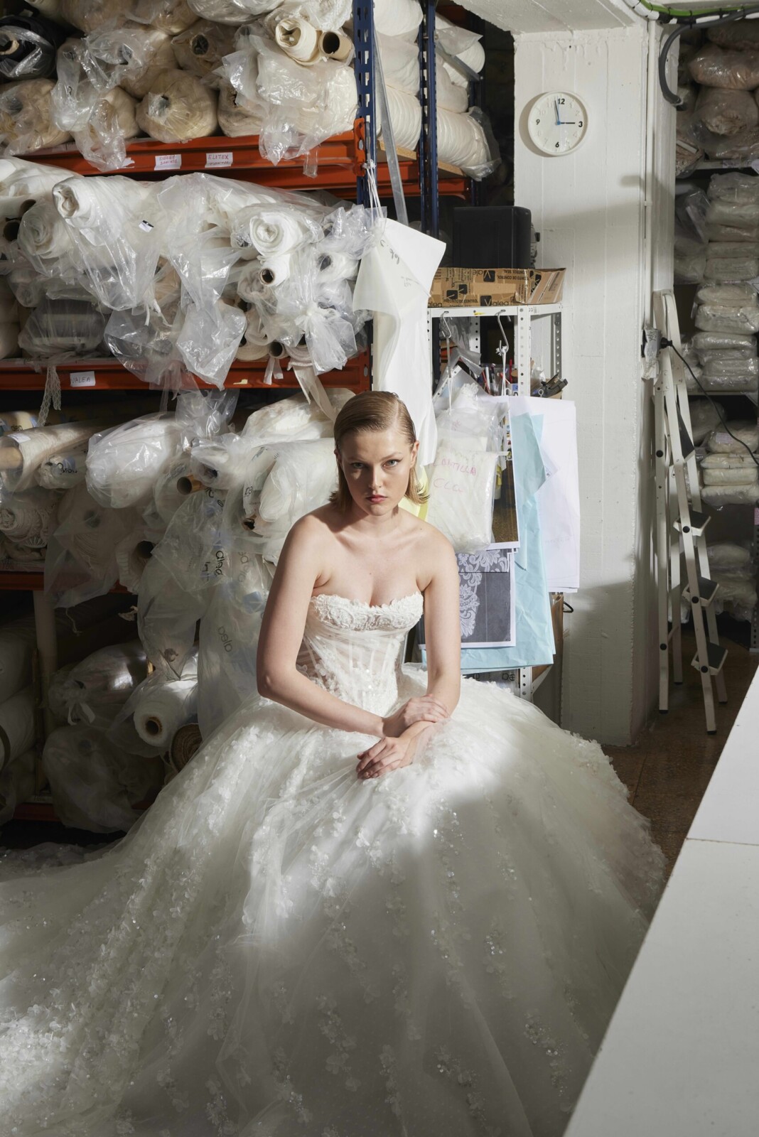 For Couture , we worked with hand -painted tulle, silk mikados, preserved and handmade flowers, hand-embroidered embellishments, Chantilly, and Calais lace — capturing eternally feminine beauty.