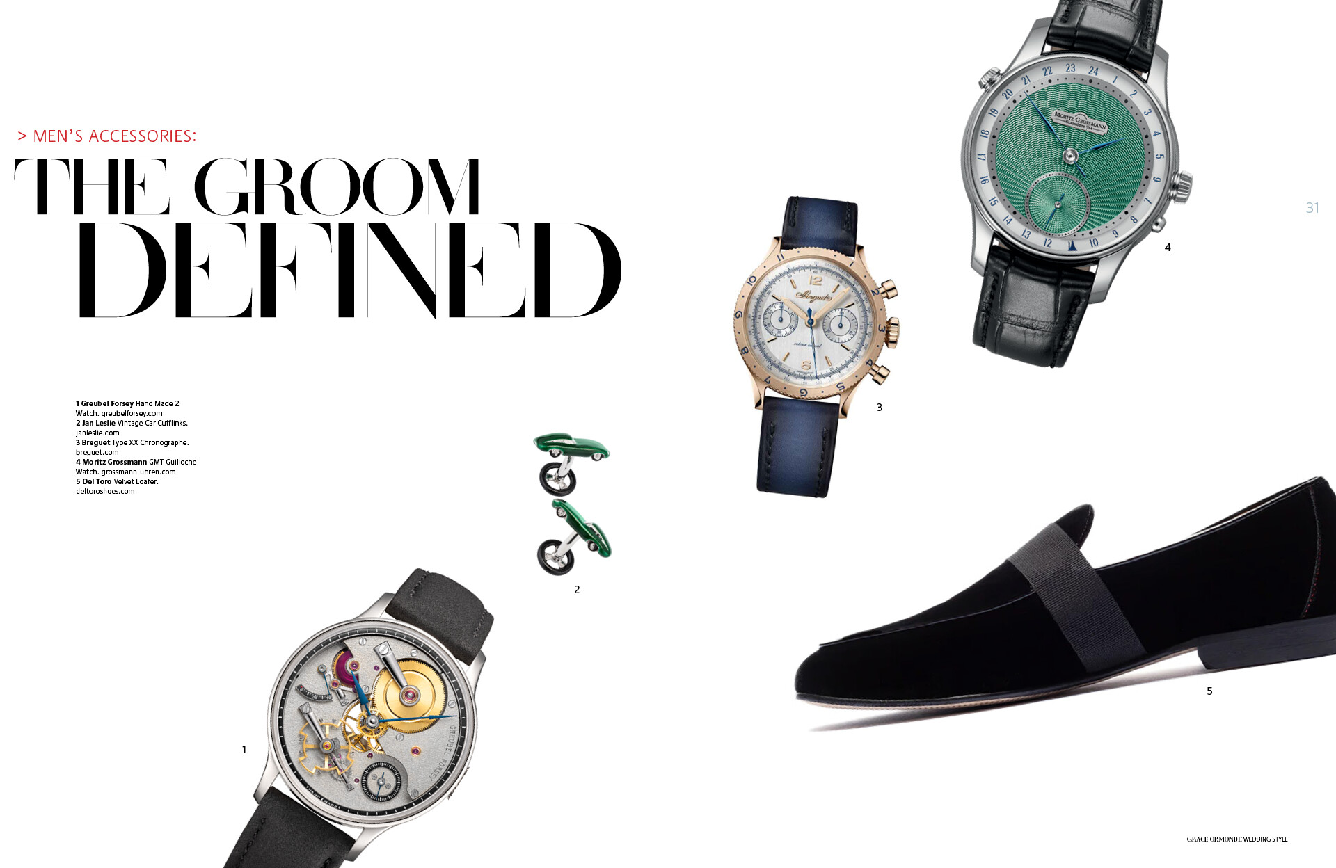 1 Greubel Forsey Hand Made 2 Watch. 2 Jan Leslie Vintage Car Cufflinks. 3 Breguet Type XX Chronographe. 4 Moritz Grossmann GMT Guilloche Watch. 5 Del Toro Velvet Loafer.