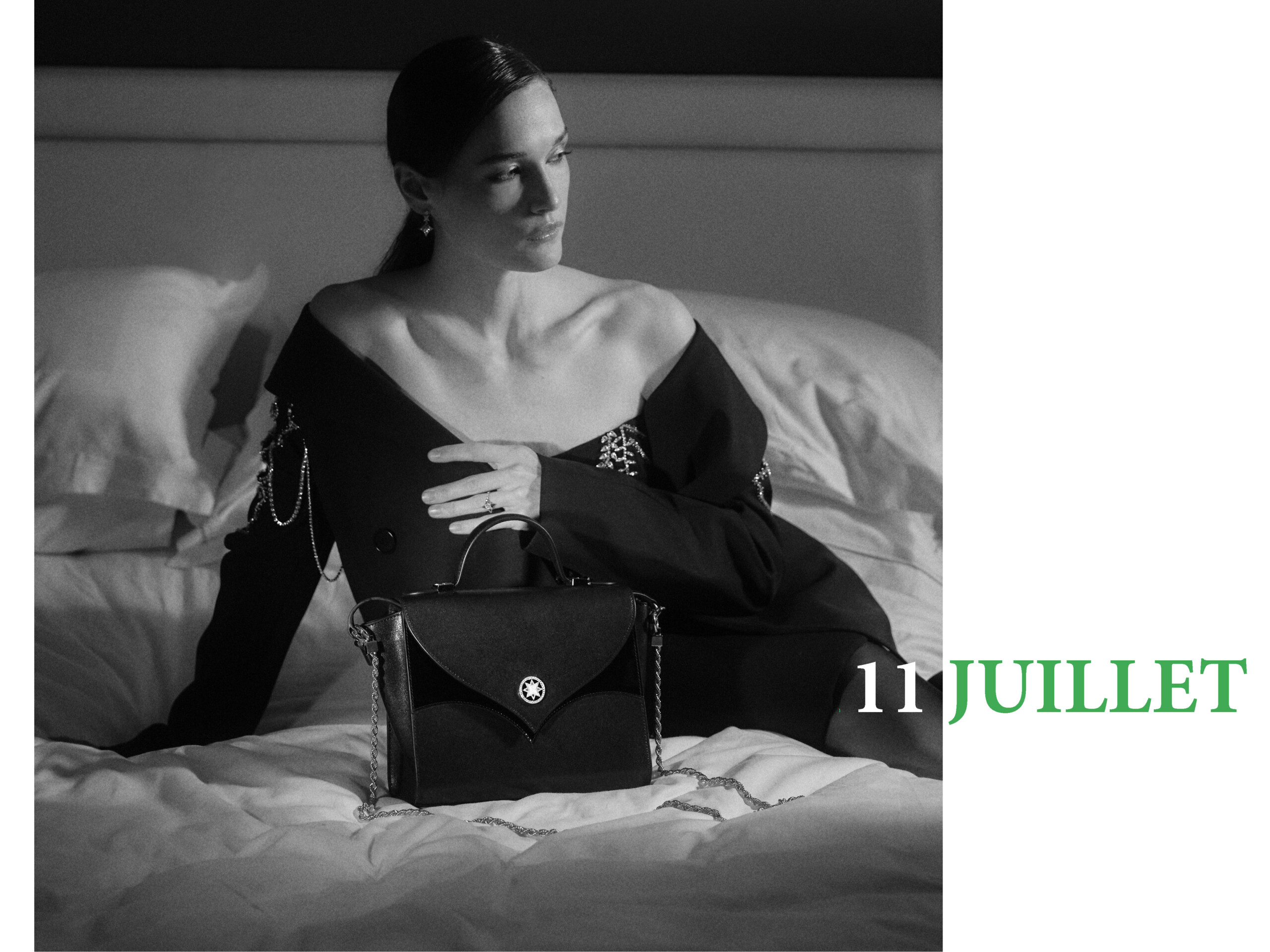We create pieces meant to be treasured for a lifetime. Our bags are made from full-grain calfskin leather and feature our signature Éclat de Joie’ emblem, crafted from malachite, mother of pearl, onyx, and ethically sourced diamonds. The emblem is available in options ranging from 2.6 to 17 carats and can be transferred from one bag to the next, allowing your 11 Juillet collection—and your connection to it—to grow.