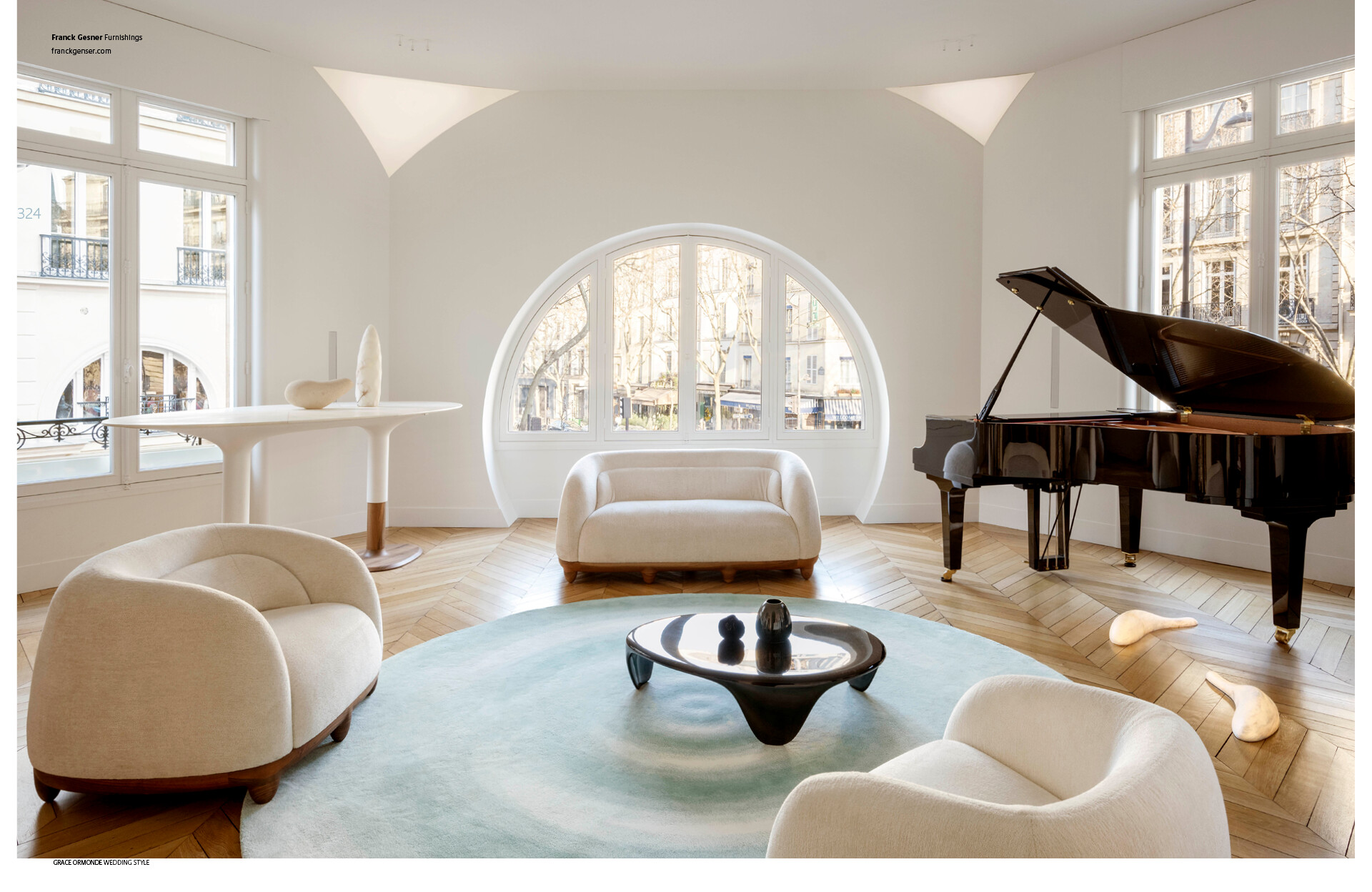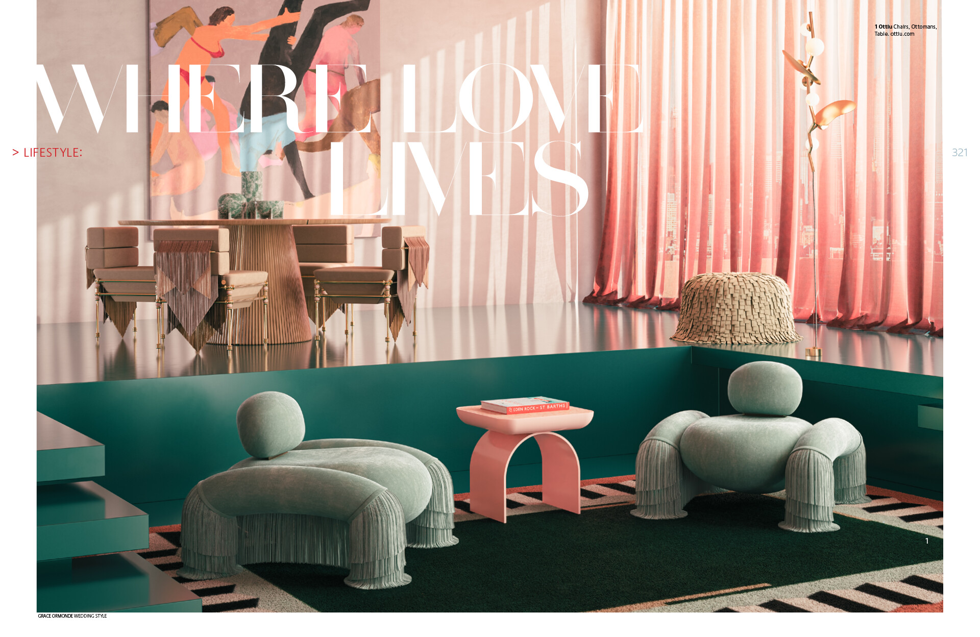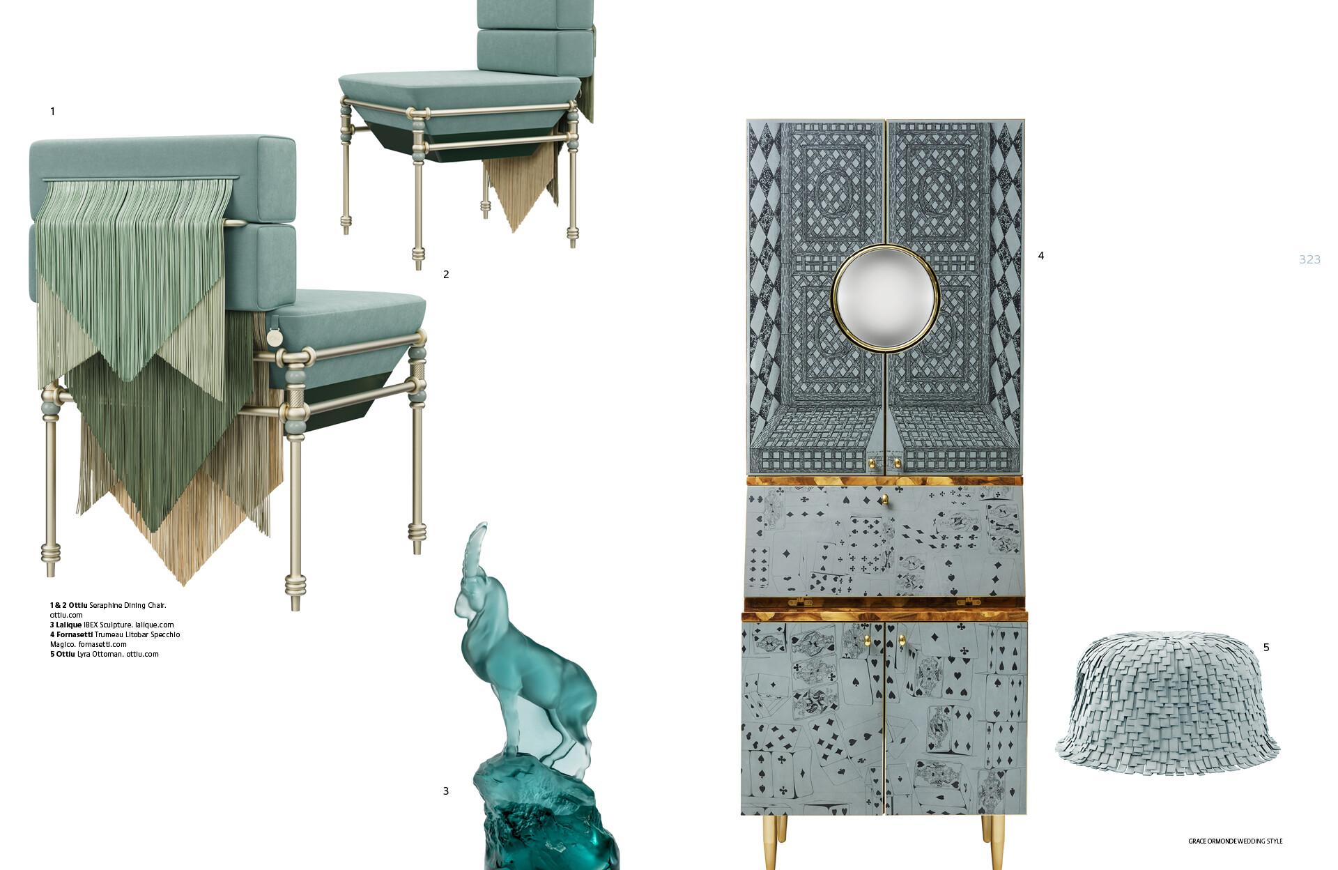 1 & 2 Ottiu Seraphine Dining Chair. 3 Lalique IBEX Sculpture. 4 Fornasetti Trumeau Litobar Specchio Magico. 5 Ottiu Lyra Ottoman.