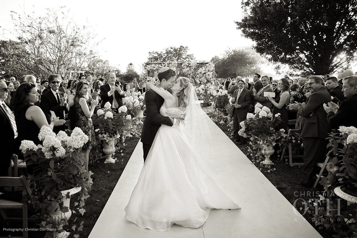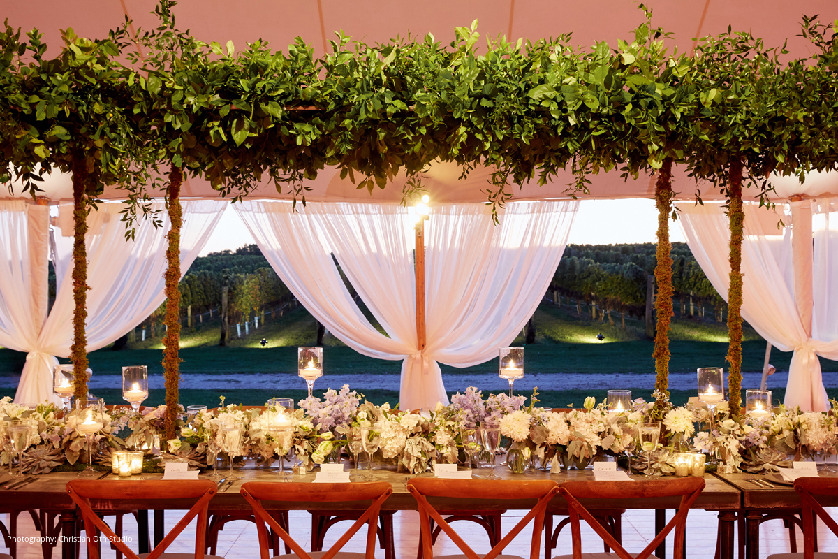 The wedding décor carried out a consistent theme of blue – both, the bride and groom’s favorite color. White hydrangeas and whimsical branches also formed a beautiful chuppah for the ceremony, surrounding guests with what looked like a scene from a fairy tale. For the reception, centerpieces were designed with a mixture of greenery, white, and blue flowers. The lighting was also wrapped in moss, creating the effect of bringing the outside vineyard into the wedding tent.