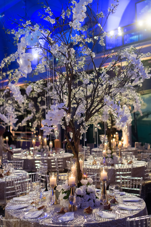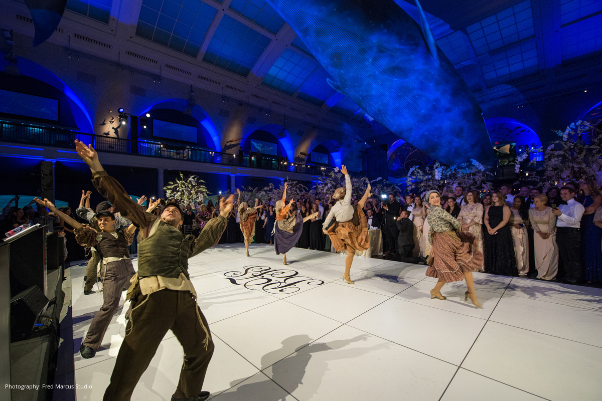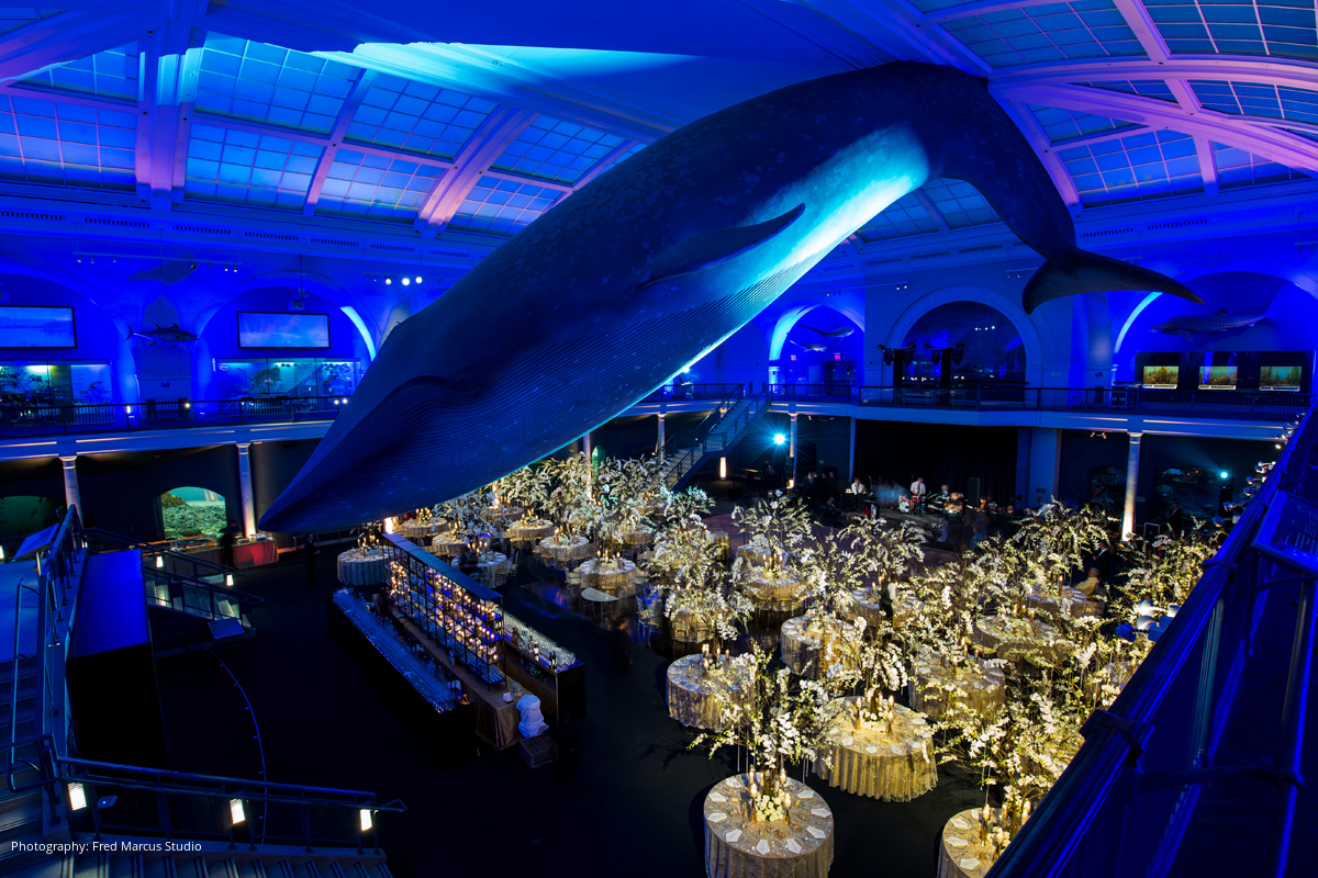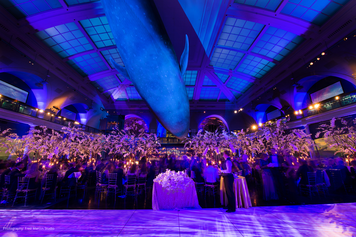 The ceremony was followed by a black-tie reception at the American Museum of Natural History, where the iconic Hall of Ocean Life was transformed into Bess and Sim’s vision of an enchanted forest hidden under the sea. Dinner included a “Sea Course” and a “Land Course,” and guests dined and danced all night under the museum’s famous 94-foot blue whale.