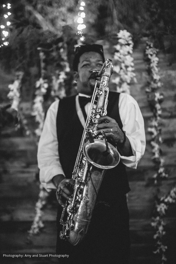 On their wedding day, neither the bride nor groom had a care in the world; they were simply taking in and savoring the whirlwind experience. “Seeing both sides of our families and all our friends together, ready to celebrate our love, built an amazing energy that filled the whole area,” says the bride. “We had a very rustic setting with very high-end finishes. The ceremony was performed on the ranch in front of a horse run, with a giraffe and peacock in the background.