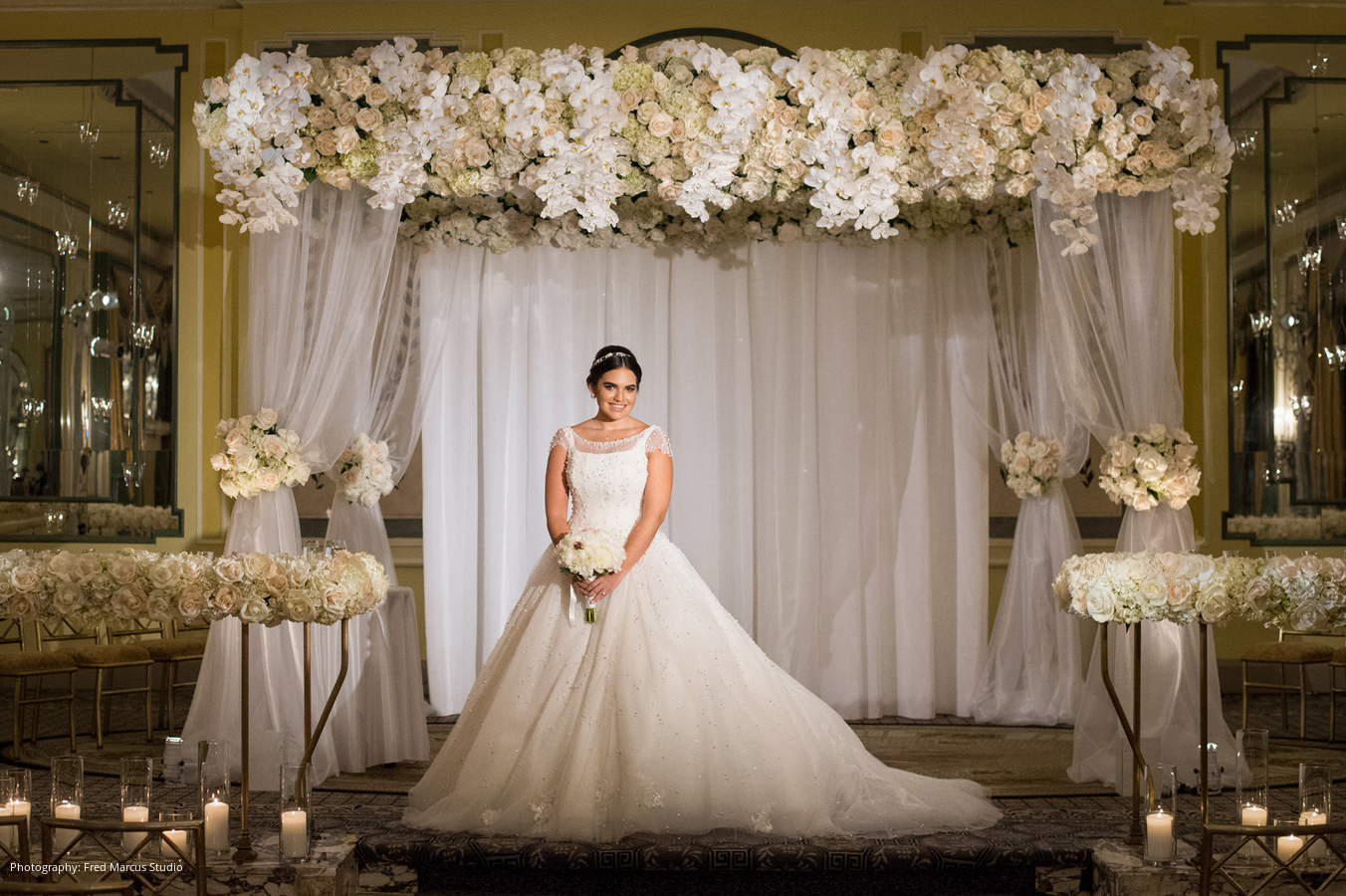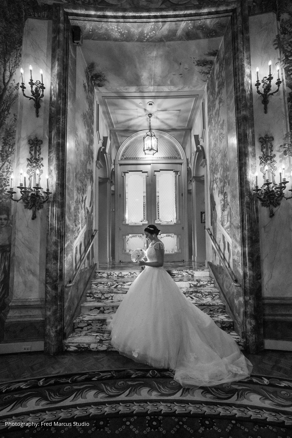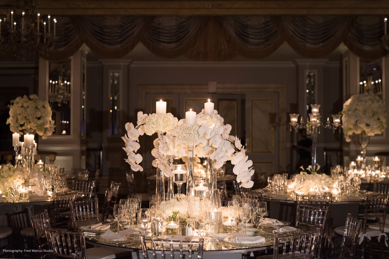 Location: The Pierre Hotel, New York, NY; Floral Design, Linen and Rentals: Atlas Floral Decorators, New York, NY; Cake: Foremost Caterers, Moonachie, NJ; Lighting: Frost Productions, New York, NY; Wedding Dress and Veil: Ines Di Santo; Bridal Salon: Bergdorf Goodman, New York, NY; Bride’s Shoes: Rene Caovilla