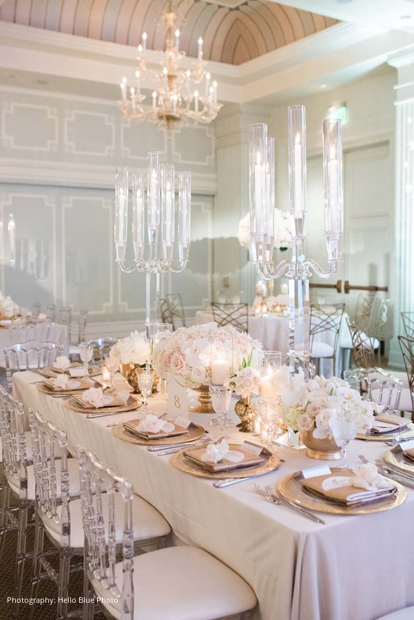 When the big day arrived, guests gathered together for a beach wedding, greeted by a stunning floral arbor with flowing drapes and a gorgeous chandelier. For the reception, the newlyweds and their loved ones were surrounded by an elegant, romantic, and luxurious ambiance complete with flowers, delicious food, candelabras, chandeliers, and a DJ who inspired everyone to dance the night away.