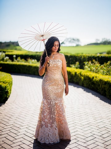 When they stopped for a wine and cheese picnic at the Exposition Park Rose Garden, where they hung out during their USC days, Sonny presented Megha with the final photo reel. The last photo was of him on one knee, holding a ring. “After seeing the last picture, she looked up and I proposed,” Sonny says. “I had our parents meet us for a quick photo shoot, then we went out to dinner; and for her last surprise of the night, I had our friends meet us for a nightcap.”