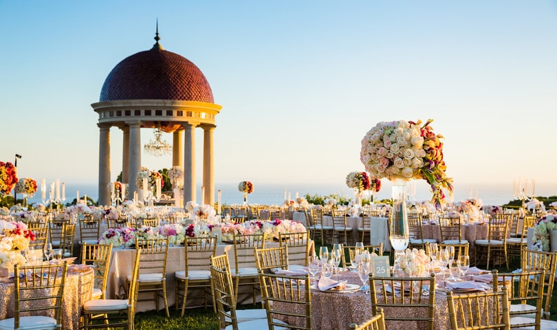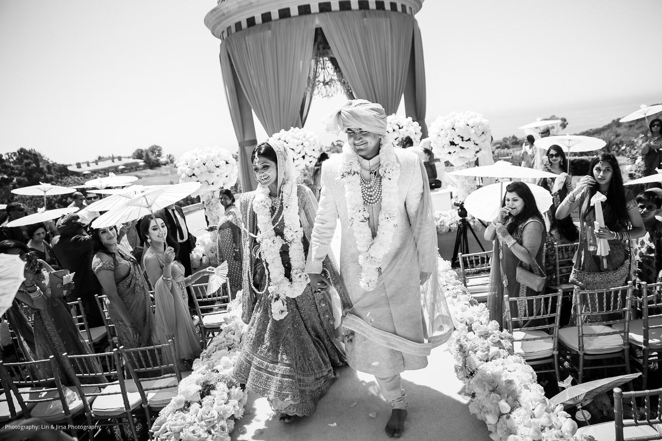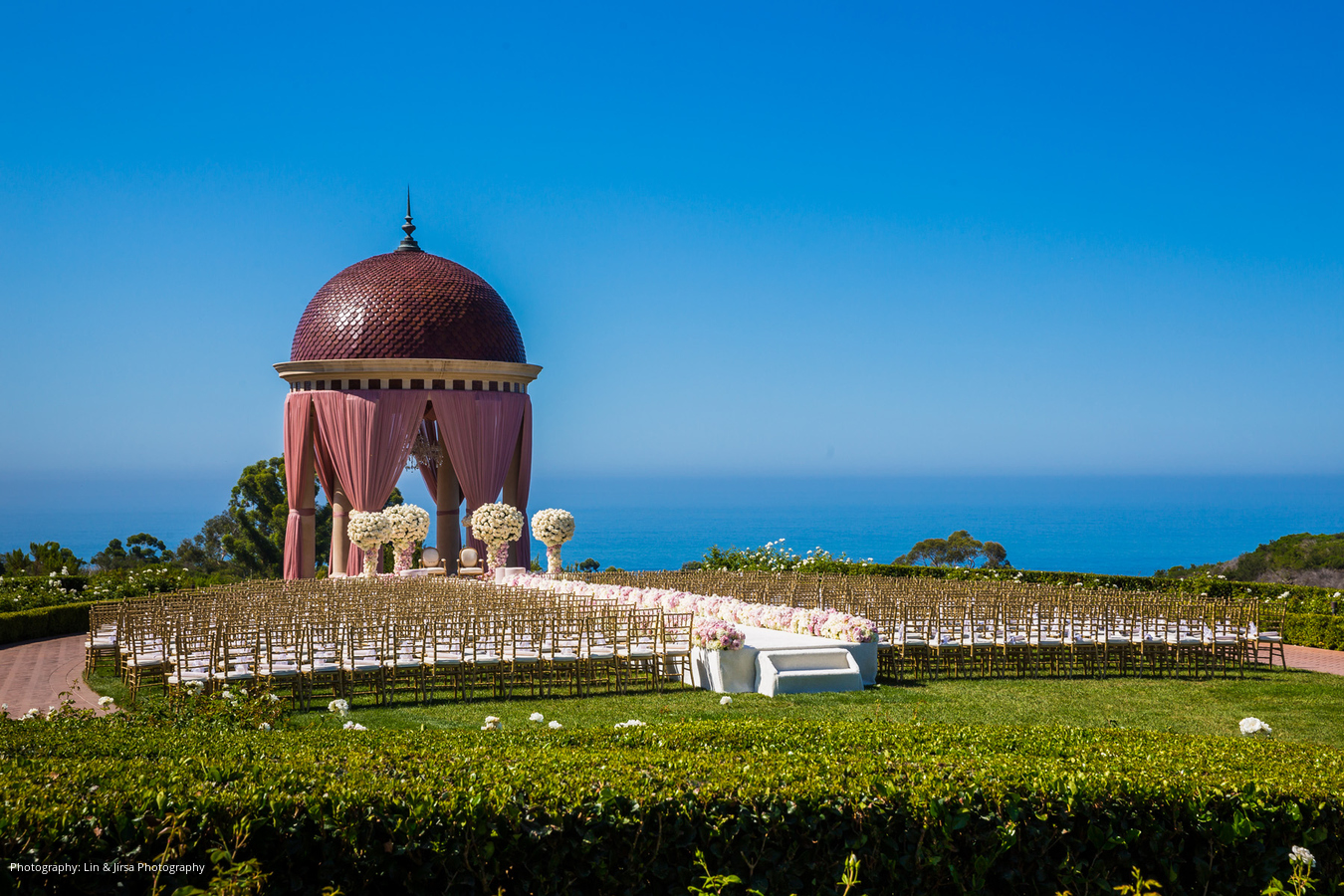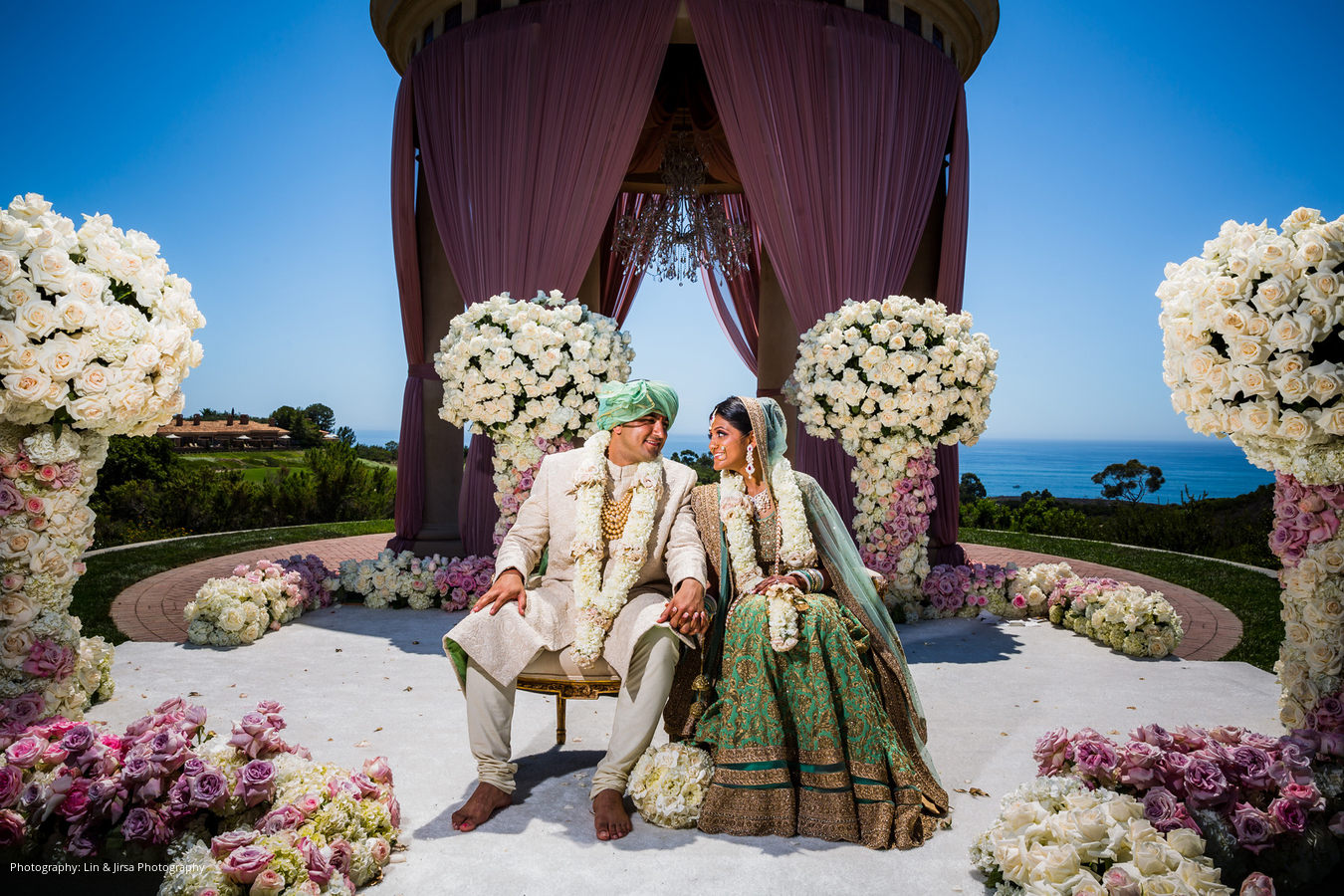 Location: The Resort at Pelican Hill Newport Coast, CA; Event Design and Planner: Allure Events Atelier, Irvine, CA; Floral Design: Butterfly Floral & Event Design, Los Angeles, CA; Linen: Luxe Linen, Irvine, CA; Linen: La Tavola Fine Linen Rental, Napa, CA; Rentals: LM Event Productions, Studio City, CA; Rentals: Revelry Event Designers, Los Angeles, CA; Draping: Always the Best Party Rentals, Anaheim, CA; Lehenga: OSAA by Adarsh; Reception Dress: Carolina Herrera; Groom’s Ceremony Attire: Sabyasachi