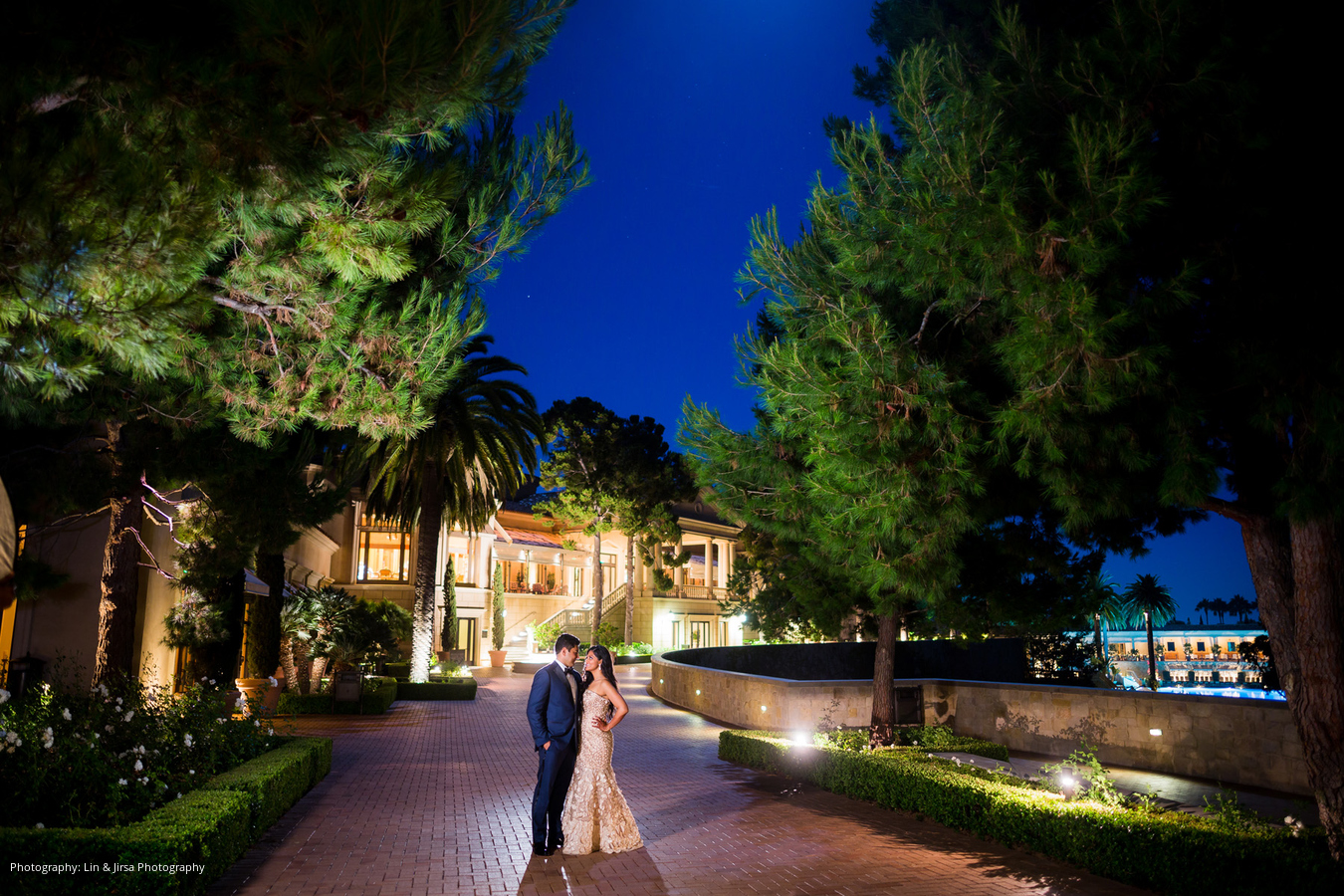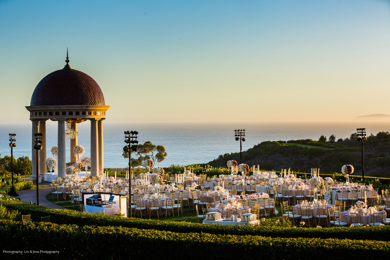 An outdoor reception was held at sunset, overlooking the ocean on the lawn at Pelican Hill. During the reception, the USC Marching Band made a special appearance and led everyone to another party indoors, where a circular bar and lounge were set up along with a DJ.