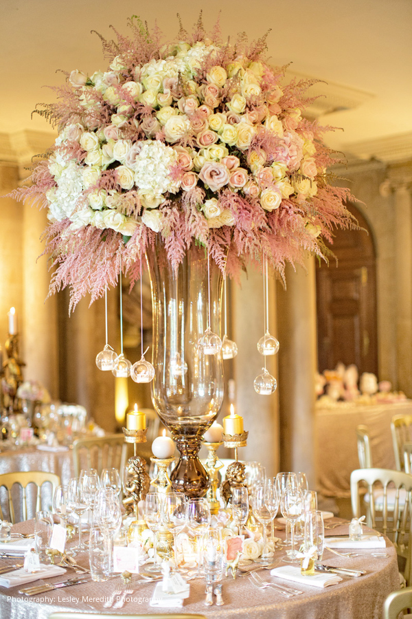 For the reception, an opulent gold and blush color palette was coordinated throughout the event space. Even the bridesmaids’ dresses matched the table linens–both, glistening in sequins. A lavish, four-foot tall floral centerpiece was the focal point of the room, and an abundance of candles illuminated the castle, creating a majestic ambiance.