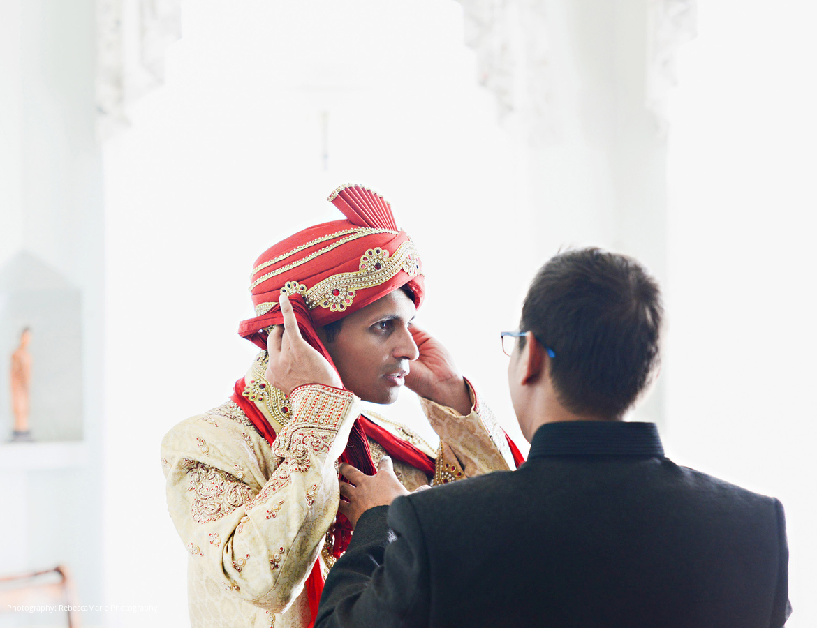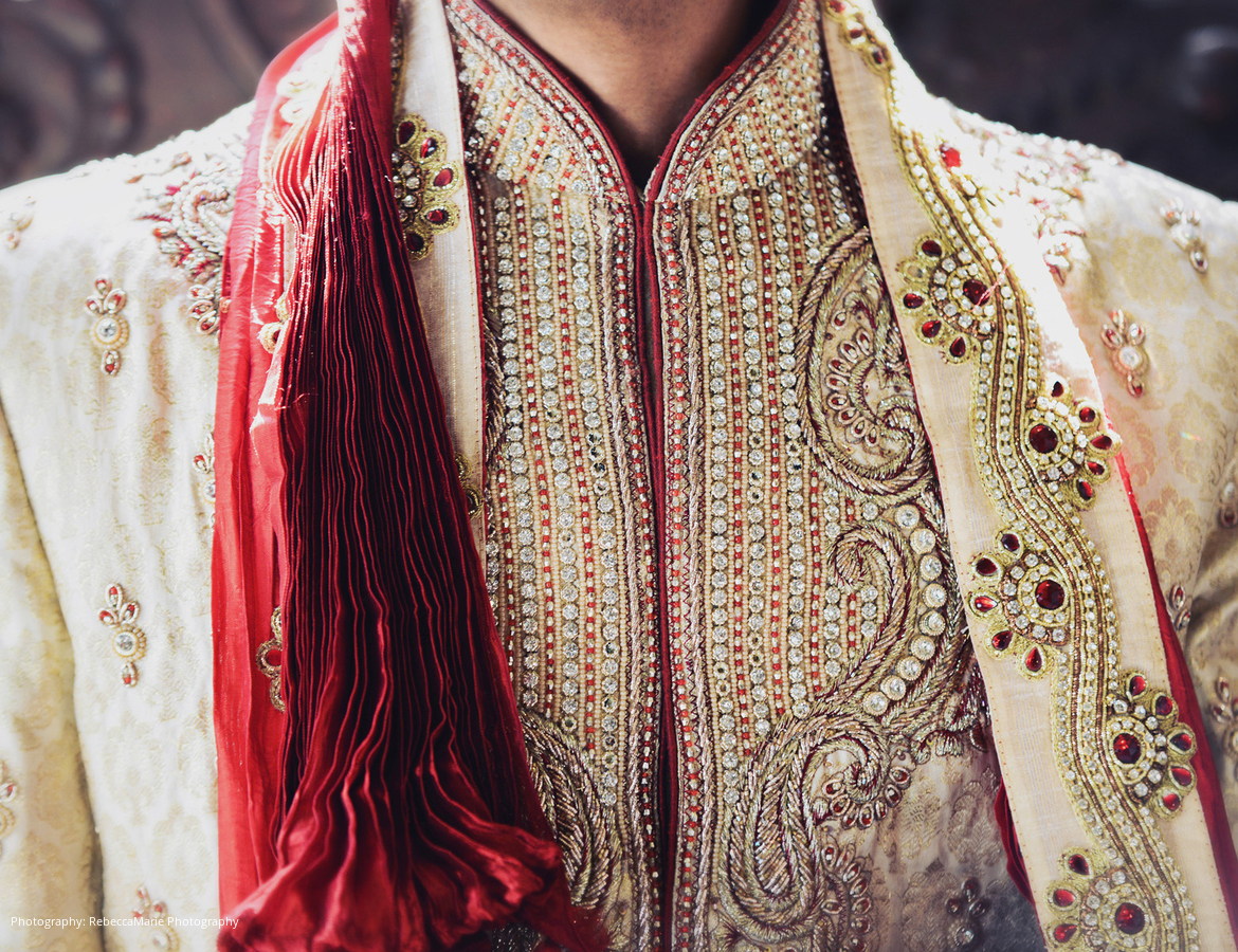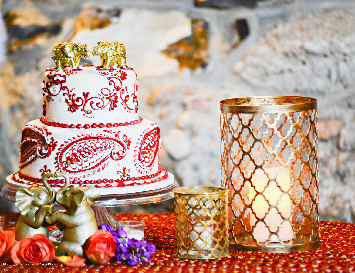 Prior to the wedding, the couple flew to India for a ring ceremony. Inspired by the bright colors she saw, Michele decided to use raspberry and orange colored linens. Pink, orange, and red flowers were selected, and the bridesmaids wore purple dresses with gold bangles. Guests were also given little elephant party favors with their trunks up, symbolizing good luck.