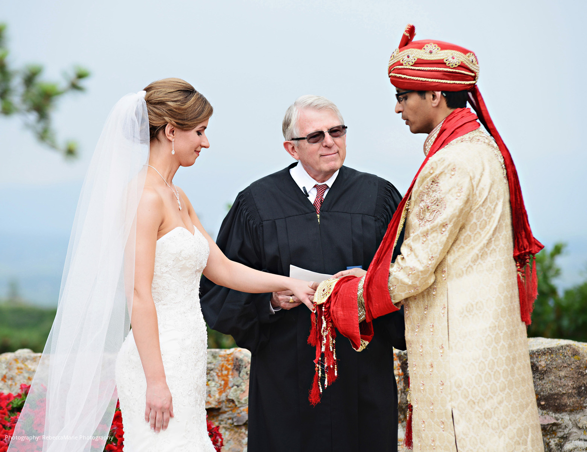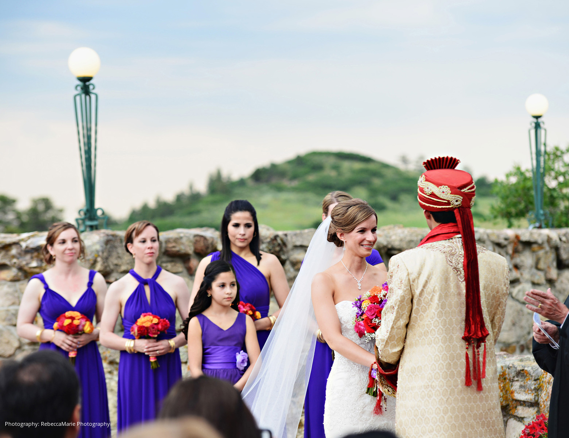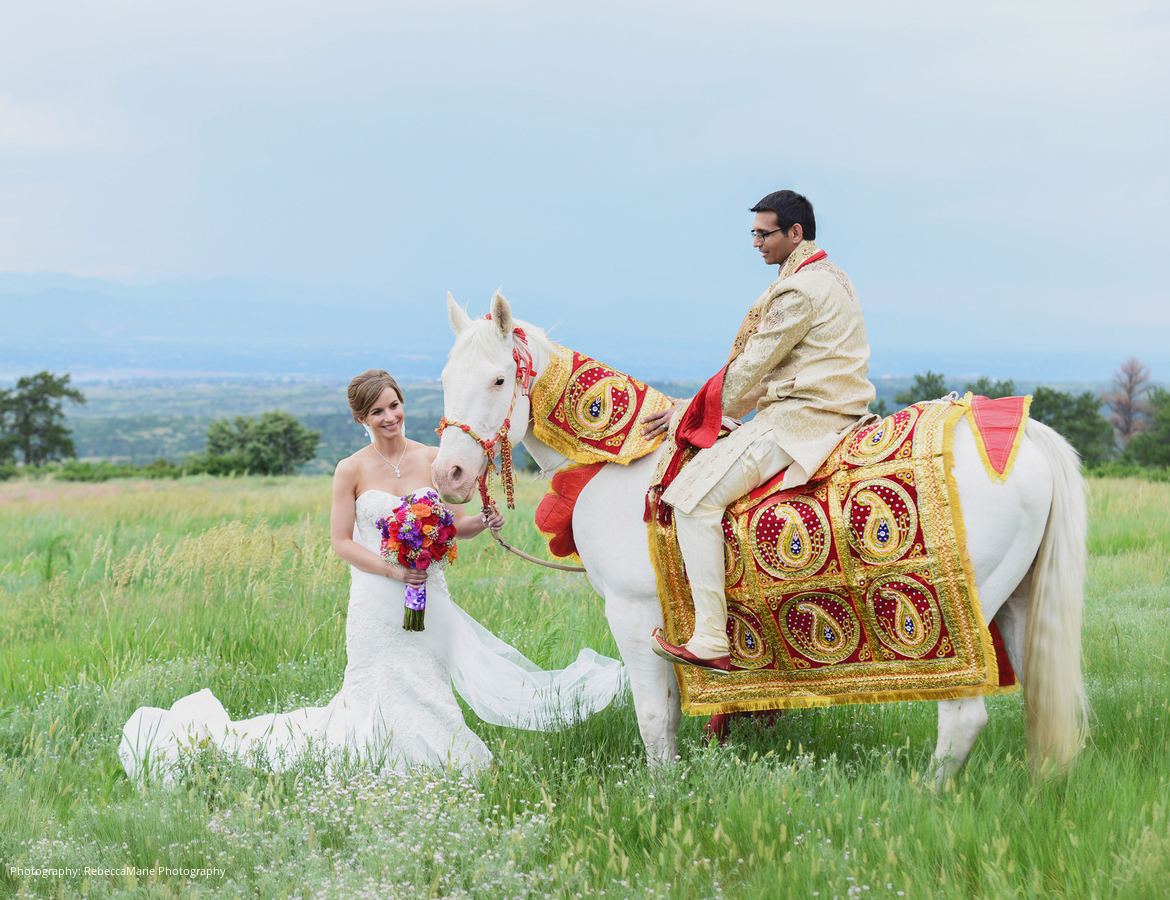 Despite some initial anxiety concerning Colorado’s unpredictable summer rainfalls, the bride and groom were elated by the time the ceremony started. “We wanted the wedding to reflect us as a couple, and we wanted to embrace our union of two different cultures,” the bride describes. The groom wore Indian clothes and arrived on a horse with a baraat, while the bride wore a traditional American wedding dress and walked down the aisle with her father.