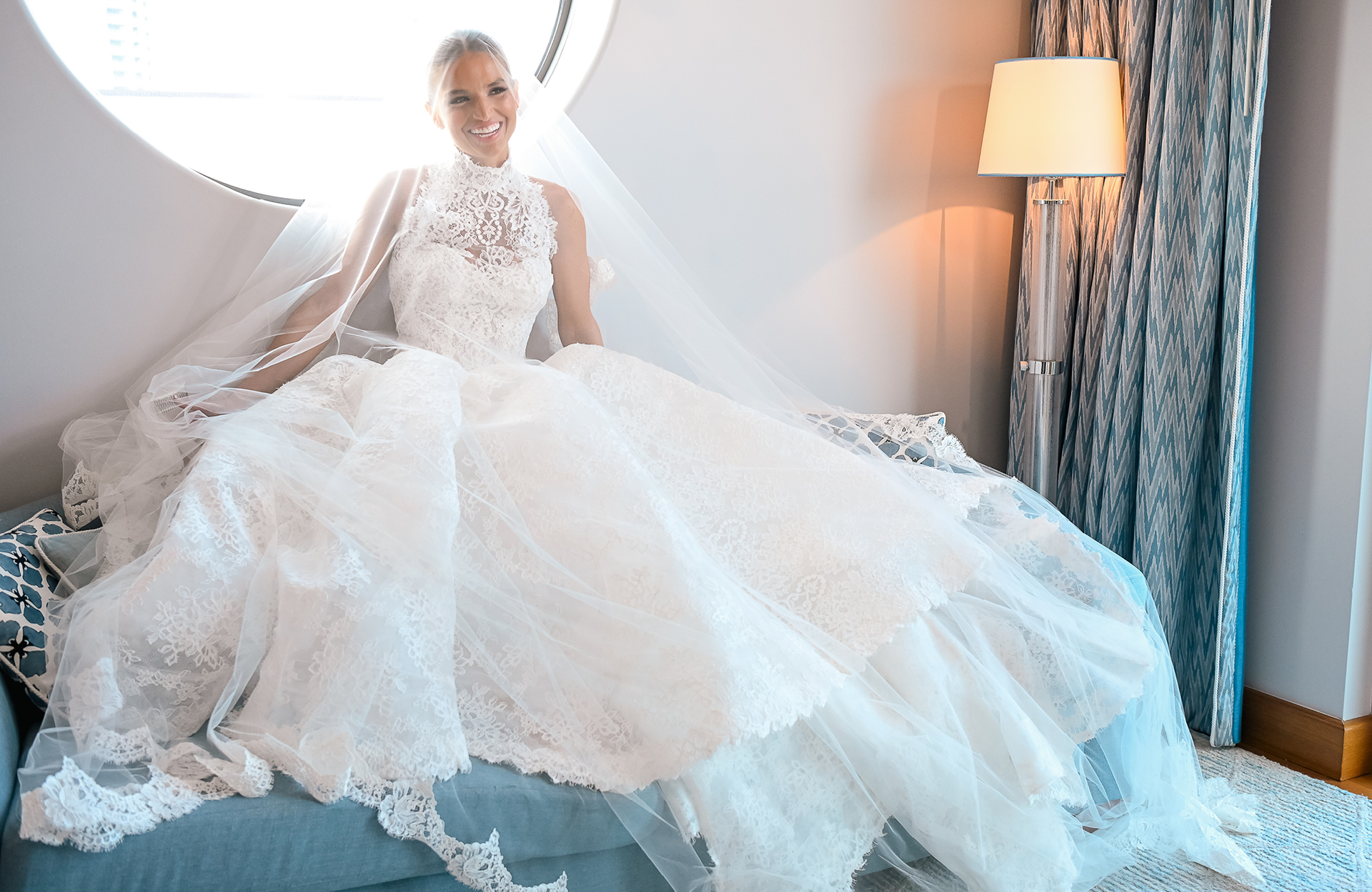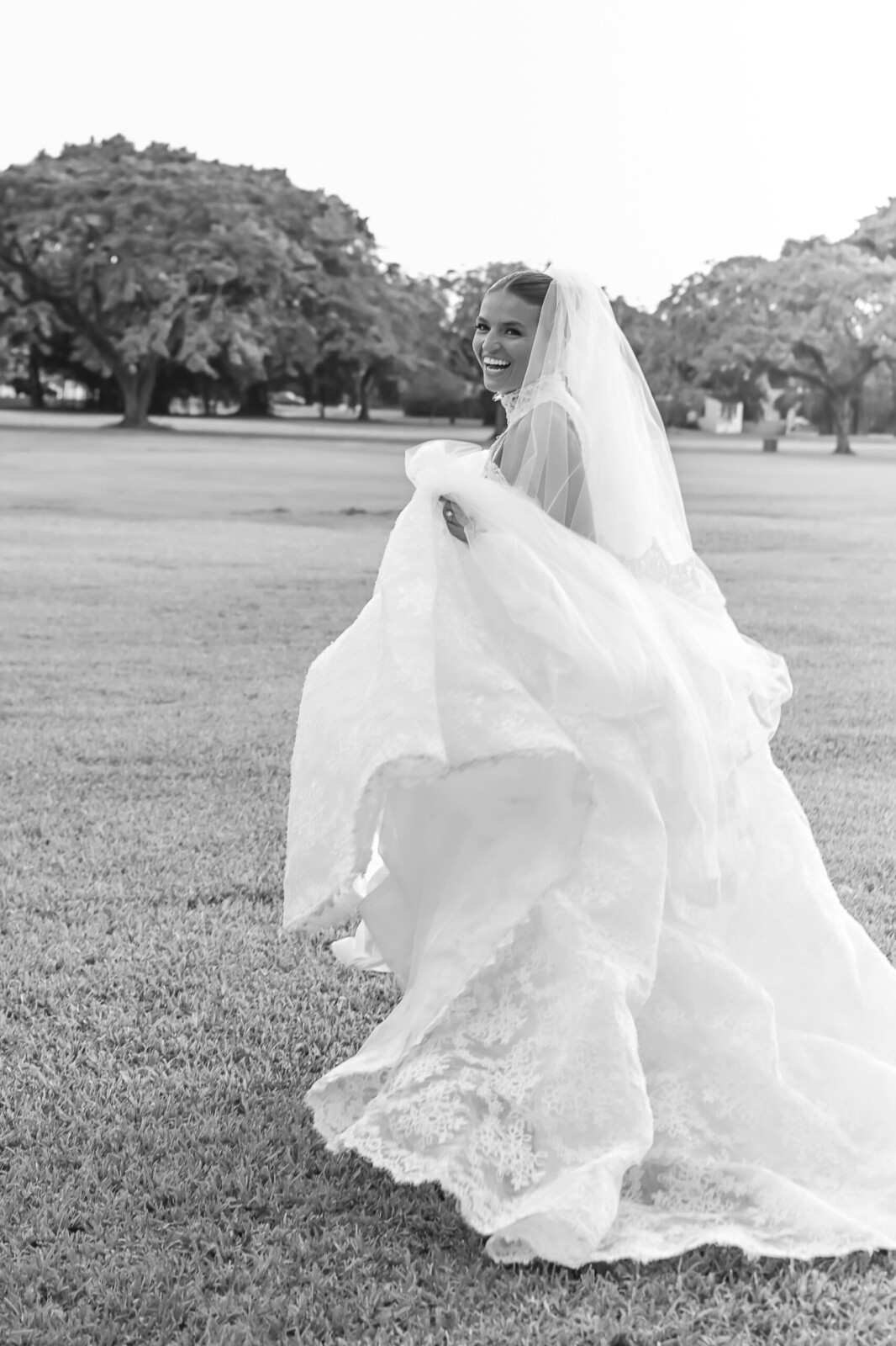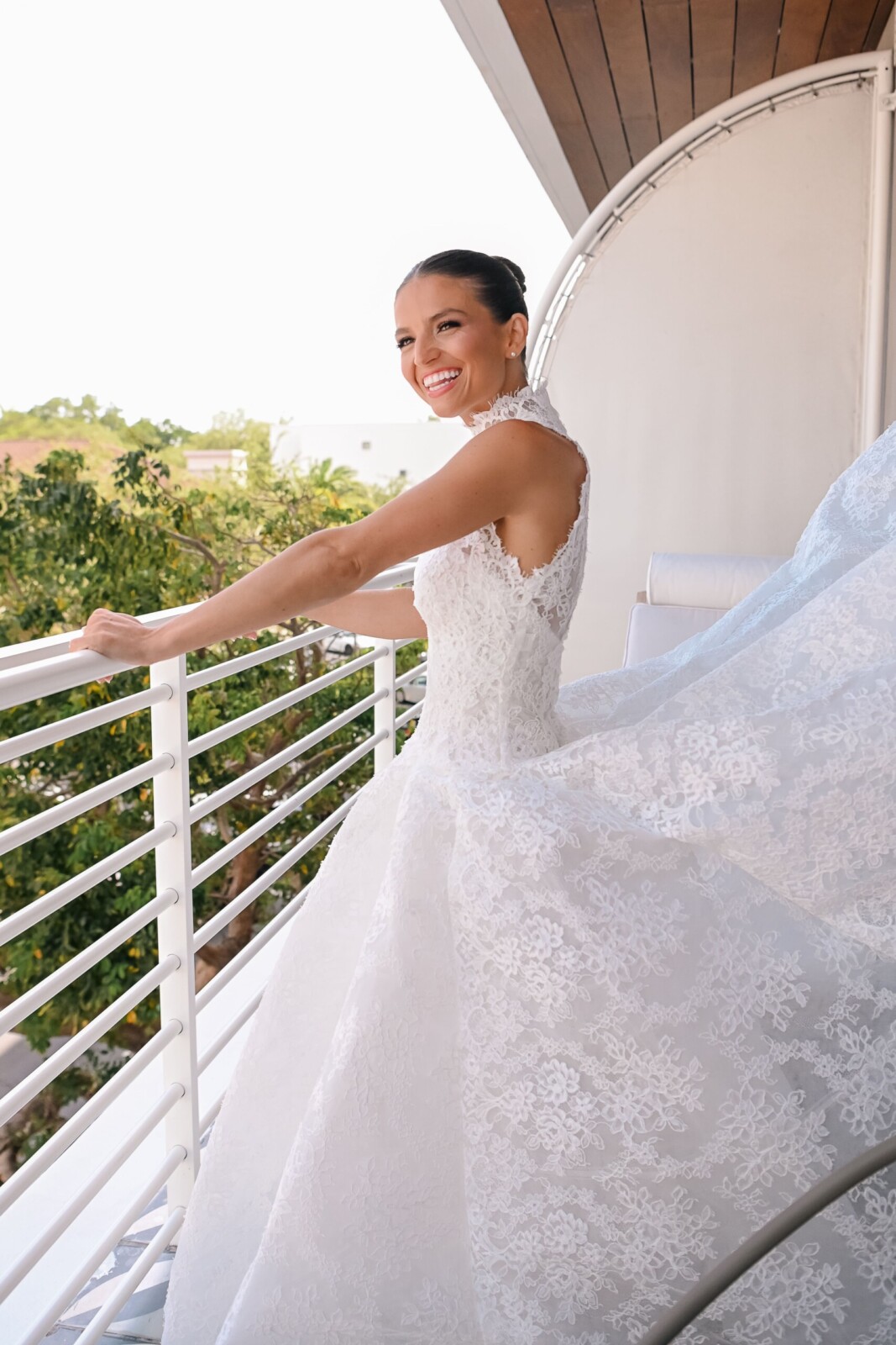 When the big day arrived, the bride was dressed in the “Vittoria” wedding gown by Monique Lhuillier, along with the Vittoria Halter Jacket and a Dior mantilla veil—all, purchased at Chic Parisien in Coral Gables. Her look was completed by a pair of simple Prada ballet flats, which she chose solely with the dance floor in mind. The groom wore a Ralph Lauren Purple Label dinner jacket, inspired by James Bond.