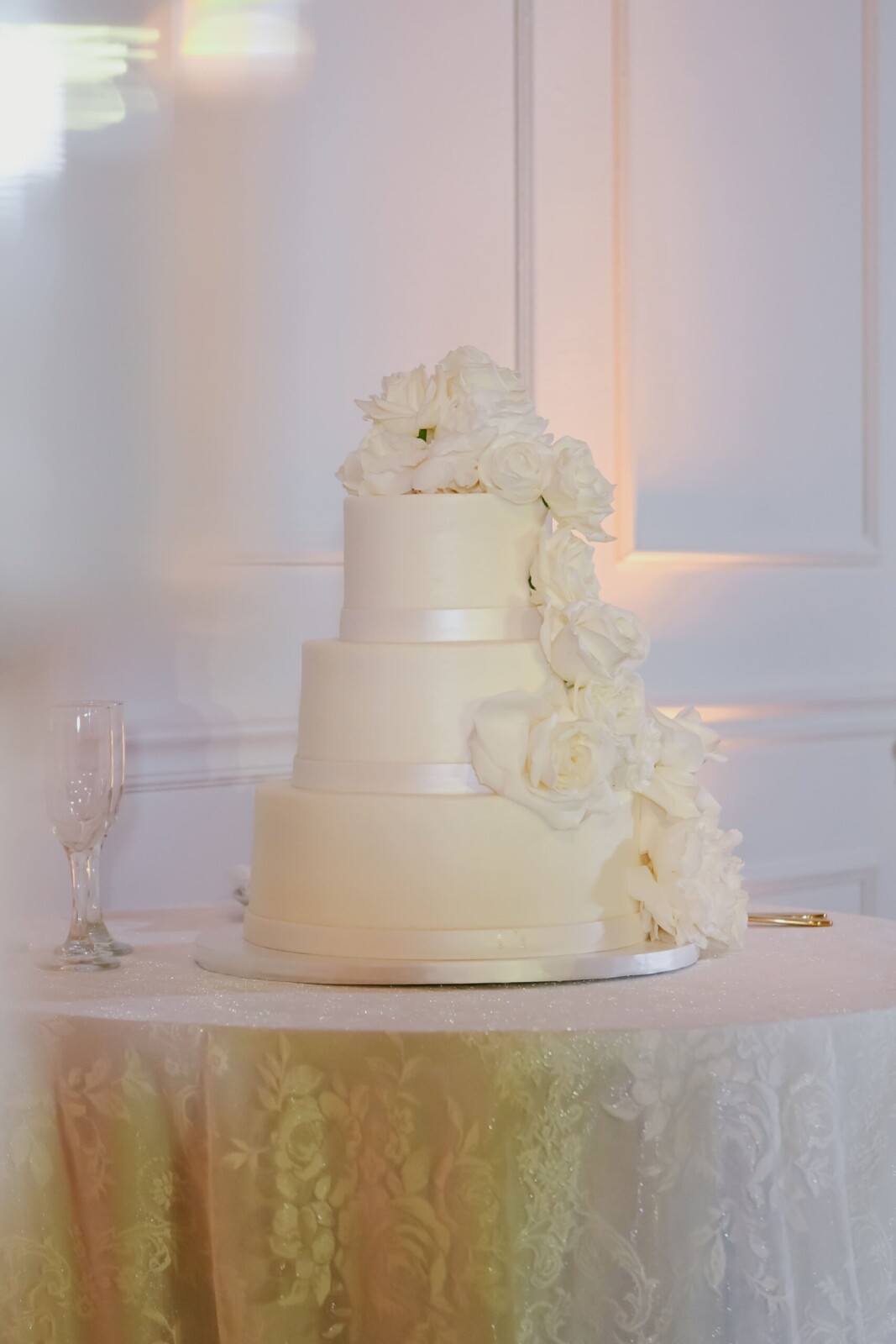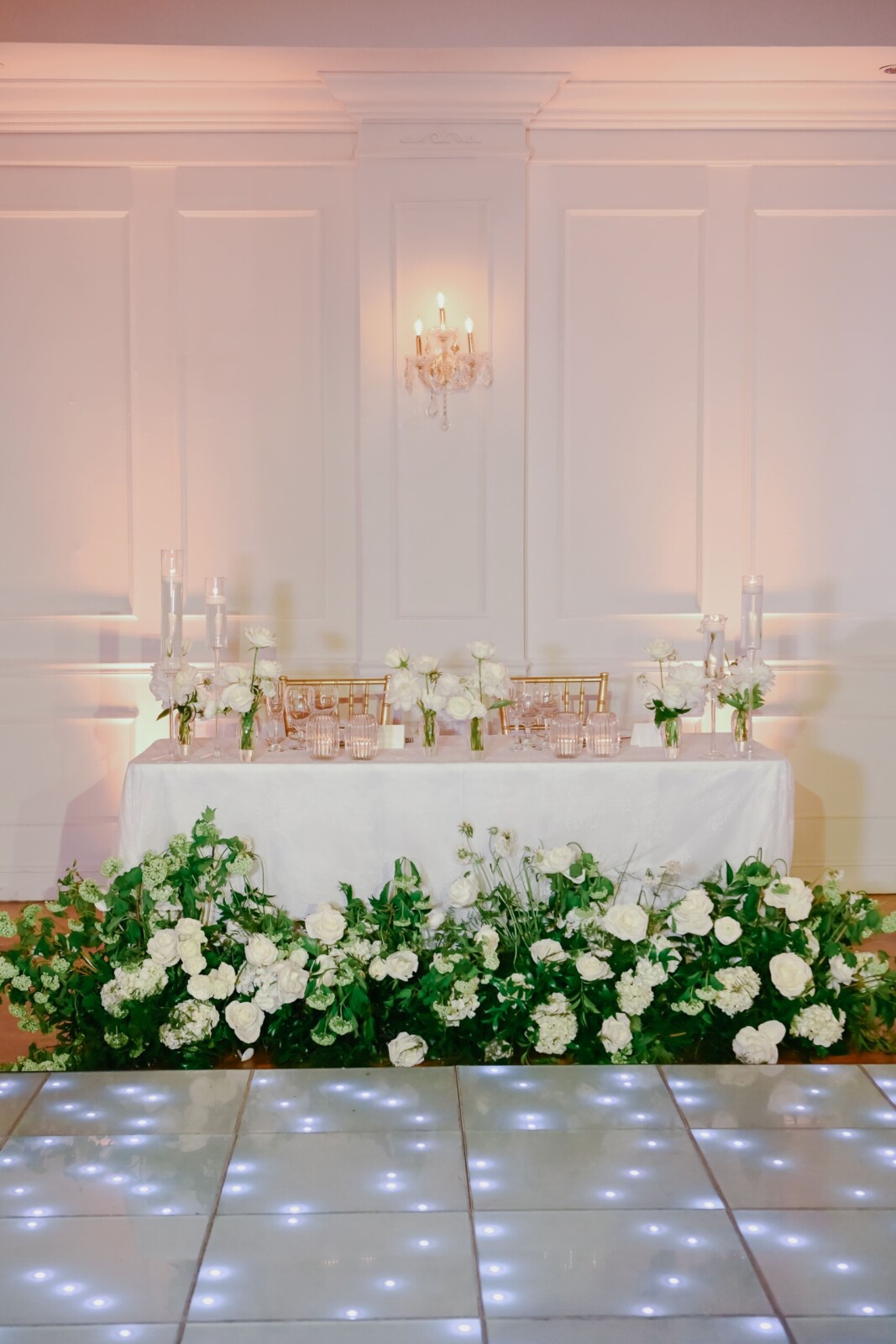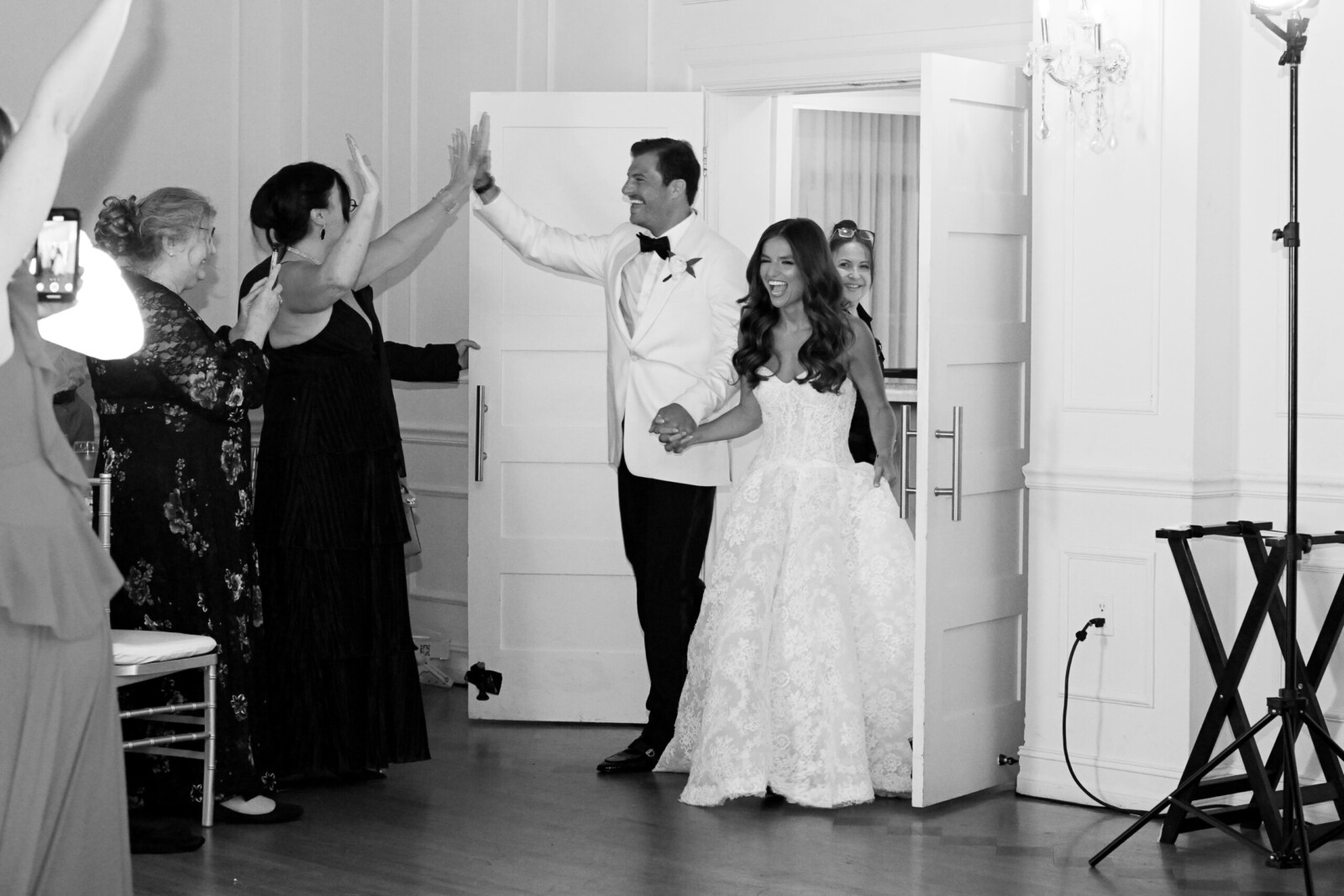 When the big day arrived, the bride was dressed in the “Vittoria” wedding gown by Monique Lhuillier, along with the Vittoria Halter Jacket and a Dior mantilla veil—all, purchased at Chic Parisien in Coral Gables. Her look was completed by a pair of simple Prada ballet flats, which she chose solely with the dance floor in mind. The groom wore a Ralph Lauren Purple Label dinner jacket, inspired by James Bond.