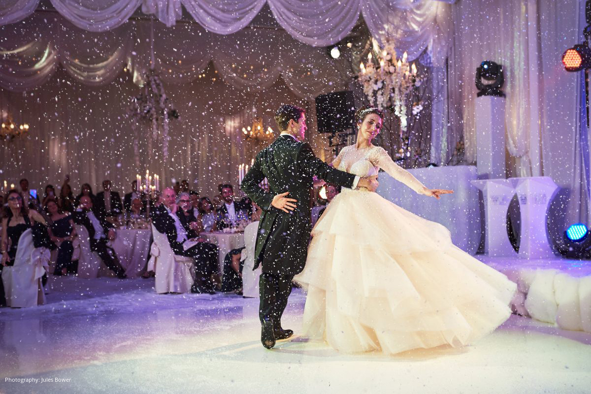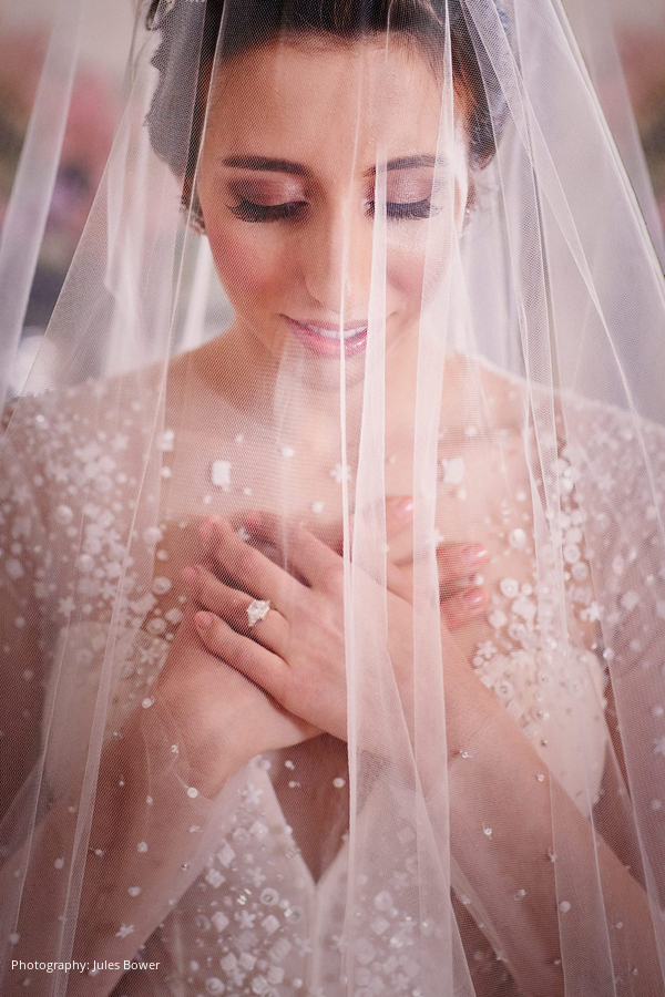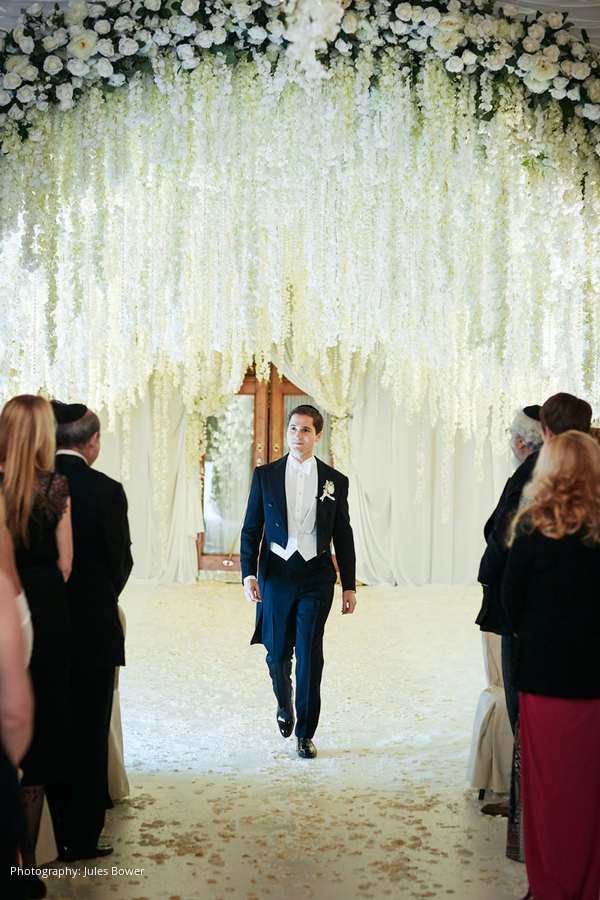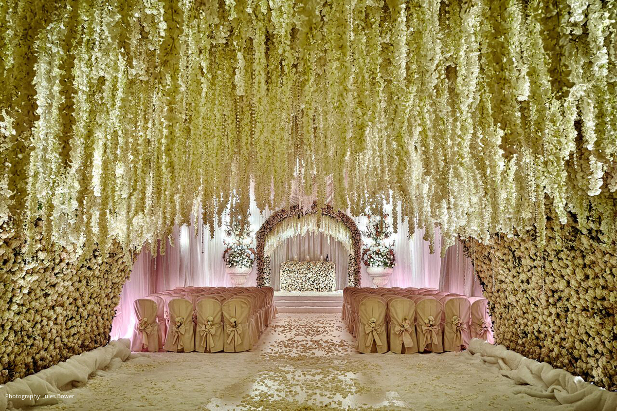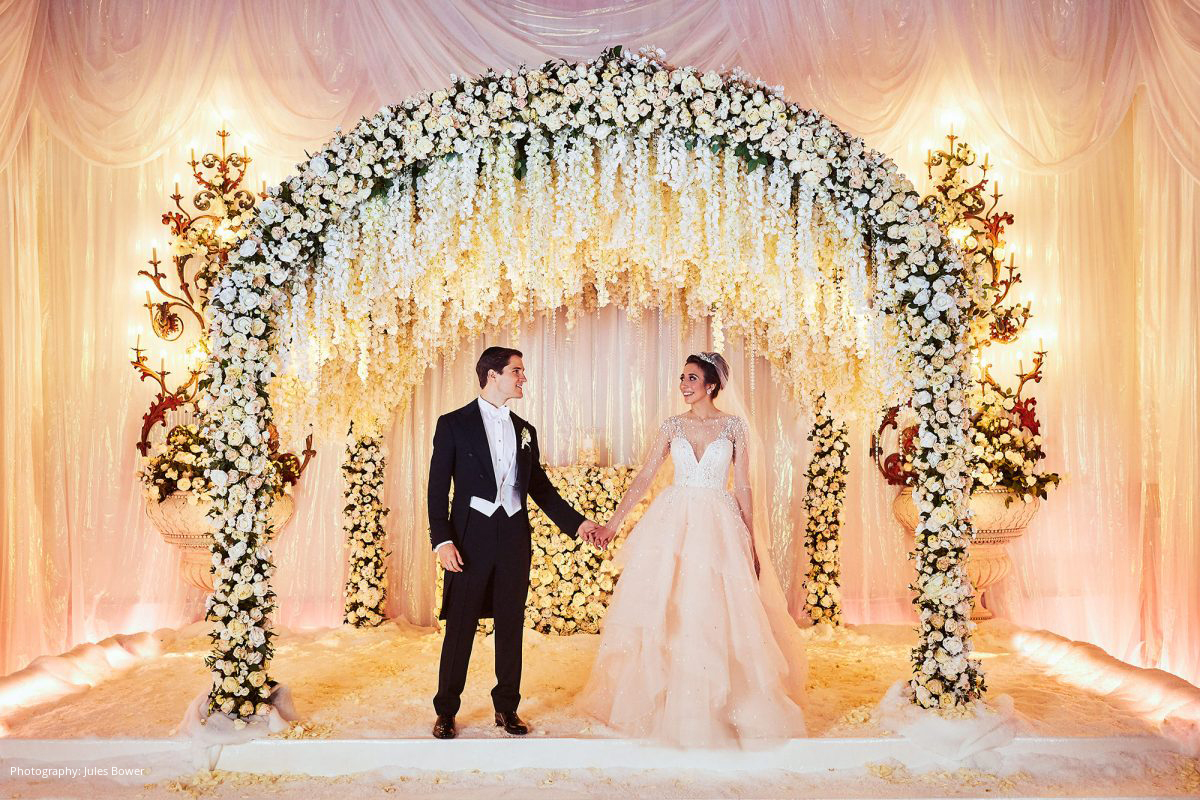 On the night of the wedding, guests were in awe as they entered an enchanting flower tunnel flowing with fresh orchids and roses while being escorted to their ceremony seats. The bride wore a blush wedding gown by Monique Lhuillier, the groom donned a custom Ralph Lauren white tie tuxedo, and both vowed “to create a home together filled with learning, laughter, happiness, and love. Opera singers Jonathan Morales and Jeannivee Fiorese performed Andrea Bocelli’s “Con Te Partiro” alongside a string quartet during the processional, completing the magical ambiance.
