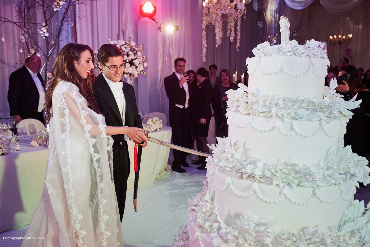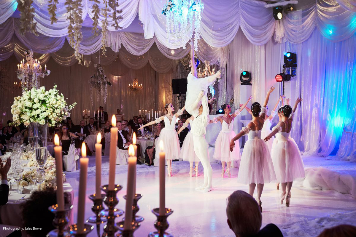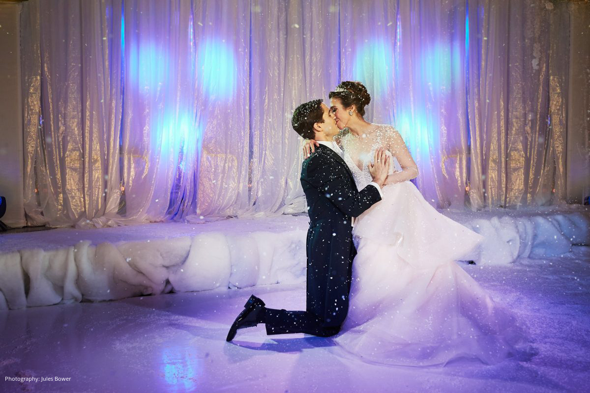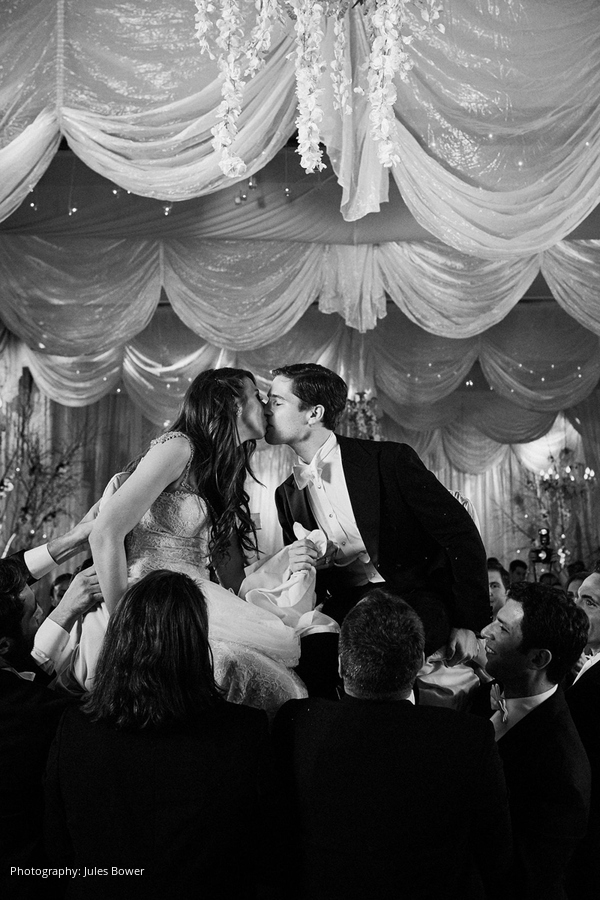 On the night of the wedding, guests were in awe as they entered an enchanting flower tunnel flowing with fresh orchids and roses while being escorted to their ceremony seats. The bride wore a blush wedding gown by Monique Lhuillier, the groom donned a custom Ralph Lauren white tie tuxedo, and both vowed “to create a home together filled with learning, laughter, happiness, and love. Opera singers Jonathan Morales and Jeannivee Fiorese performed Andrea Bocelli’s “Con Te Partiro” alongside a string quartet during the processional, completing the magical ambiance.