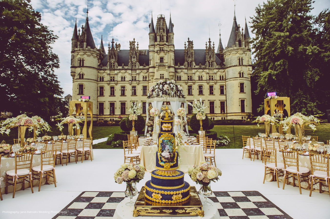 Location and Cake: Chateau de Challain Challain-la-Potherie, France; Wedding Dress, Headpiece and Earrings: Ines Di Santo, Bride’s Shoes: Jimmy Choo, Groom’s Attire: Gotstyle; Hair & Makeup: Louisa Liao, Cinematography: Agi Studio, Toronto, ON, Canada