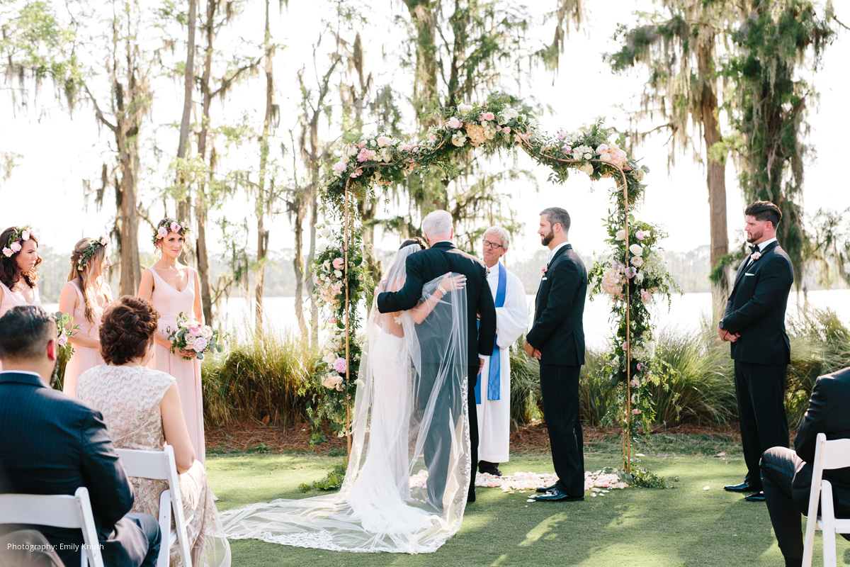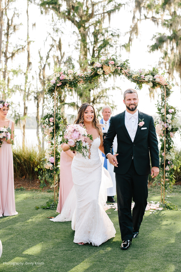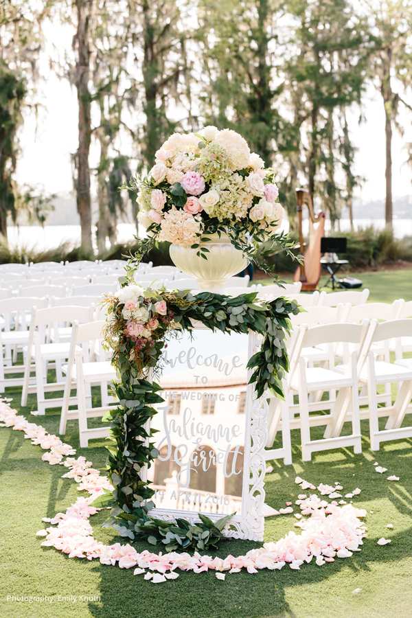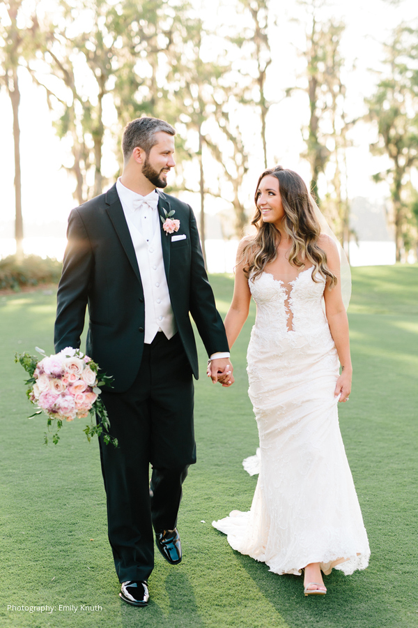 When it came time to propose, Garrett had carefully planned out a beautifully crafted engagement with Julie’s family. When the engagement ring arrived, however, he was too excited to wait and ended up popping the question sooner than expected. One evening, the couple went to dinner in Winter Park, Florida, where they walked the streets lit up with white string lights. Julie thought they were just enjoying a lovely evening for dinner until they came upon music, flowers, and a photographer waiting on the sidewalk. It was a perfect moment when she stopped and realized that Garrett was on his knee, proposing.