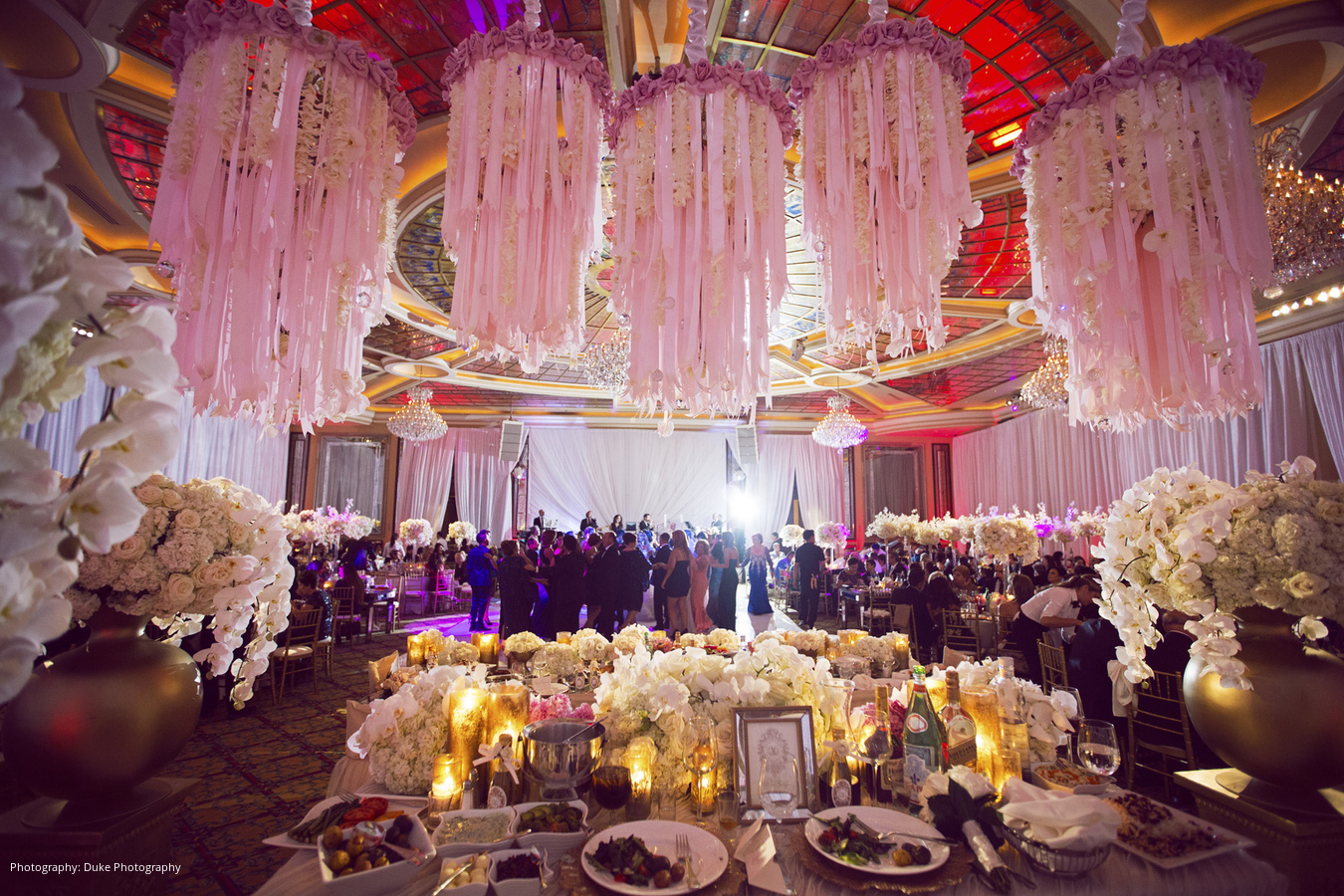 Once the ceremony concluded, everyone headed for the venue–the Taglyan Complex in Los Angeles–where the newlyweds were able to glance a sneak peak of the ballroom before anyone had entered. They were in awe of everything they saw, as the décor went above and beyond what they had originally envisioned. “It didn’t feel real to me,” says the bride. “It’s as though Fancy That! Events took every vision and style from my mind and transformed it into a reality.”