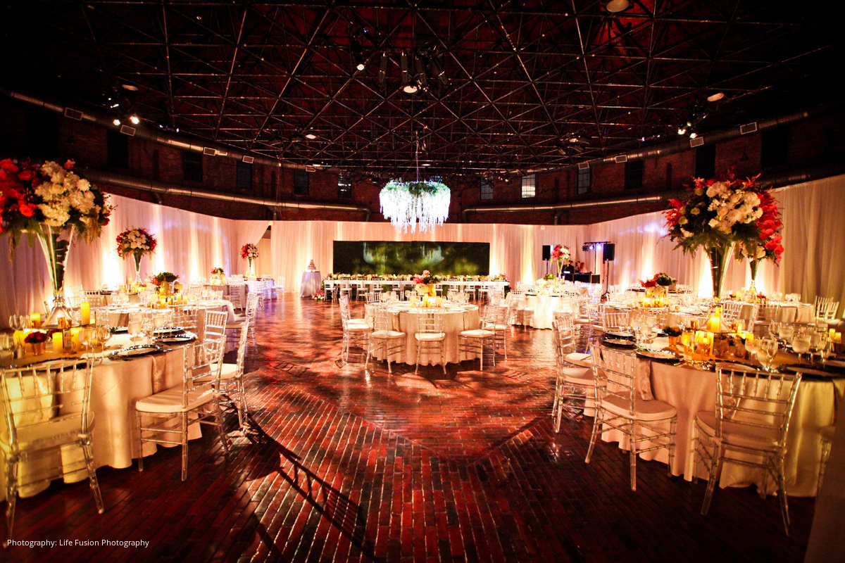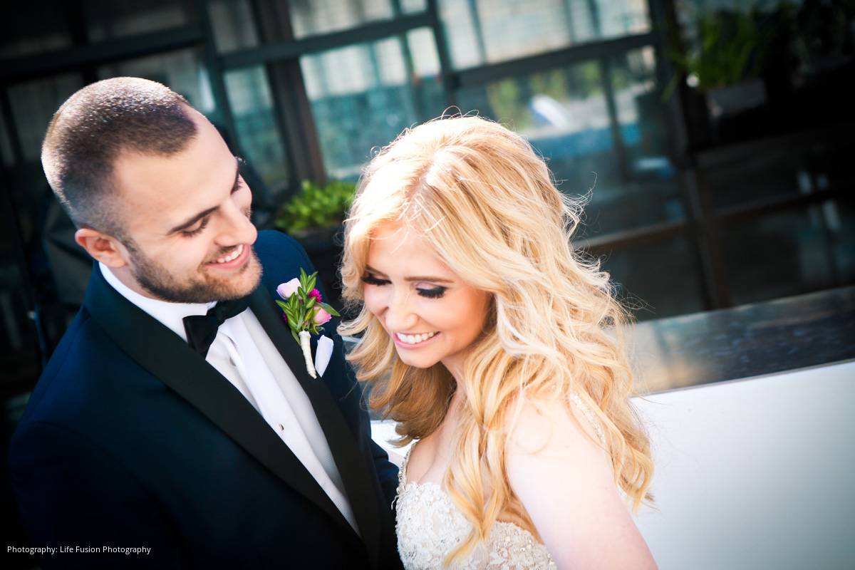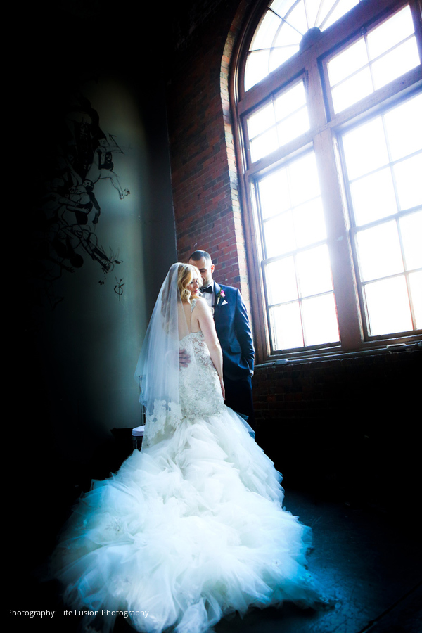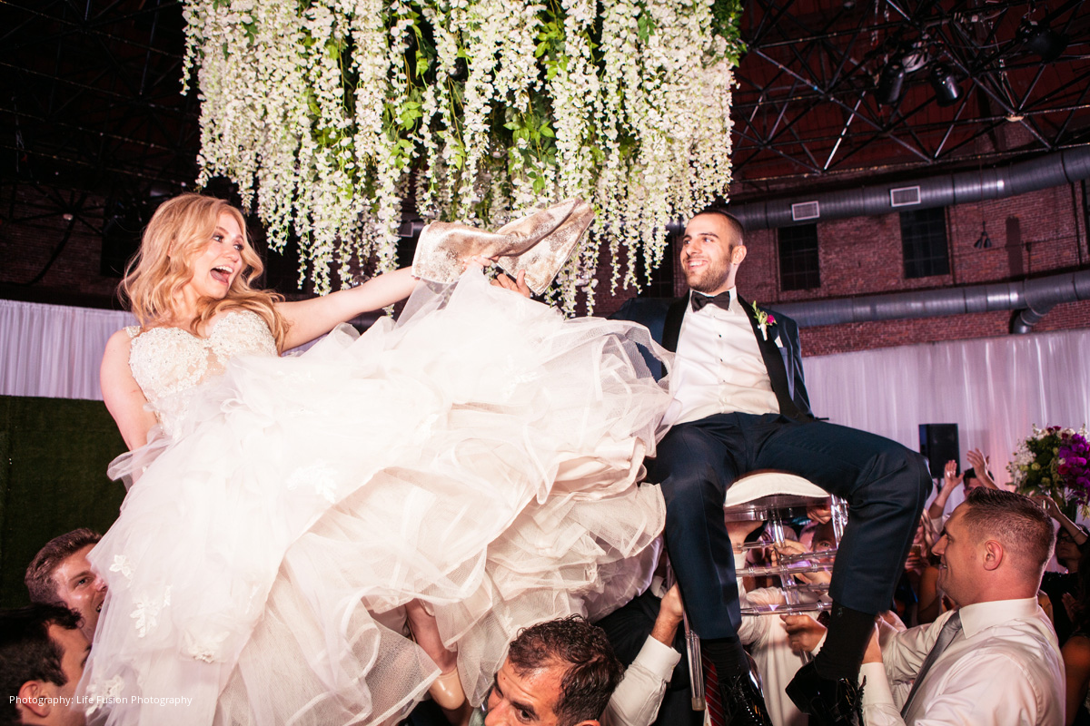 The couple’s wedding venue was an historic space with exposed brick and piping, providing the perfect blank canvas of their wedding vision – not to mention, an unexpected “industrial” element. Décor highlights included an eight-foot-wide floral chandelier suspended in front of a massive hedge wall for the ceremony backdrop. There was also a live jazz trio from NYC that performed during the ceremony and cocktail hour, playing songs that were popular during the bride and groom’s years in Australia.