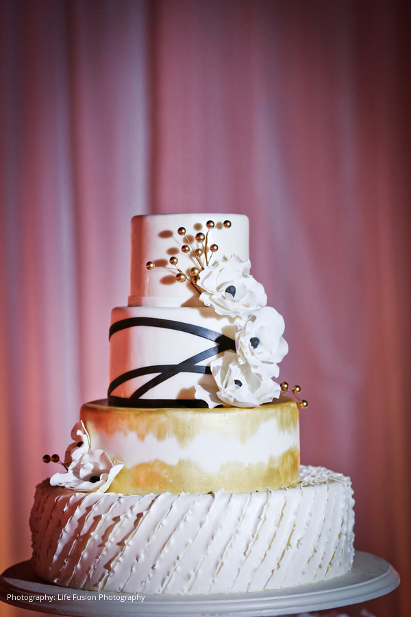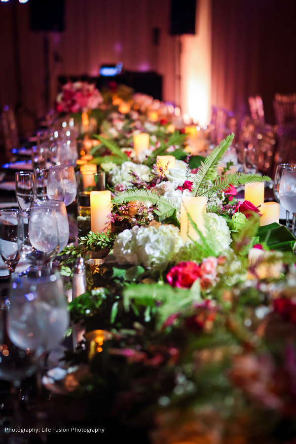 For their wedding, the couple wanted to incorporate a playful, Aussie-style vibe into the décor and ambiance. “It was really important to us that we make every detail of our wedding unique and represent our own little love story,” explains Hannah. “What our planner [Elite Events] came up with was a tropical, glam party that was just as elegant as it was fun. We used tons of lush, tropical greenery and florals that reminded us of our time in Australia. We also used lots of fun touches of fuchsia and gold painted leaves – another unexpected yet glamorous touch that was a nod to our past home.”