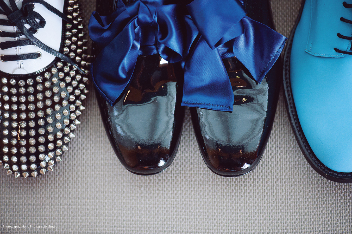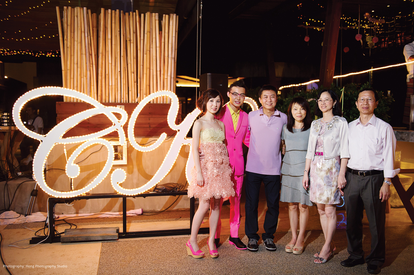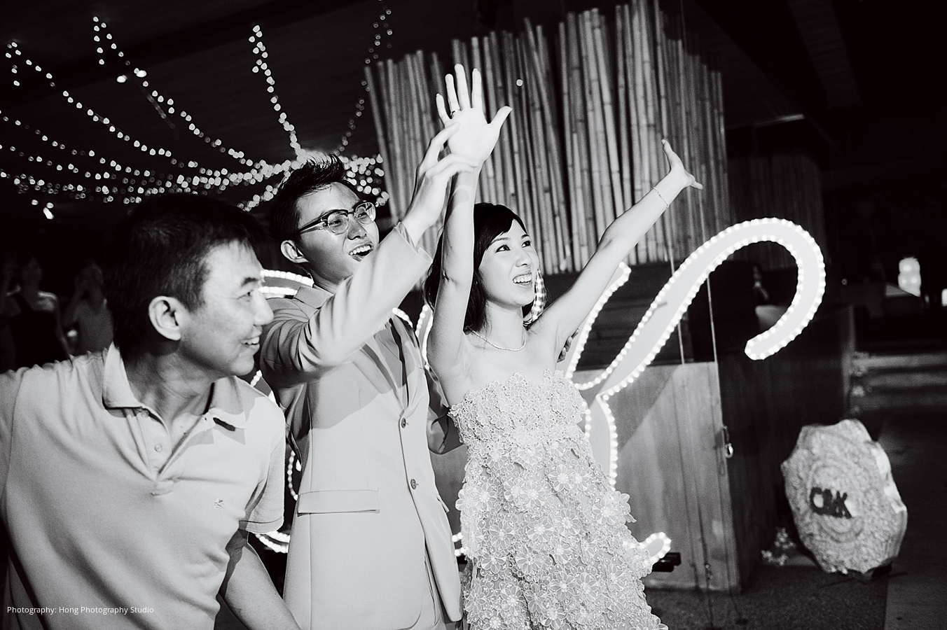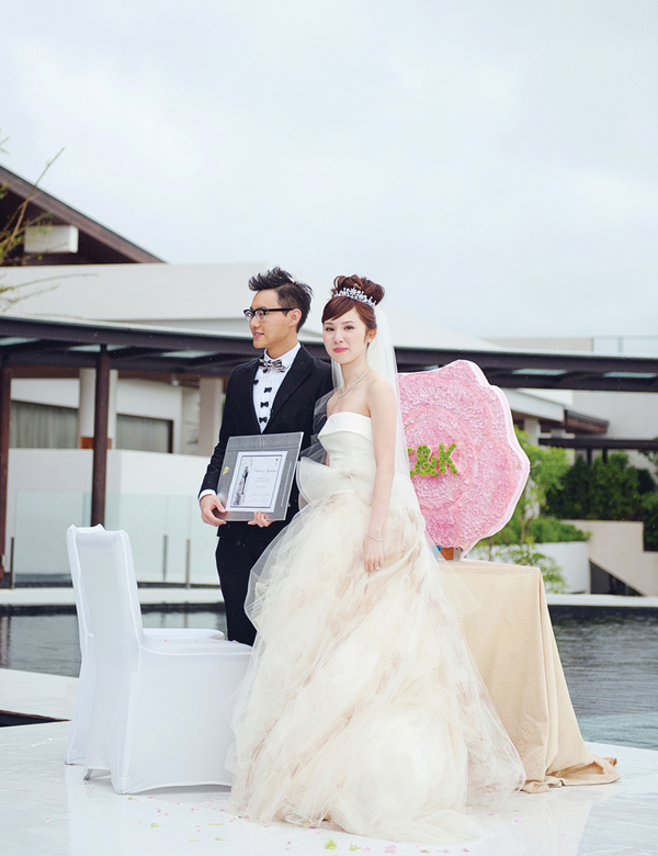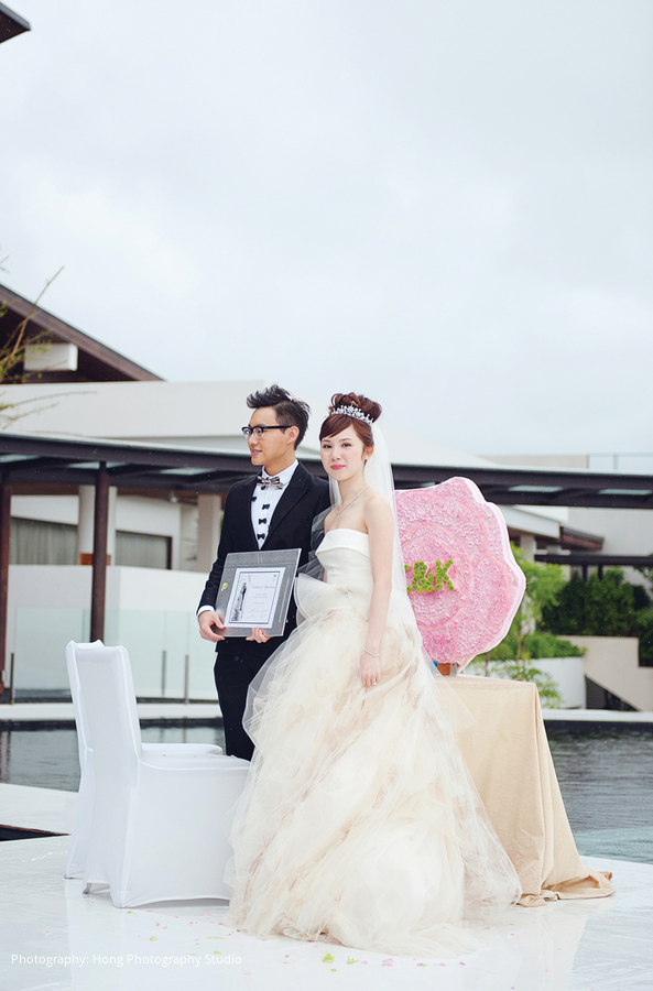 Although the groom says he never imagined he would cry on their wedding day, tears did fall when his bride gave her speech during the registration ceremony. Unstable weather meant a last-minute change to their dinner reception, from a formal setup to a casual buffet on the beach. At first, a bit unhappy with the altered plans, Candy says, “they brought us many joyful moments.” A stunning firework show capped the reception.