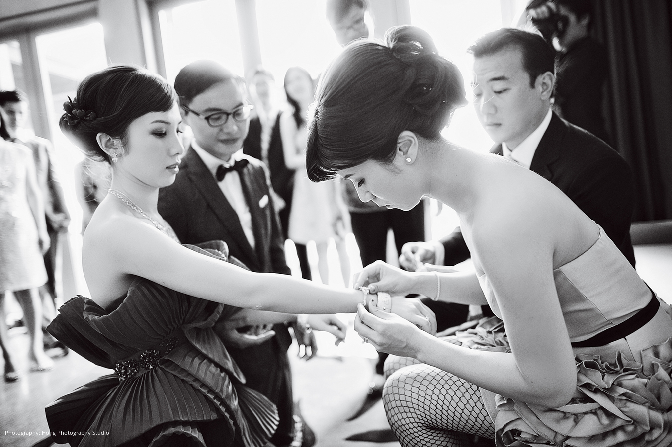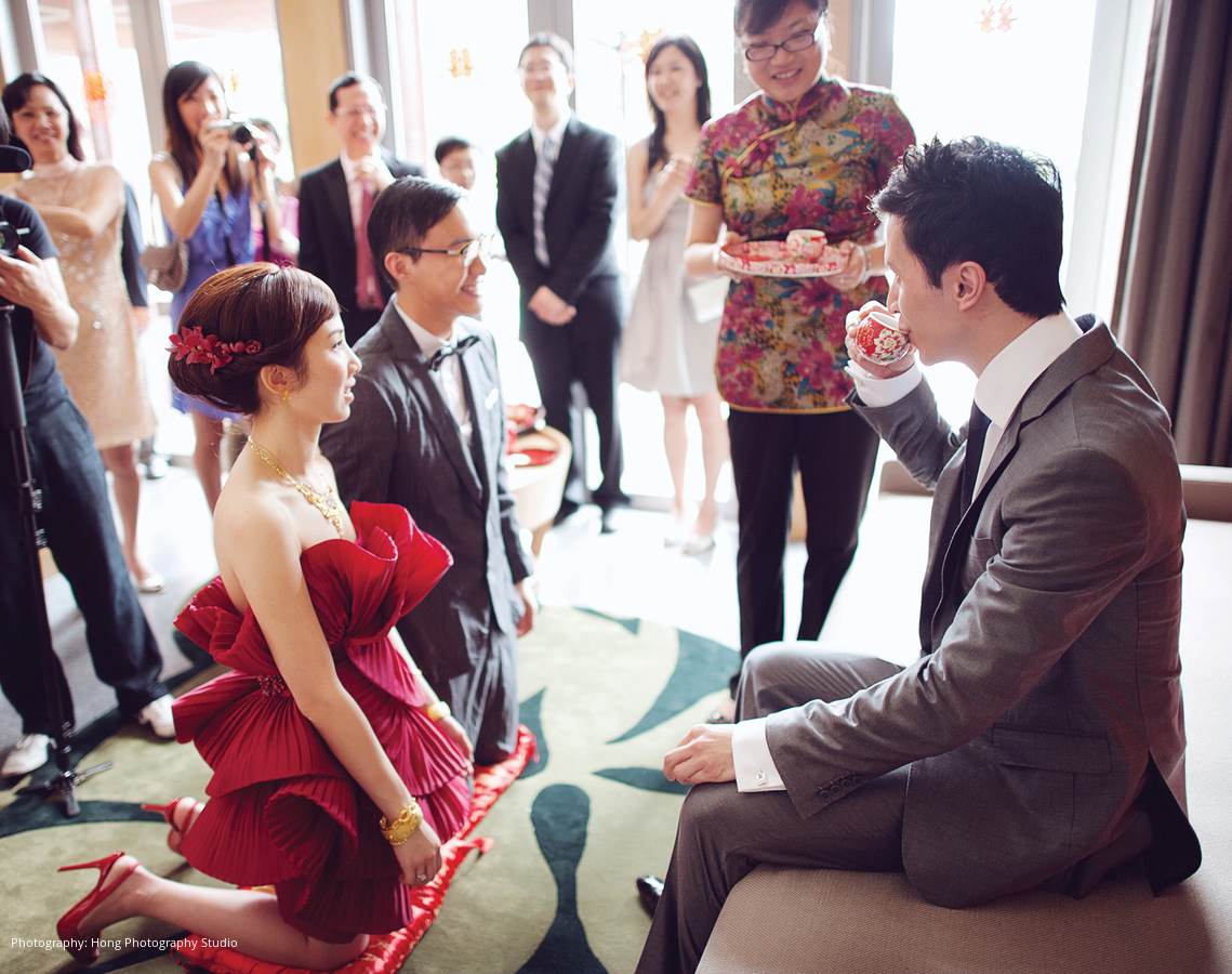 His surprise proposal led Candy around to multiple locations at the Hyatt Regency Sha Tin Hotel in Hong Kong. A photo (one from each year of their relationship) and a note led her from room to room. At the 11th spot, Candy rang the doorbell and Kenny was down on one knee. “It took me quite a long time to choose photos and write the notes,” he says, “but I felt very excited thinking of the scene that would happen during the day of my proposal.”