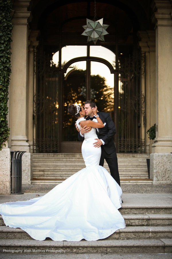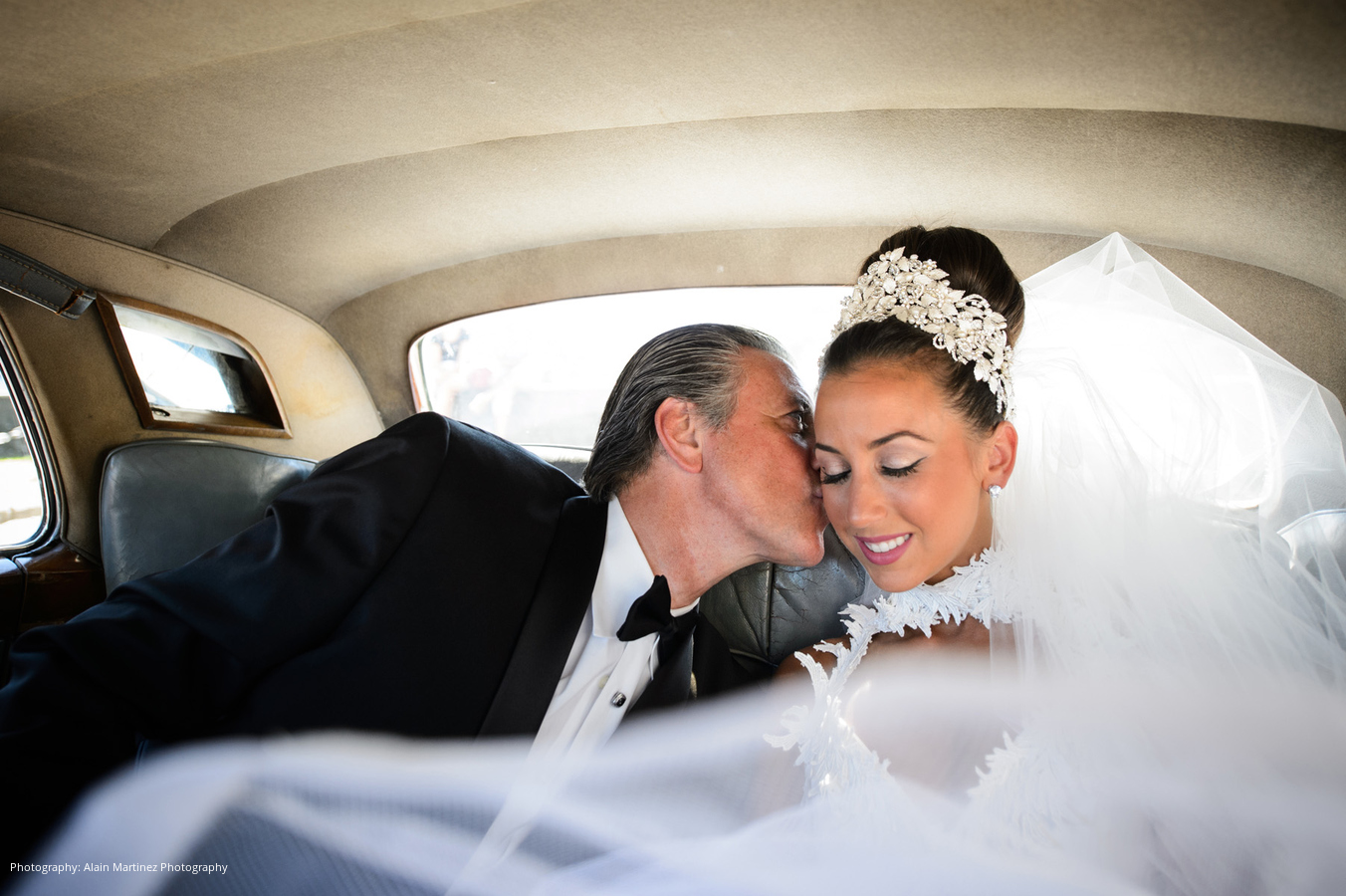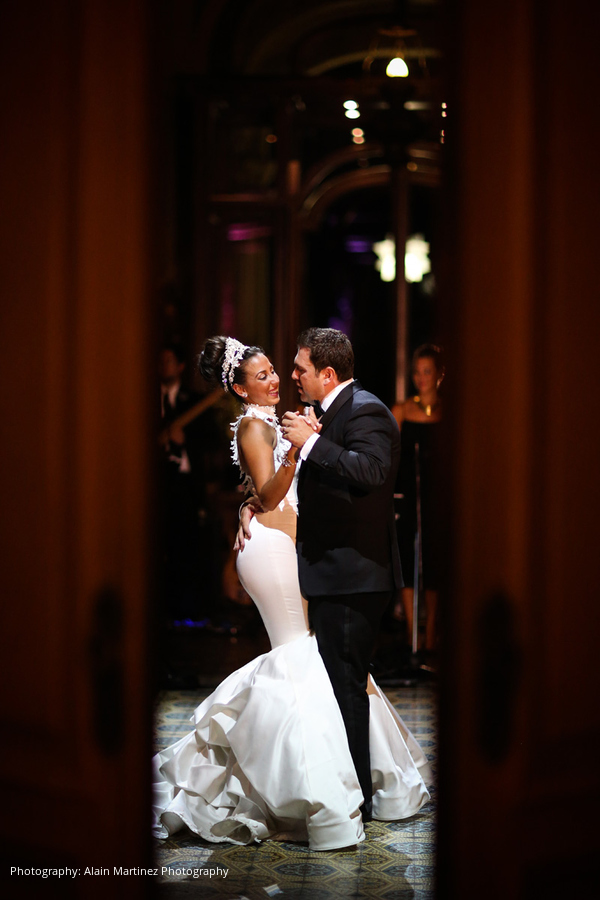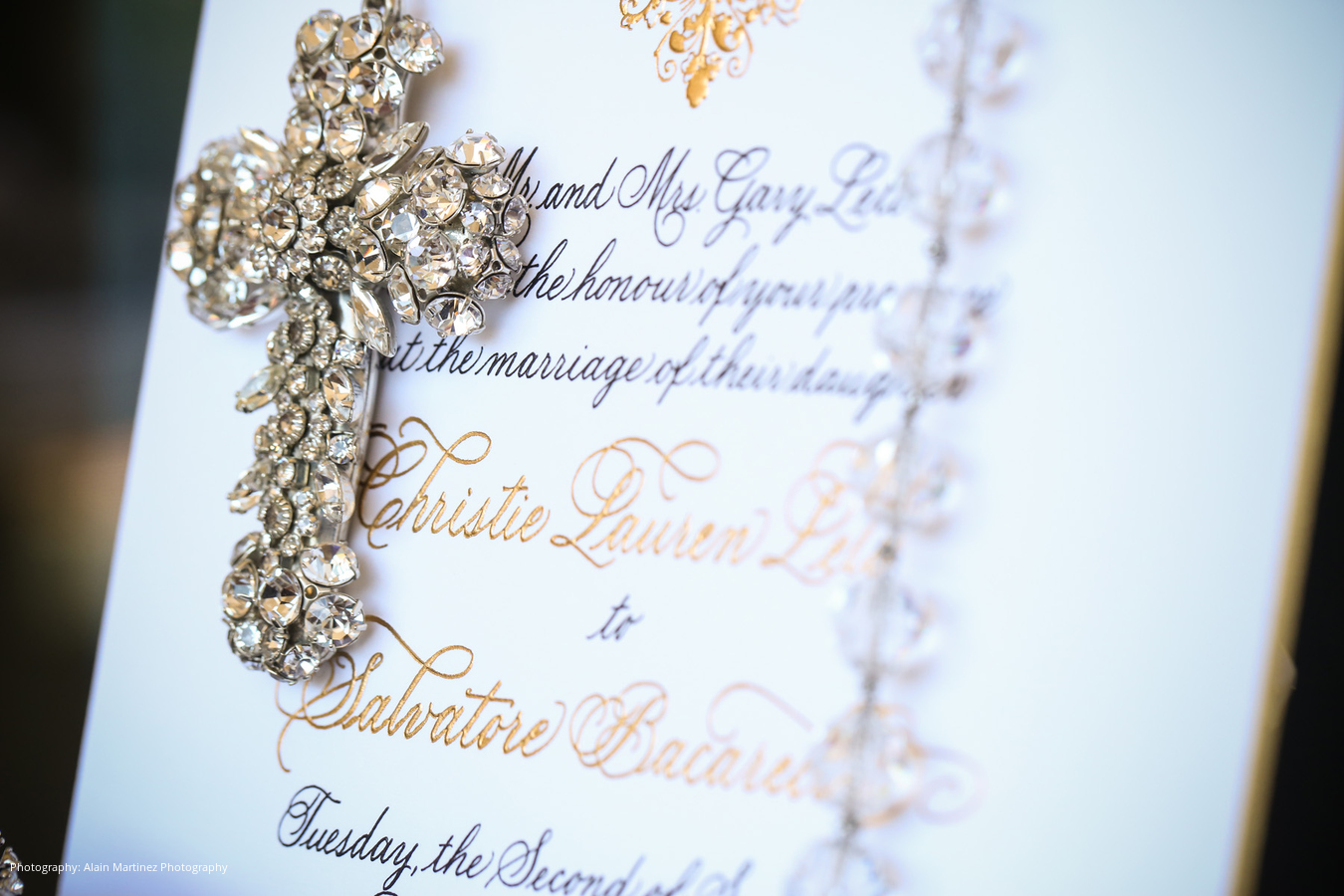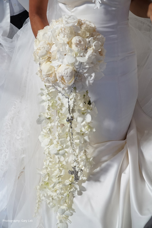 Attending bridal fashion week inspired Christie to design her own couture wedding gown with good friends and designers Jesus and Antonio Estrada. The dress was a silk/satin mix, with a high French lace neck and trumpet silhouette. She and her mother Denise Leli custom designed a one-of-a-kind tiara adorned in Swarovski crystals, freshwater pearls, and silver leaves that matched the lace leaves in the bodice of her dress. Her veil, which was five yards in length, also tied in seamlessly–after waiting seven months for ensemble to be complete–topped off with Christian Louboutin shoes, Christie was ready for her picture-perfect day.