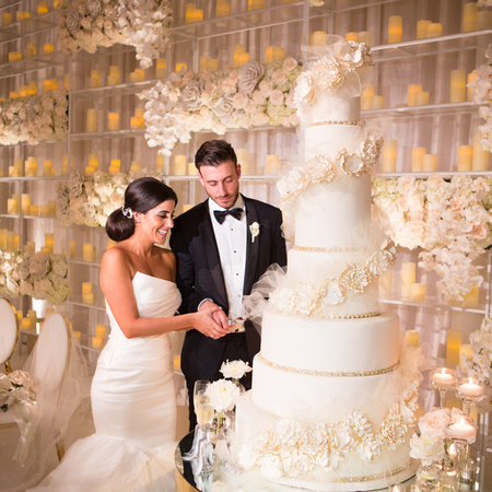 The wedding décor turned out to be above and beyond the couple’s expectations. “We were absolutely shocked at the details and finished product,” the bride says. “The vendors–especially our wedding planner–knocked it out of the park.” Walking into the event space, the newlyweds were greeted with a dreamlike ambiance. Everything was white, with stunning features including a candle wall, exquisite lighting, and an all-white dance floor that covered the entire ballroom