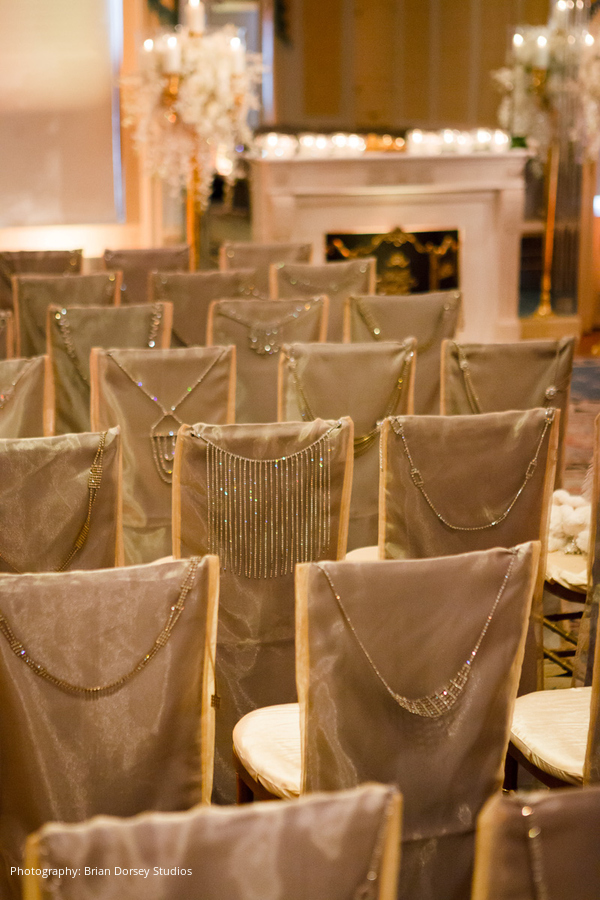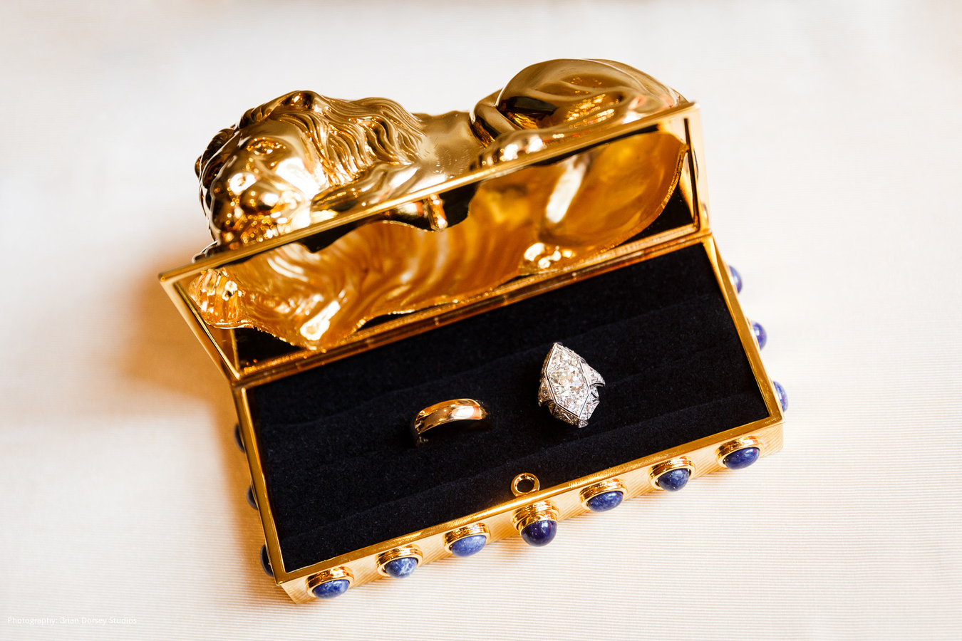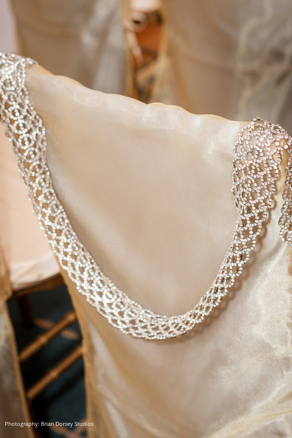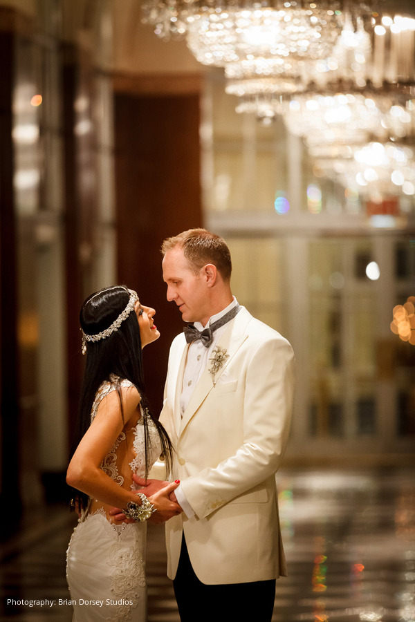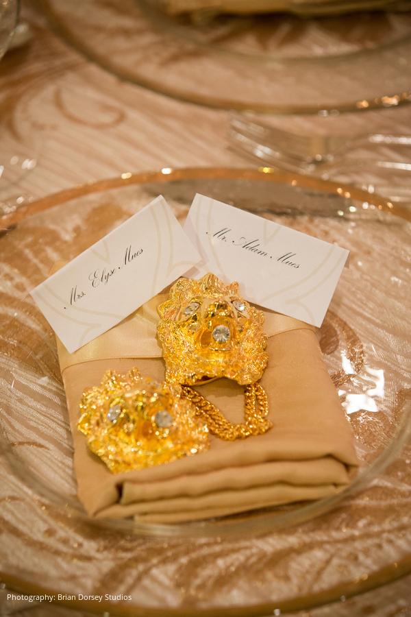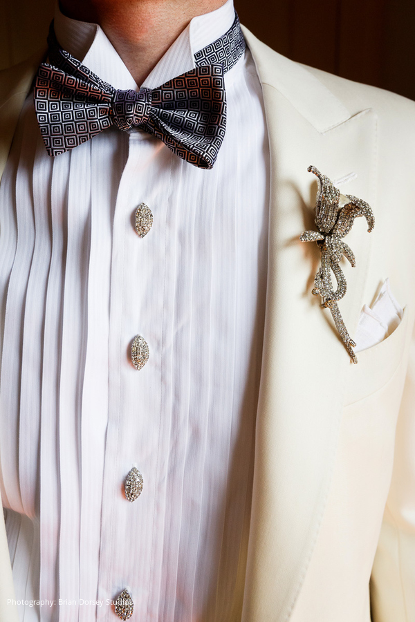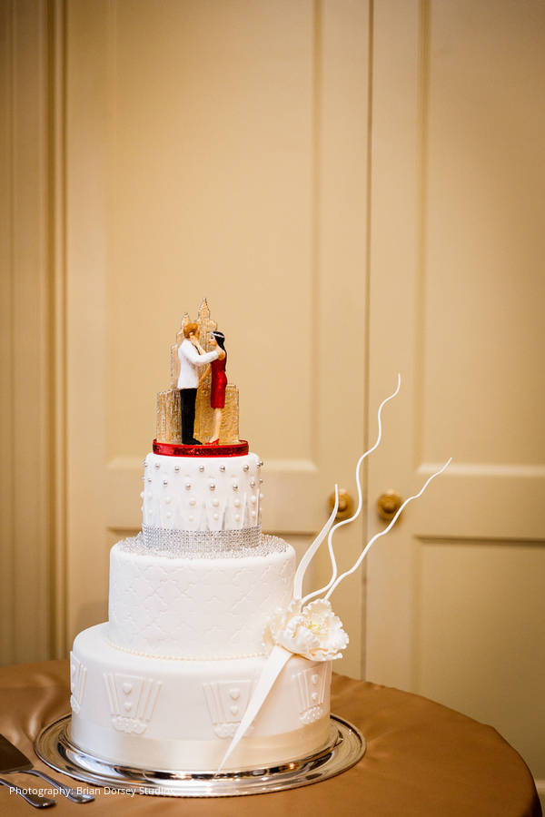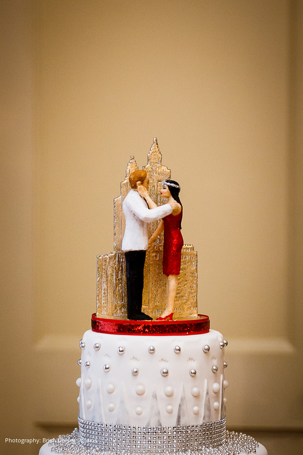 The wedding had an Art Deco theme highlighting Elyse’s business (and her own personal style) that included unusual jewelry and stones used in the couple’s clothing, accessories, wedding cake, and in the ceremony itself. This included rhinestone embellishments to Elyse’s dress and Adam’s cuff links, tuxedo set and cummerbund were all custom made with rhinestones and other jewels from Elyse’s company.