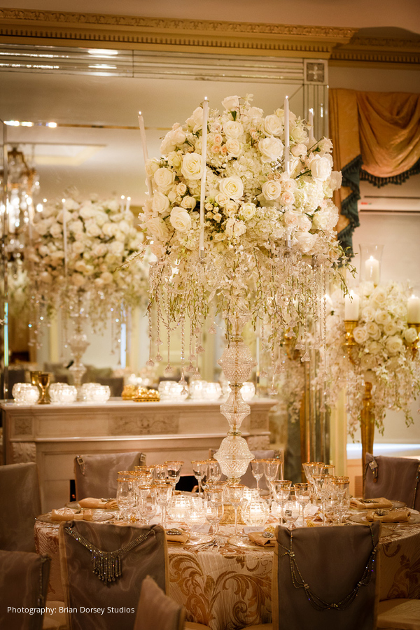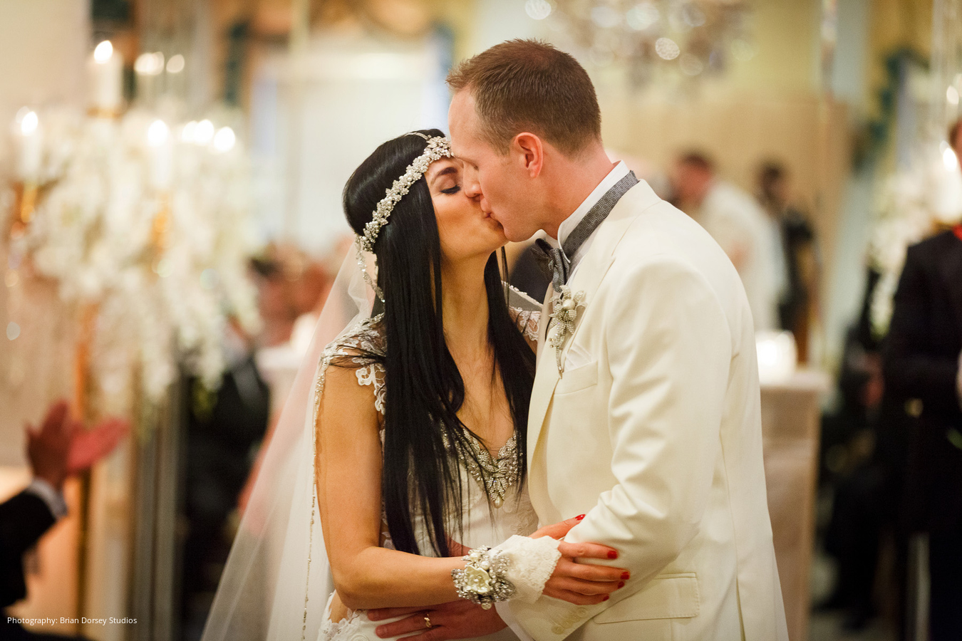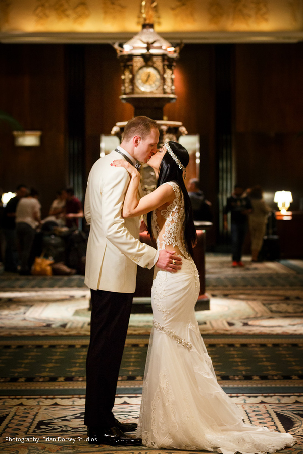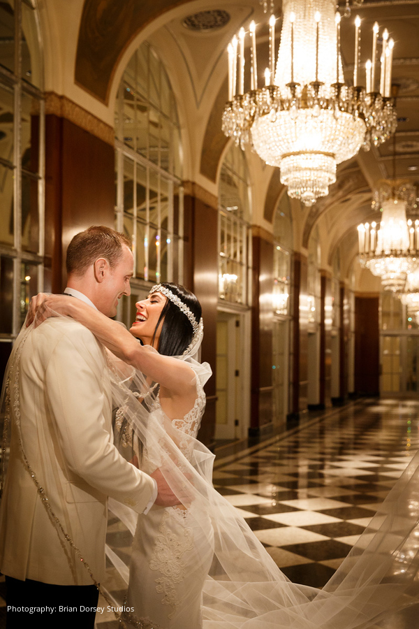 Location, Caterer, Cake, Planner and Lighting: Waldorf Astoria New York, New York, NY; Cake Topper: Cake Power, Chelsea, NY; Floral and Event Design: Floralia Decorators, New York, NY; Entertainment: Hank Lane Music and Productions, New York, NY; Wedding Dress: Galia Lahav; Veil: Ines di Santo; Headpiece, Boutonnière and Cufflinks: CJS Sales and Larry Vrba; Bride’s Shoes: Emmy London; Bridal Salon: Bridal Reflections, New York, NY; Photography: Brian Dorsey Studios, New York, NY