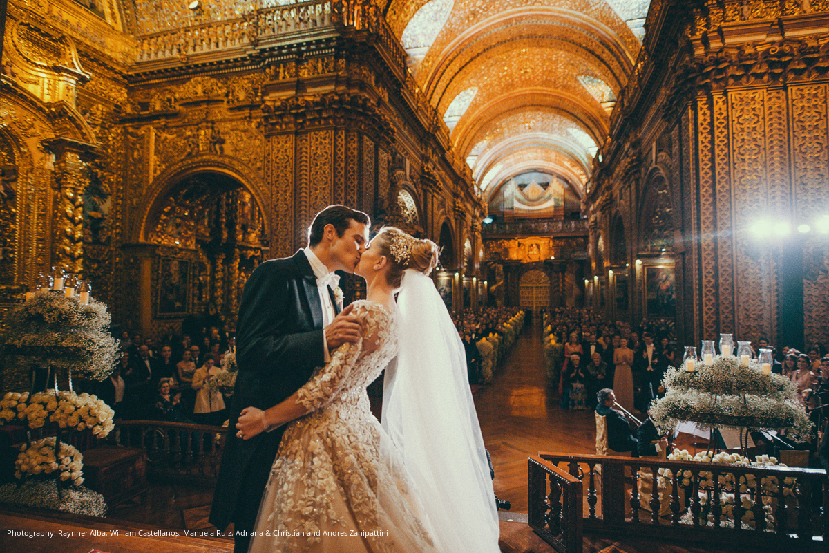 The wedding day began with a ceremony held at the Iglesia La Compañia de Jesus in Quito – a world heritage site brimming with overwhelming beauty and gold leaf baroque features. Afterwards, the bride and groom hosted a country club reception for 700 of their friends and family. A dark wood event space was gorgeously transformed into a world of pastels filled with peach garden roses, gypsophilia, rosewood fabric, silver and crystal chandelliers, and French lace tablecloths. The entire room radiated with romance.