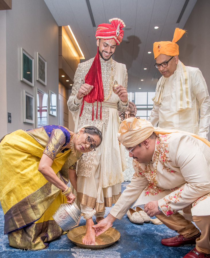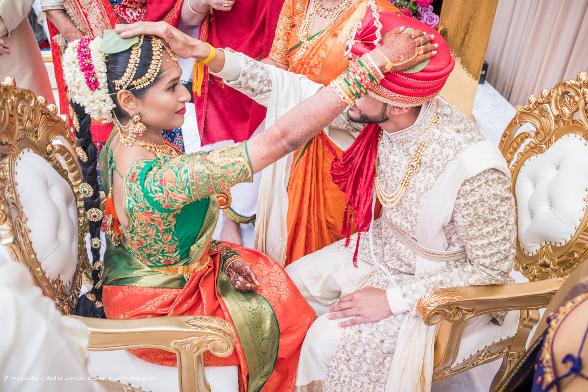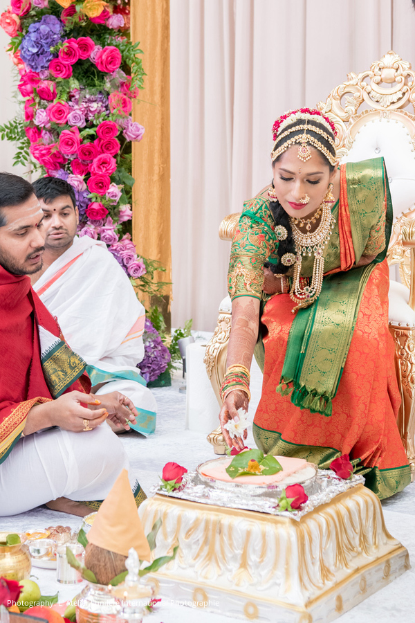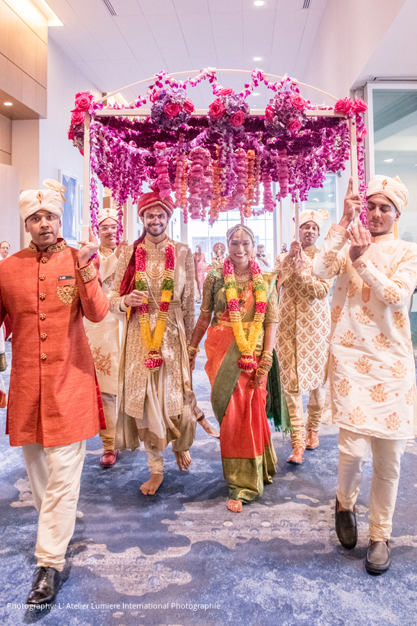 The wedding was a five-day-long celebration with the Mendhi, Haldi, and Pelli Kuthuru (a traditional Telugu making of the bride ceremony) taking place Ravali’s house in Lima, Ohio, and Arpan’s respective Mendhi and Haldi celebrations in Akron. After months of planning, and a two-week-long shopping spree in India where the bride and groom selected custom Anushree Reddy, Anita Dongre, Sulakshana Mongna, and Sabyasachi pieces for their wedding outfits, the couple was beyond excited for the big day.