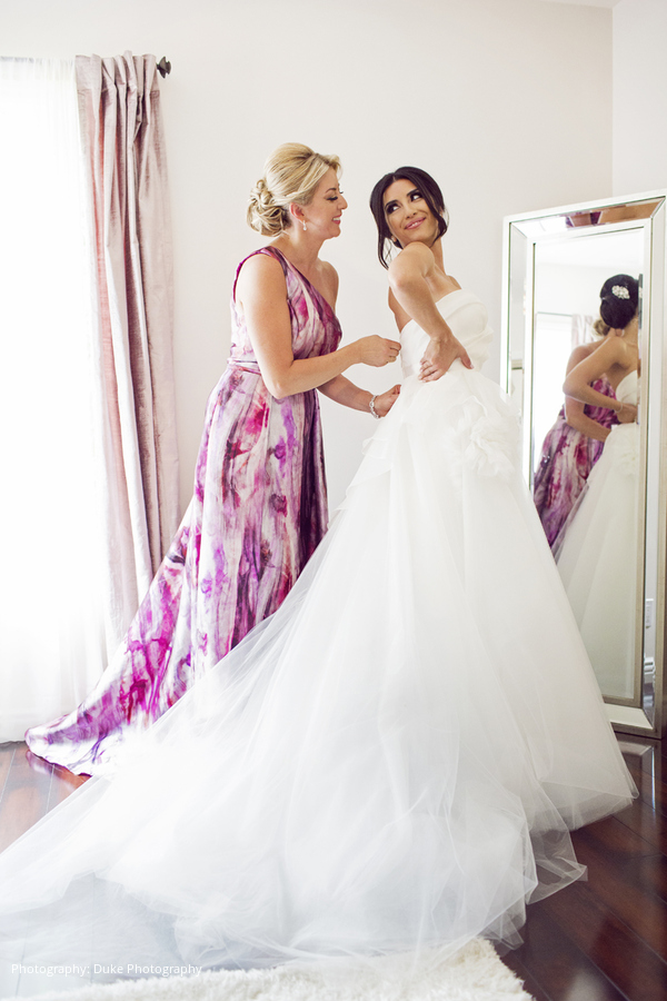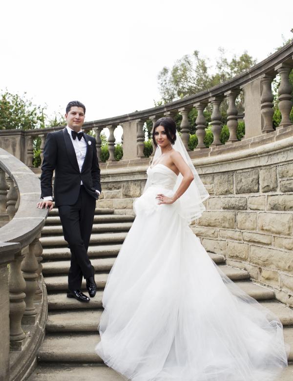 Planner: Fancy That!, Los Angeles, CA; Floral Design: Designs by Ashley, Glendale, CA; Rentals: White Night Design, Burbank, CA; Cake: Cake Studio, Los Angeles, CA; Wedding Dress: Marchesa; Veil: Vera Wang