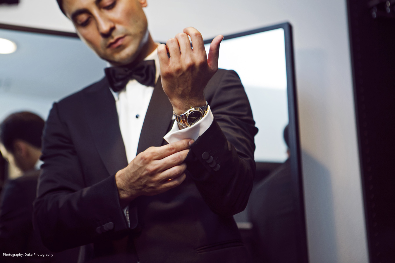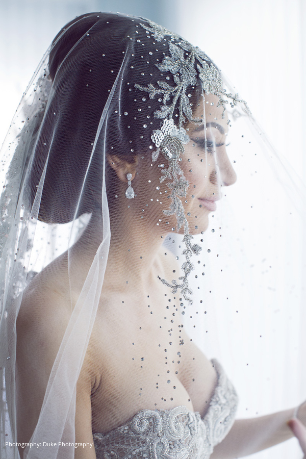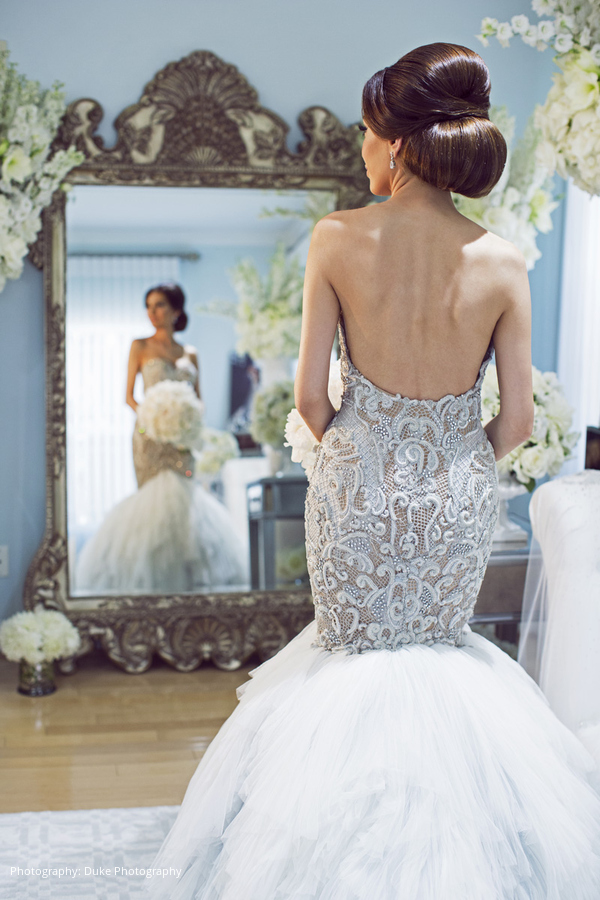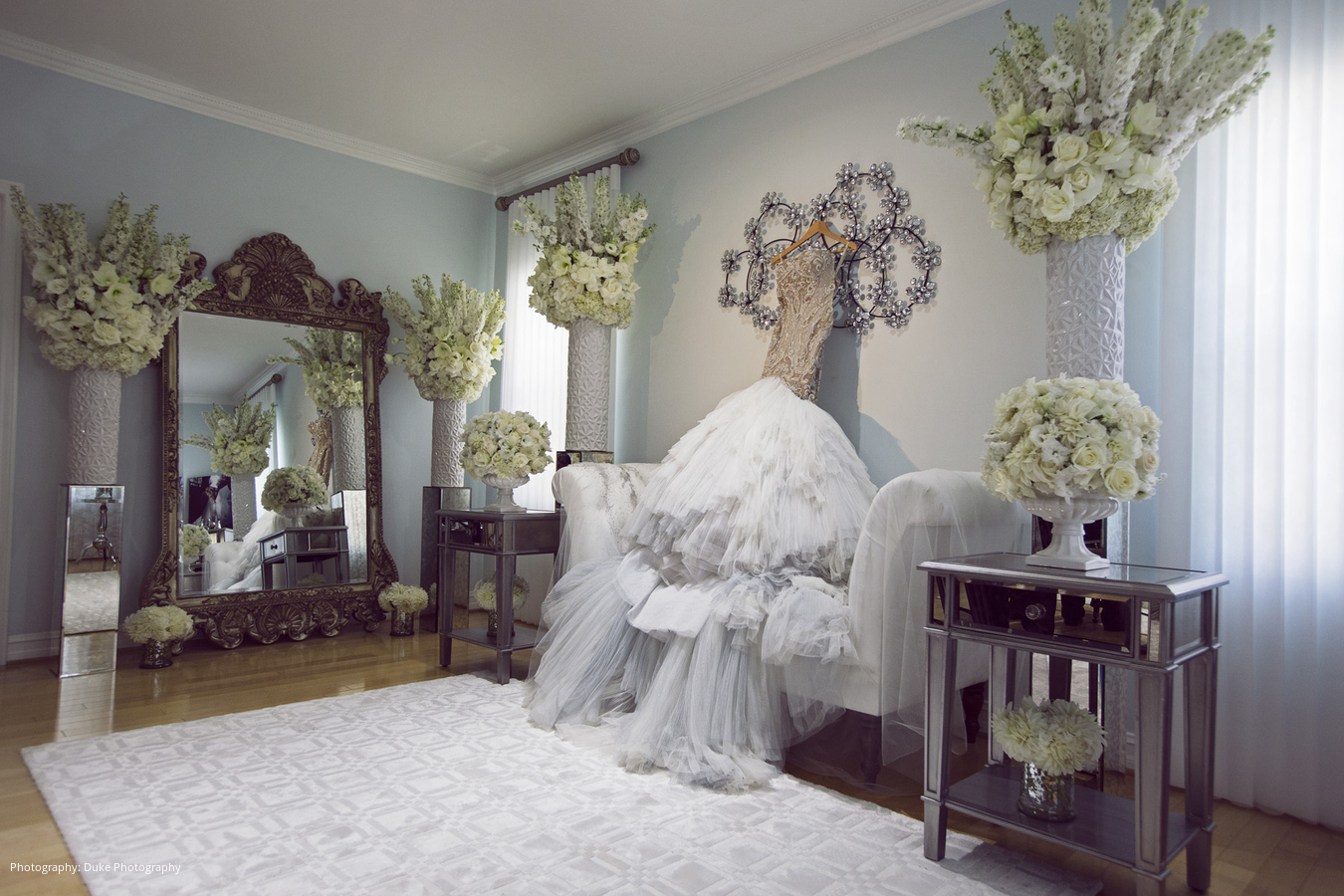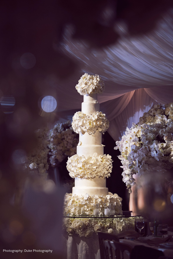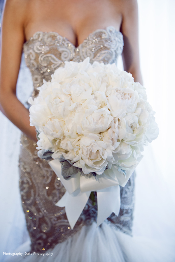 The bride wore a custom-made gown by internationally renowned designer J’Aton Couture, featuring fully hand-sculpted silver thread lace and layers of white and silver pleated French silk tulle. The cathedral veil was hand embroidered with French lace and crystals. The groom wore a tailored custom-made bow tie tuxedo by Ermenegildo Zegna.