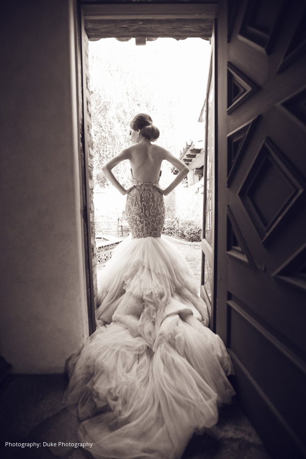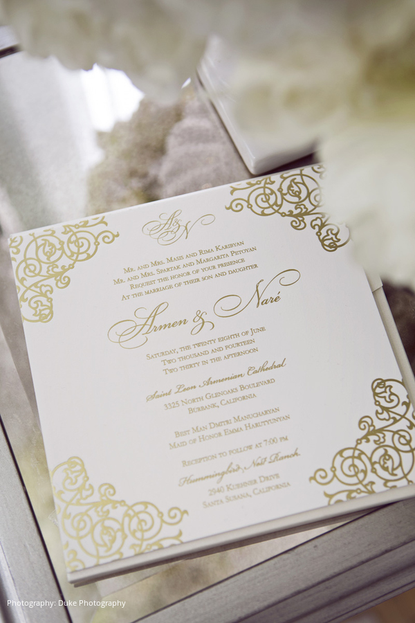 Stationery: Creative Works Design, Burbank, CA; Calligraphy: Calligraphy Katrina, Pasadena, CA; Wedding Dress and Veil: J’Aton Couture; Groom’s Attire: Ermenegildo Zegna