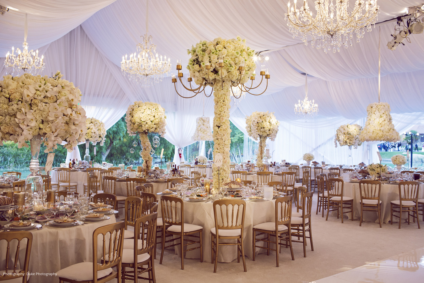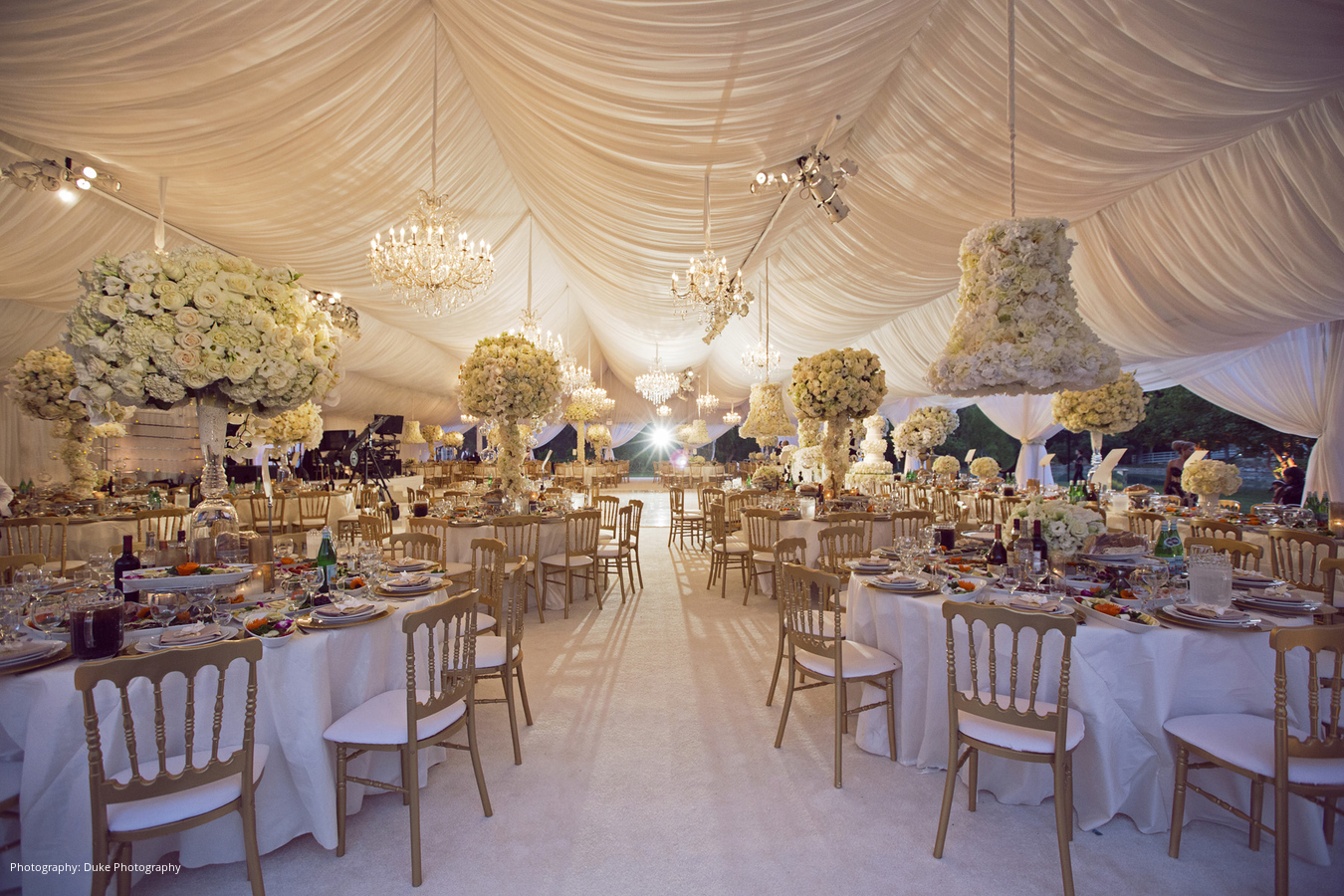 The reception was held inside an 8,000 square foot tent–an embodiment of extravagance, from the 20 glistening crystal chandeliers, to the all-white florals. The floral designs included hanging pieces, six-foot tabletop centerpieces, and a floral arch framing the newlyweds. The glow of the tent reflected in the lake, creating the perfect background for the glamourous outdoor affair.