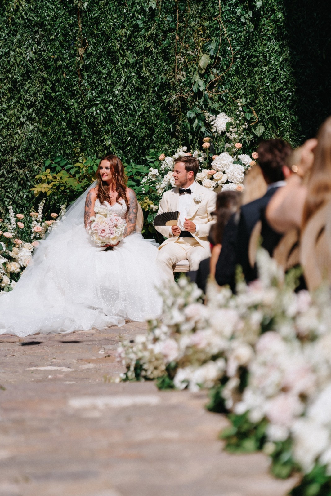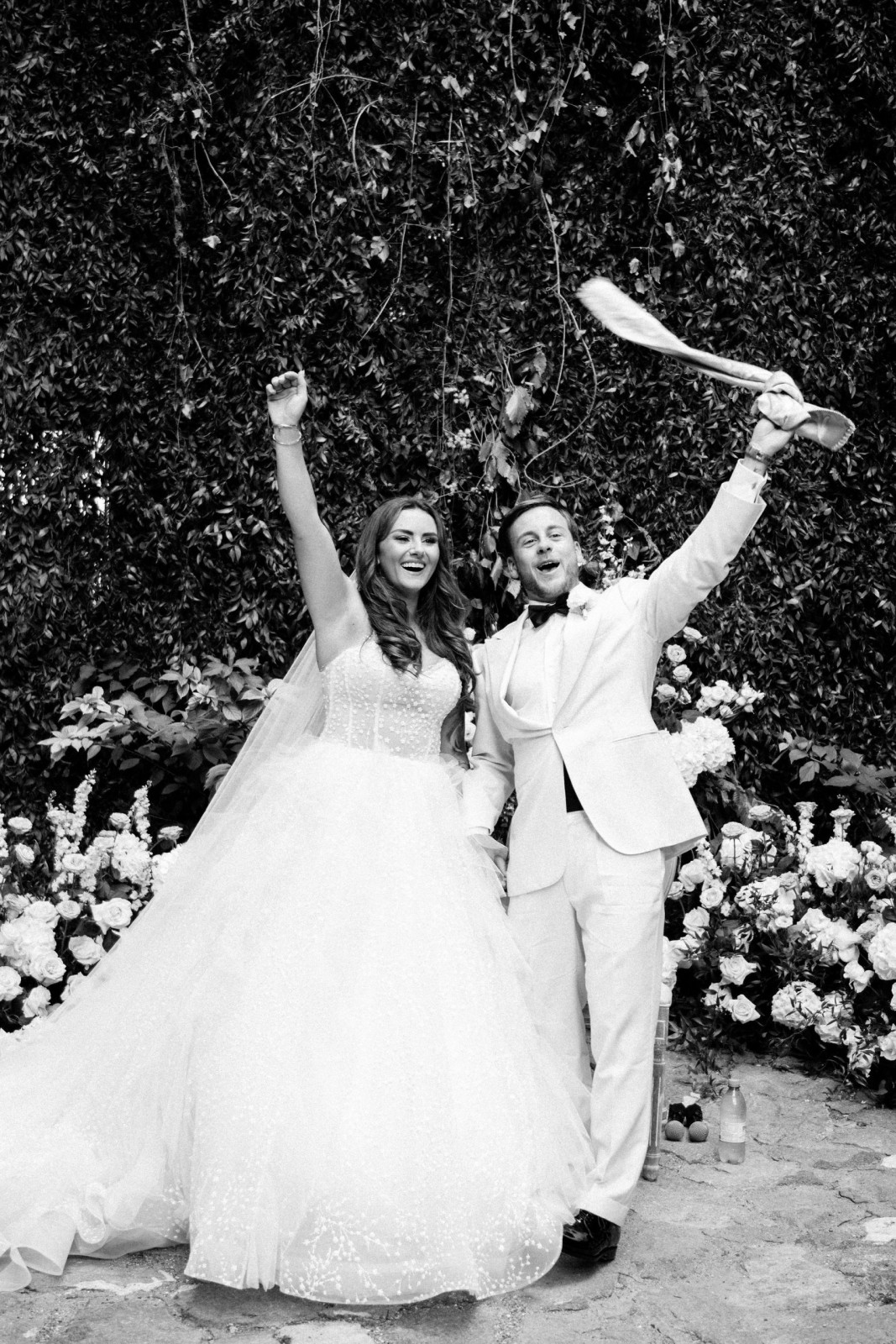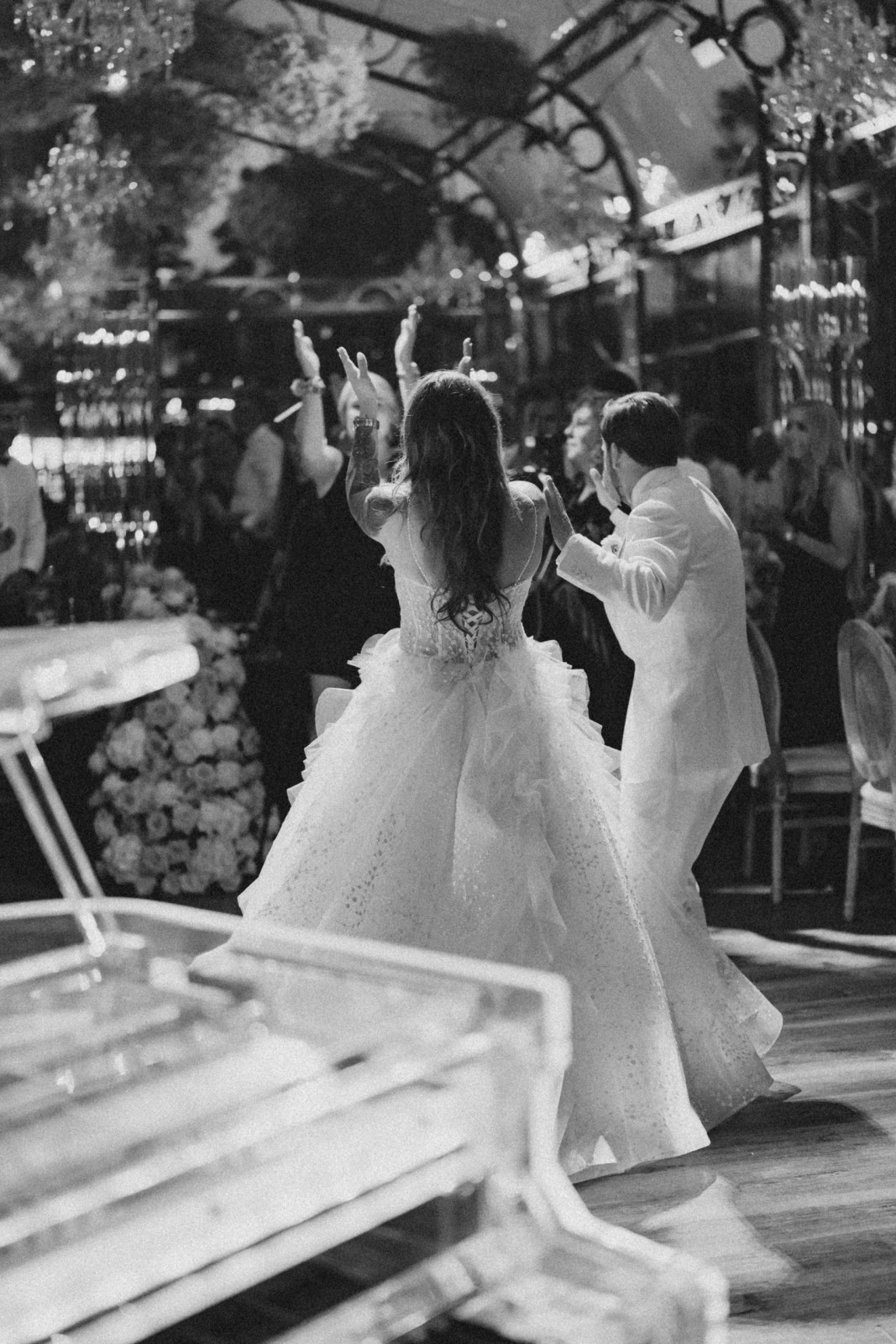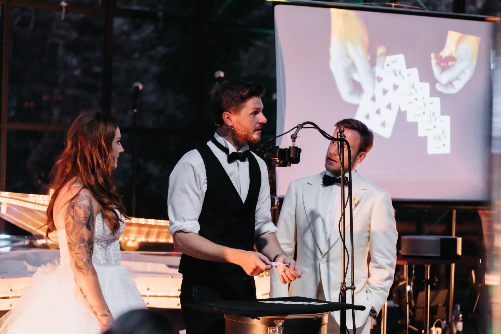 During the wedding, guests were surrounded by live entertainment and special details that included a magician, a limoncello escort wall, and a “living champagne” wall that served as the main attraction during cocktail hour. Everyone loved having the option to “ring for champagne” or “honk for gin and tonic.”