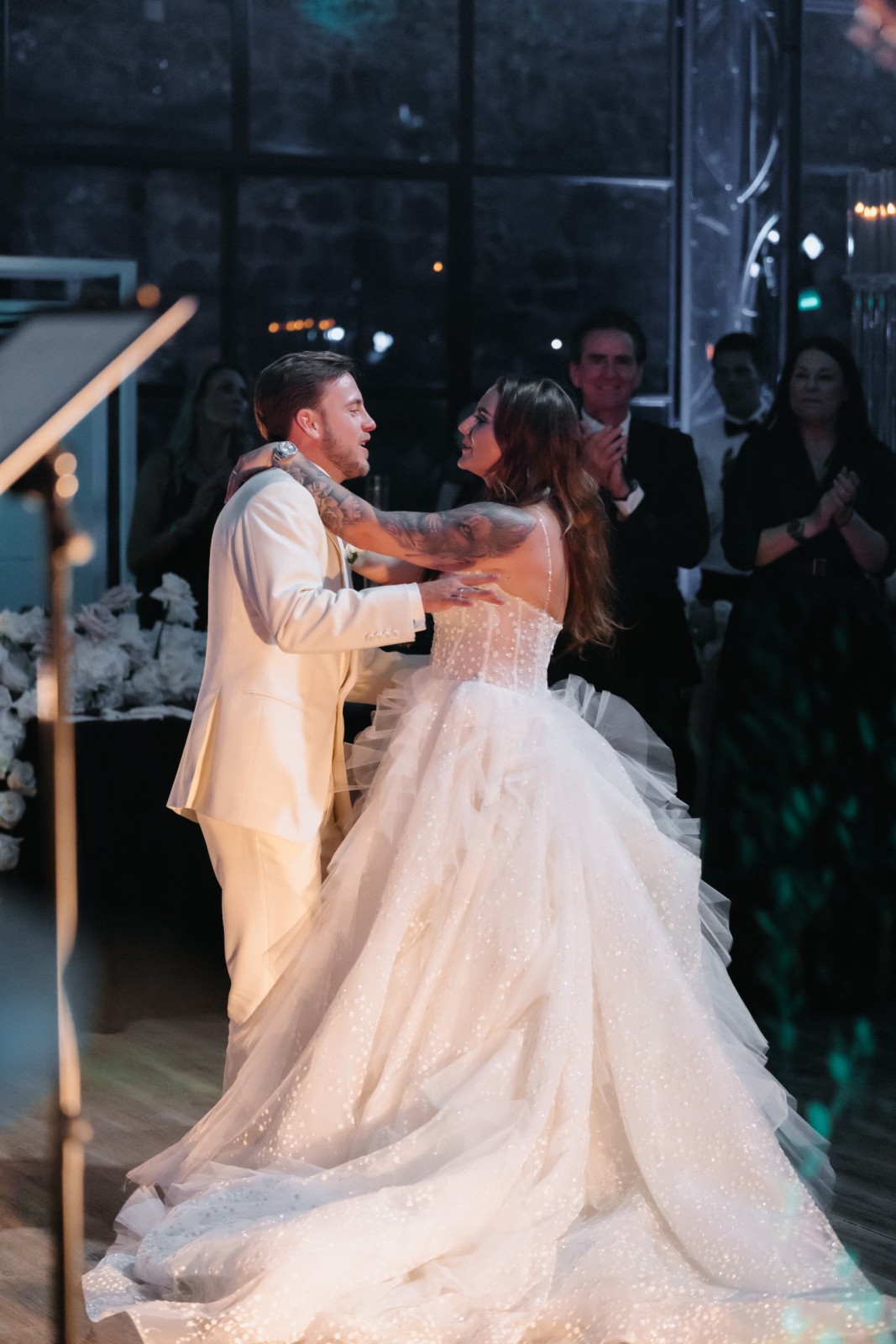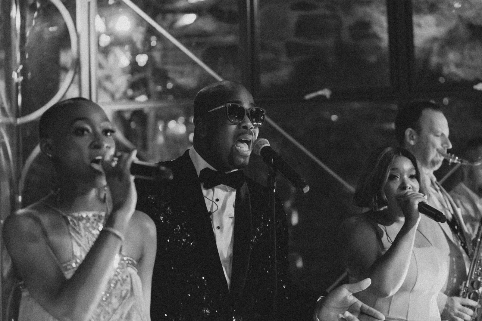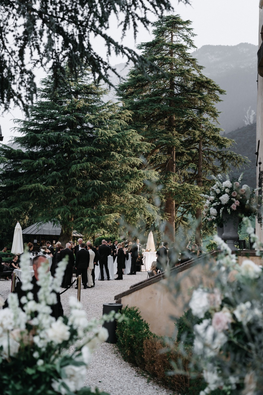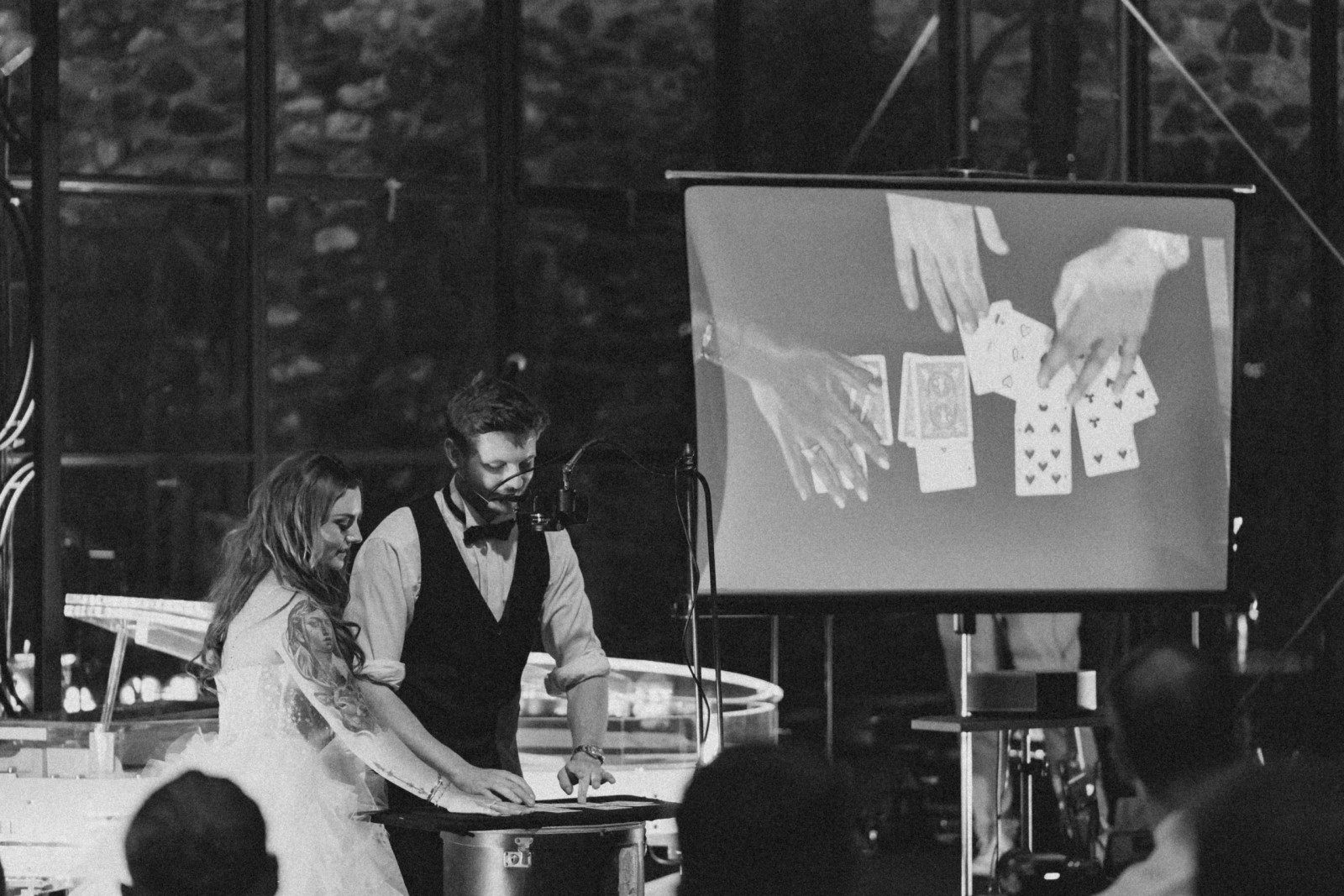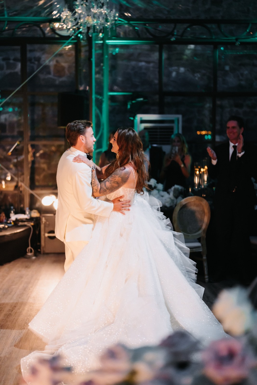 During the wedding, guests were surrounded by live entertainment and special details that included a magician, a limoncello escort wall, and a “living champagne” wall that served as the main attraction during cocktail hour. Everyone loved having the option to “ring for champagne” or “honk for gin and tonic.”