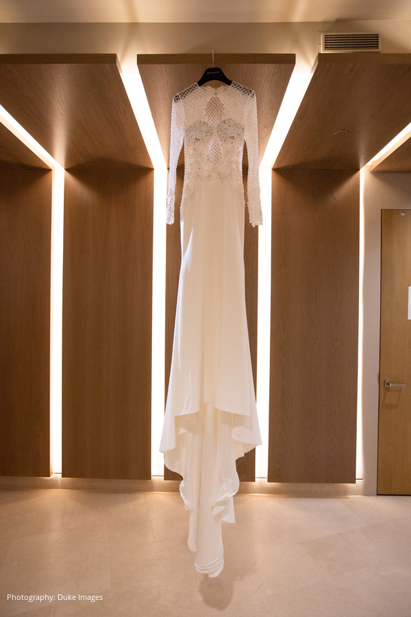 When the big day arrived, the bride was getting ready with her bridesmaids when she looked out over the balcony to see the reception area being set up below. The event space was situated under an umbrella of tall palm trees, and the décor embodied the elegant and modern aesthetic she had hoped for, while still maintaining a relaxed ambiance.