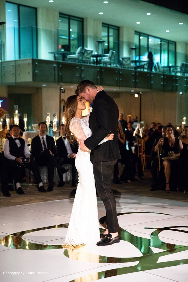 “If you are still hearing a year later that ‘your wedding was the most exquisite, beautiful, and fun wedding’ your guests have ever seen or been to, you know we achieved our goals,” Taylor adds. “The varying heights of the table floral arrangements were thick cascades of white orchids draping downward from five-foot-tall acrylic bridges, paired with the candelabras twinkling atop rectangle mirrored tables. The dreaminess continued with the large white and gold monogrammed dance floor. My emotions were overwhelming at times, just stunned by my surroundings and for the love of my husband, as it was simply the happiest day of my life.”