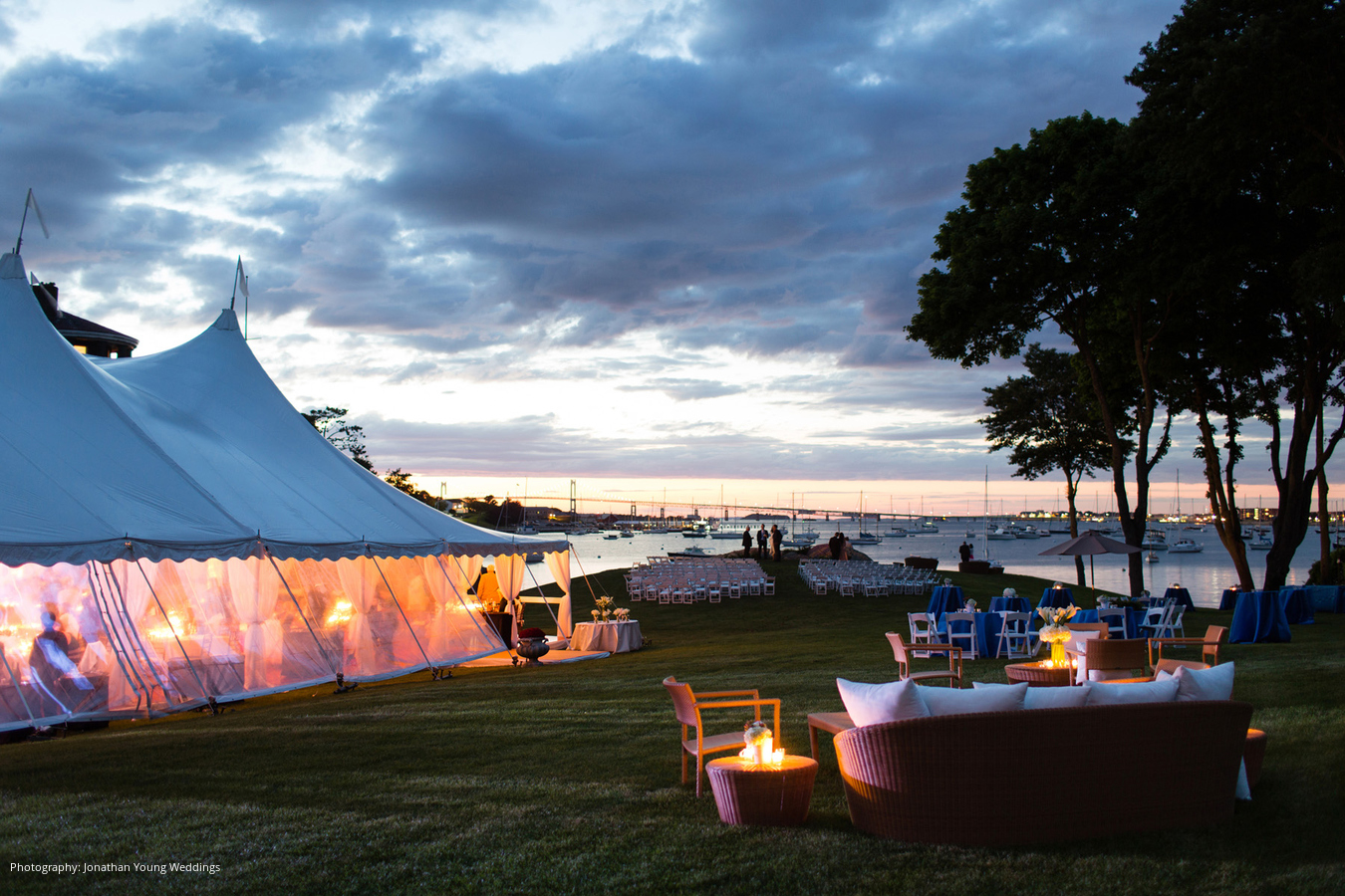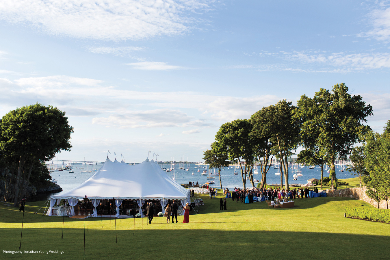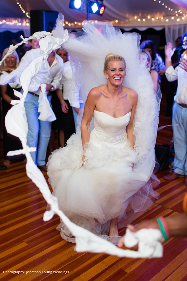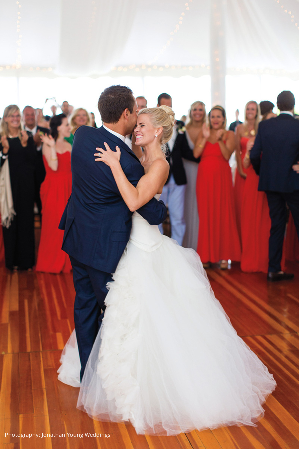 Location: Private Residence; Caterer: Russell Morin Catering & Events, Newport, RI; Event Design and Planner, Lighting: Exquisite Events Details & Décor, Newport, RI; Linen and Rentals: Rentals Unlimited, Stoughton, MA; Entertainment: Decades by DeZyne, Boston, MA; Stationery: Rugg Road Paper Company, Boston, MA; Wedding Dress: Vera Wang; Groom’s Tuxedo: J.Hilburn