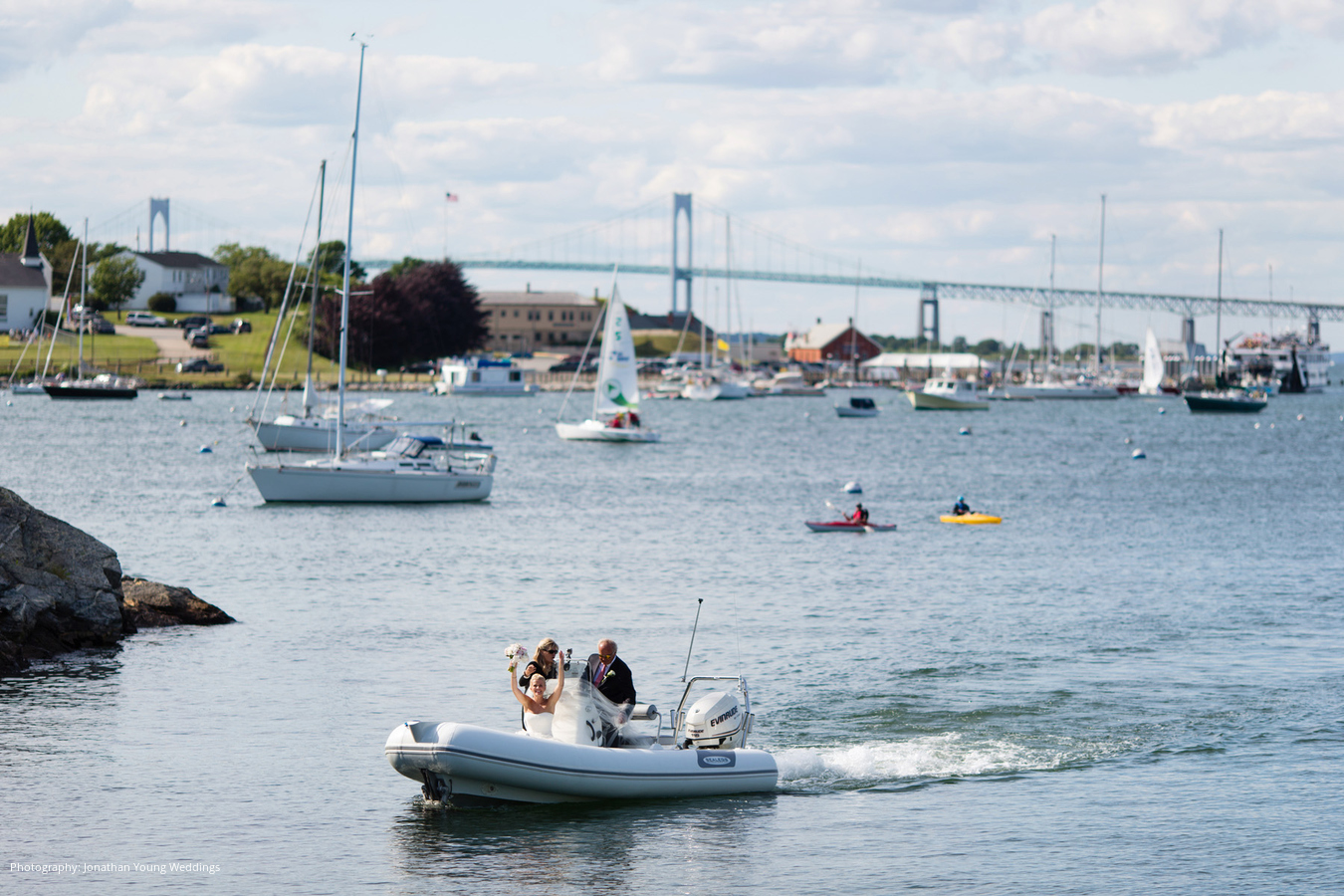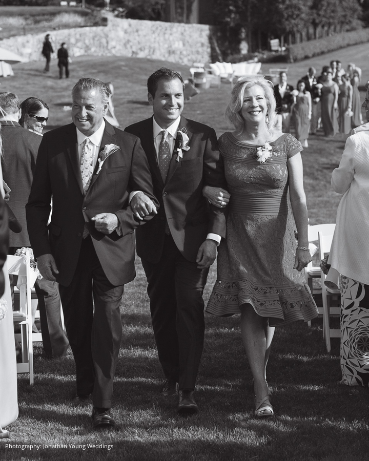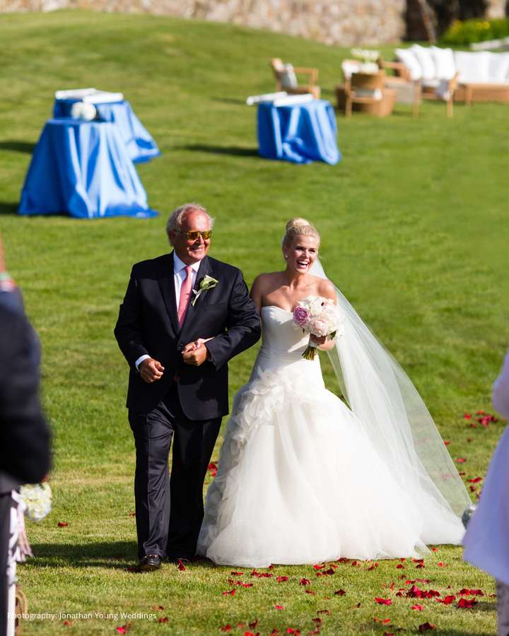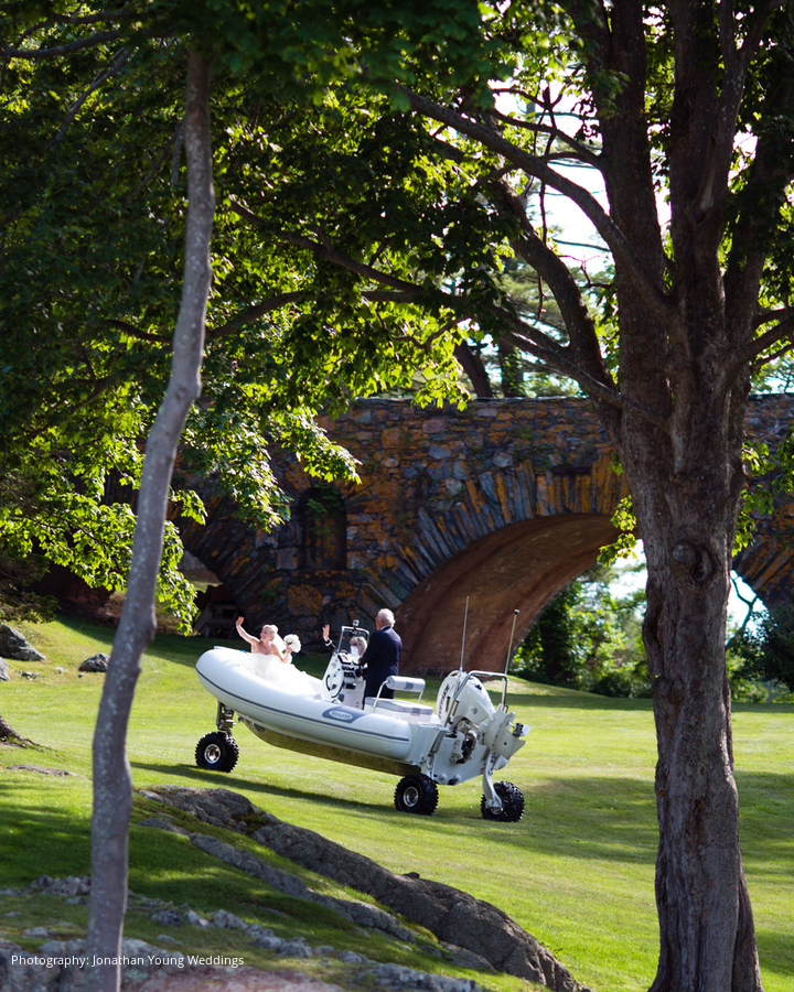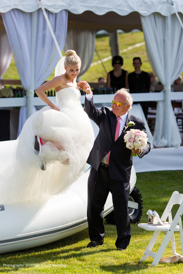 The week before their wedding at Gabbi’s parents’ Newport estate, she vowed to “be nice to everyone, no matter what” because “sun comes to nice people.” Bart says his vivacious wife is “the most kind-hearted, loving, caring person” he’s ever met, so it wasn’t surprising their day was spectacular. Blue skies were critical to their plan to shuttle 184 guests via boats from Fort Adams State Park. After pre-ceremony cocktails, everyone lined the hill to spy on the bride and her parents aboard an amphibious boat that drove onto the lawn. As they approached with “Going to the Chapel” blaring, a string quartet picked up the tune.