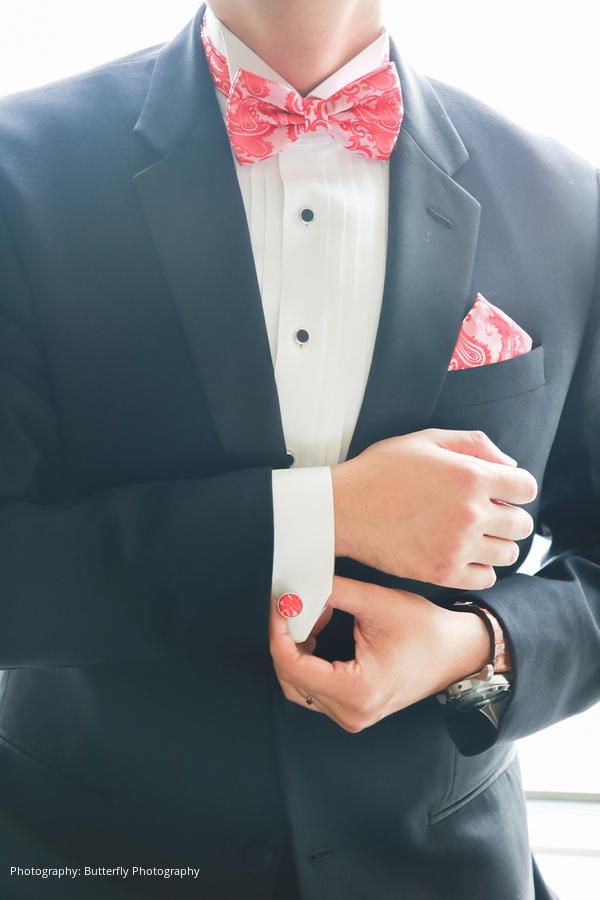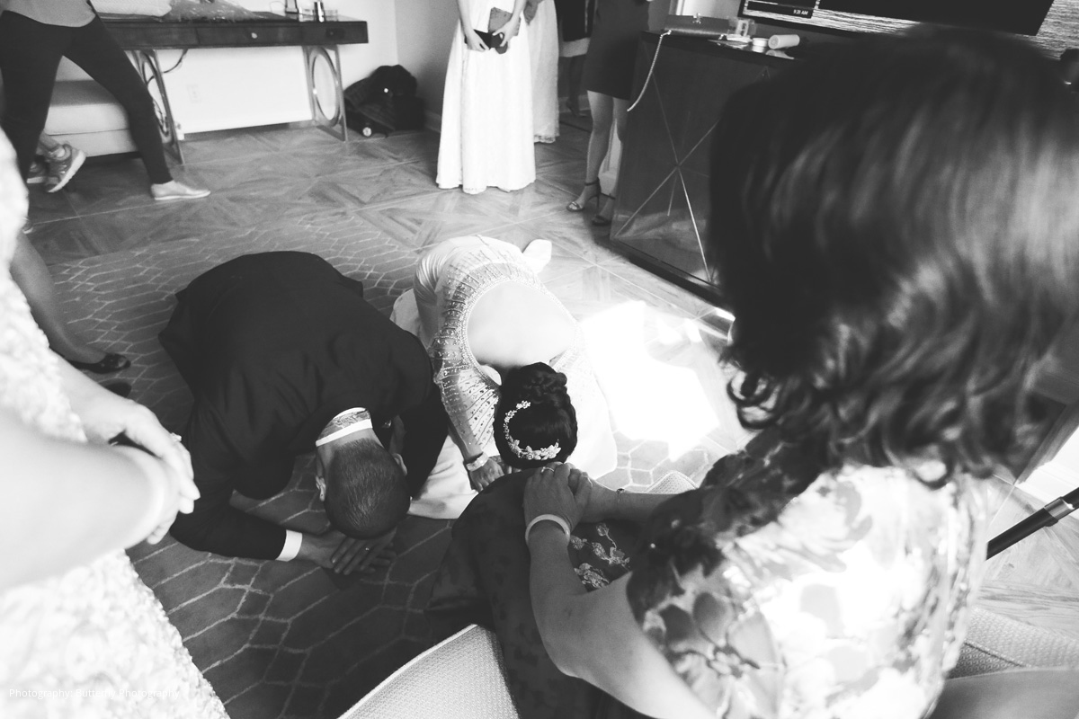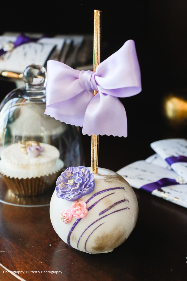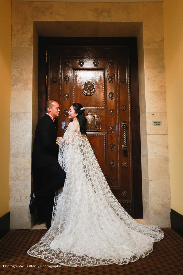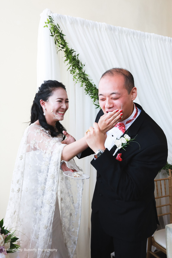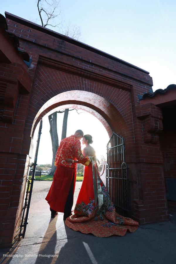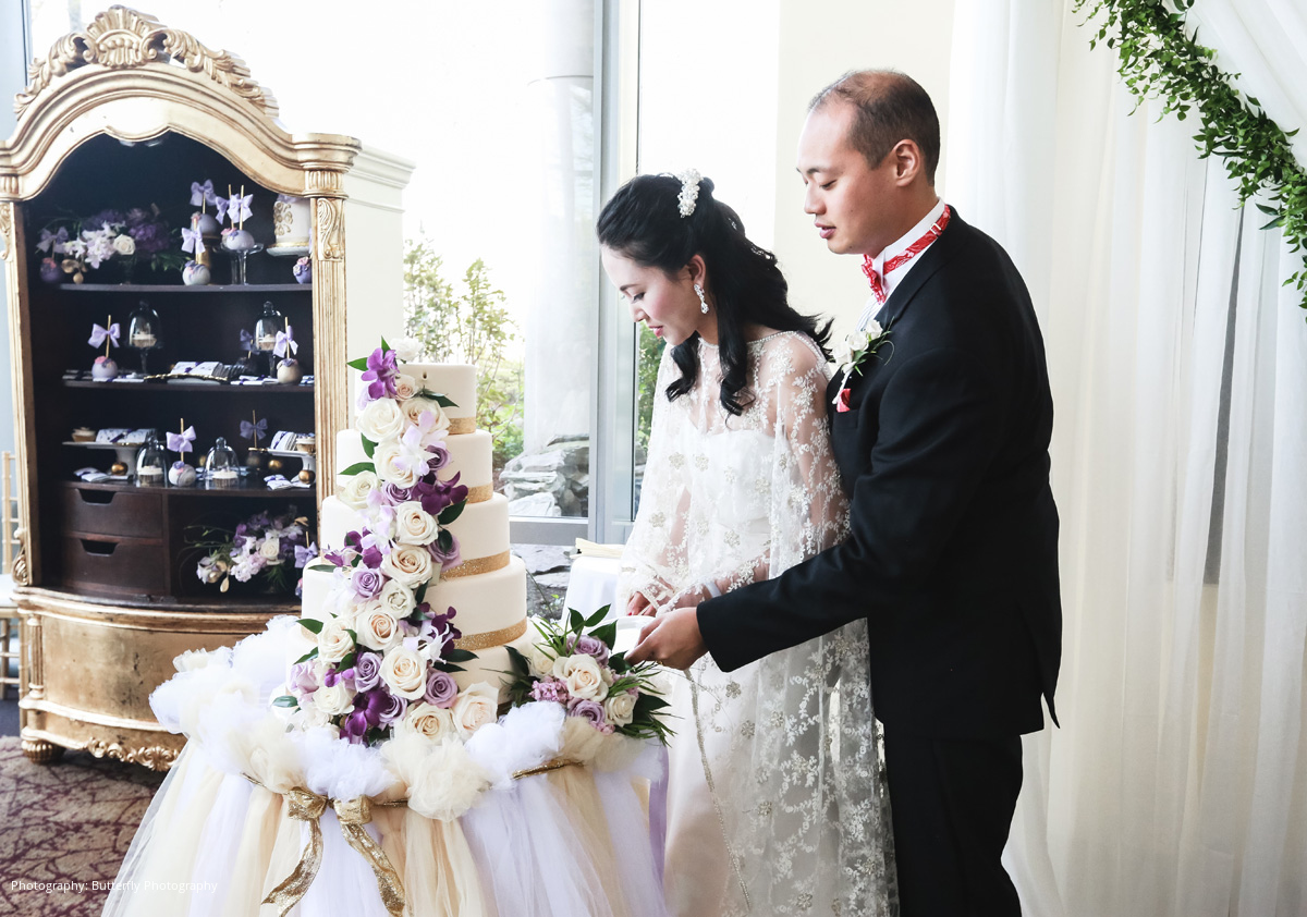 The ceremony and reception décor were accented with touches of gold to symbolize wealth, along with purple and cream florals, desserts, and favors. The color red played a vital role in their Chinese celebrations as a symbol of success, love, loyalty, fertility, and honor. The couple stunned in their engagement pictures with vibrant red Chinese apparel. River wore gilded red heels for the wedding ceremony along with an American-style lace wedding dress. She changed into another white dress with a delicate embroidered cape for the reception, as is traditionally done in Chinese culture to highlight the bride’s beauty. Multiple tea ceremonies served to honor the couple’s parents and officially usher the bride and groom into their new family.