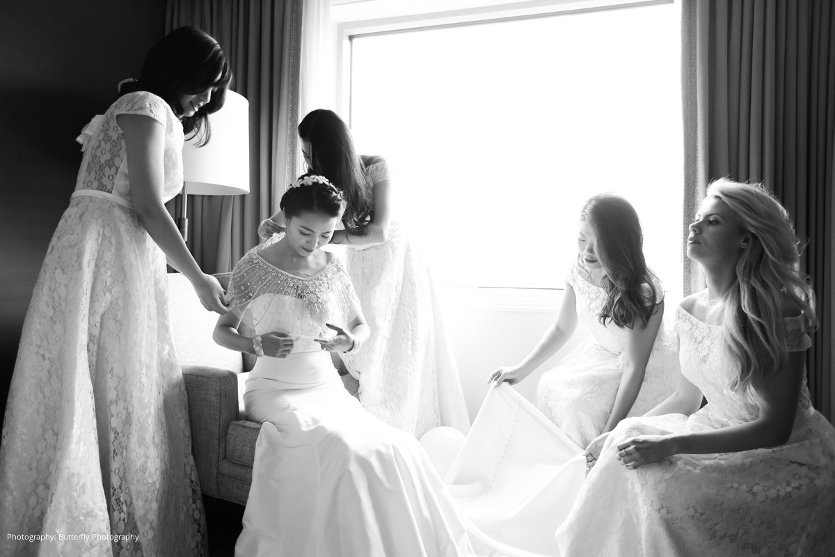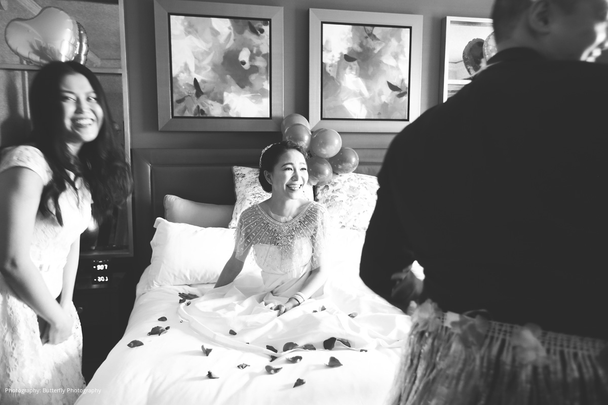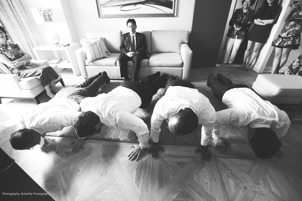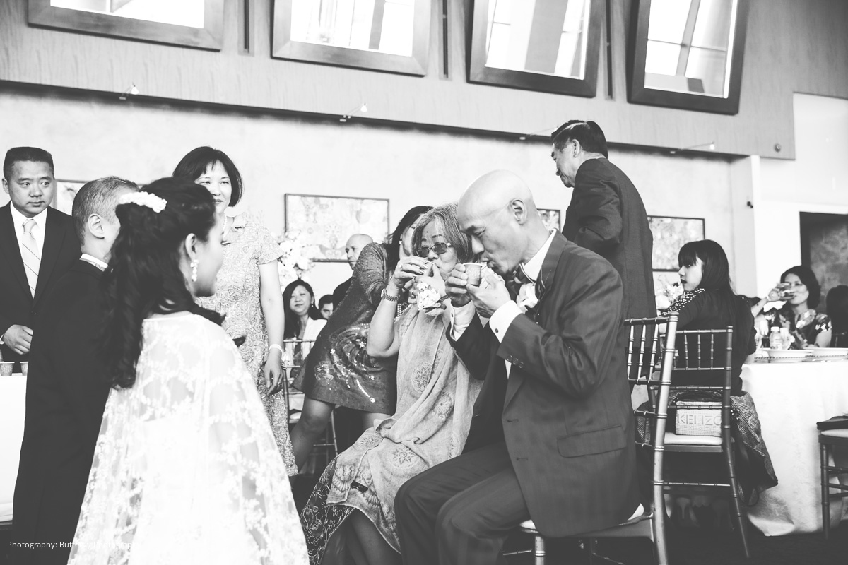Within four short months, the couple had arranged an intricate Chinese engagement ceremony to allow Stephen to formally request River’s hand in marriage. During the ceremony, the couple’s matchmaker negotiated the dowry between each set of parents, which consisted of yellow gold jewelry that was placed on the bride-to-be by her future mother-in-law. The bride’s family also presented gifts to the groom and his parents as part of a special tea ceremony, including a money-filled red envelope symbolizing a blessing and formal welcome into the new family.