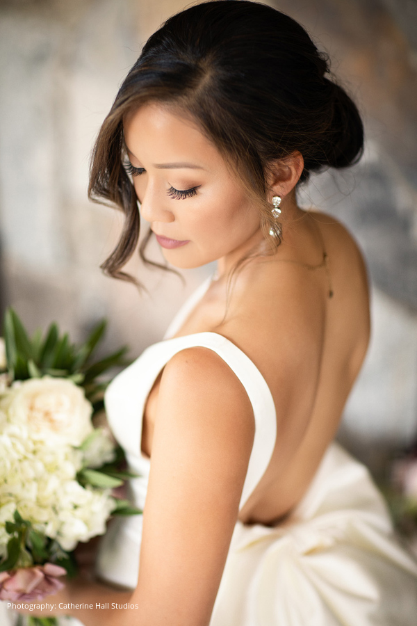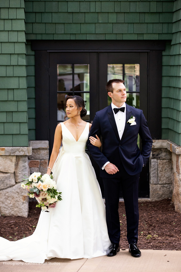 Leslie donned a stunning Monique Lhullier A-line gown with an elegant bow back, paired with Christian Louboutin heels. Brandon cut a handsome figure in a sharp navy suit by Hugo Boss. Seeing each other for the first time on their big day was an unforgettable moment for the two.