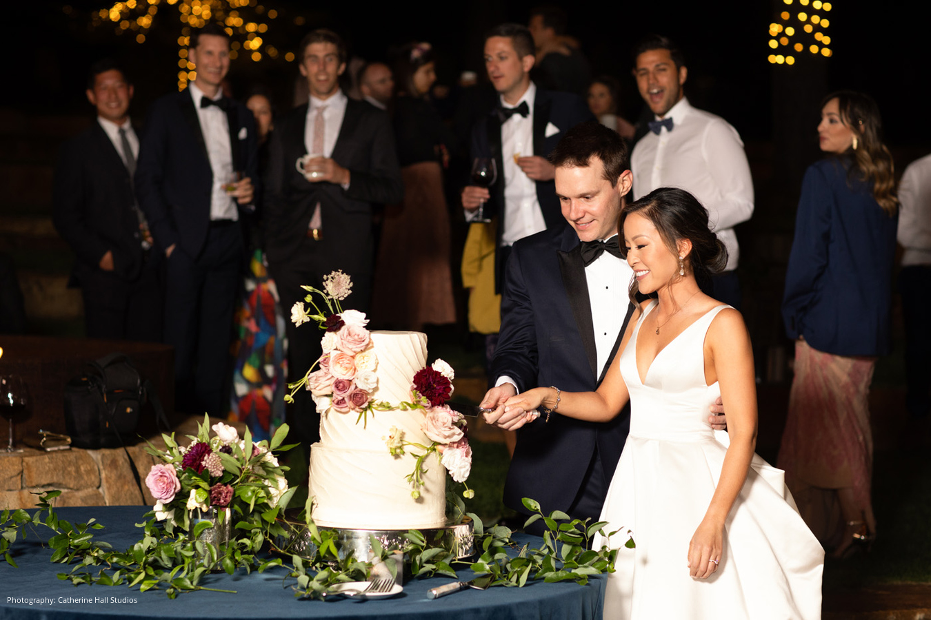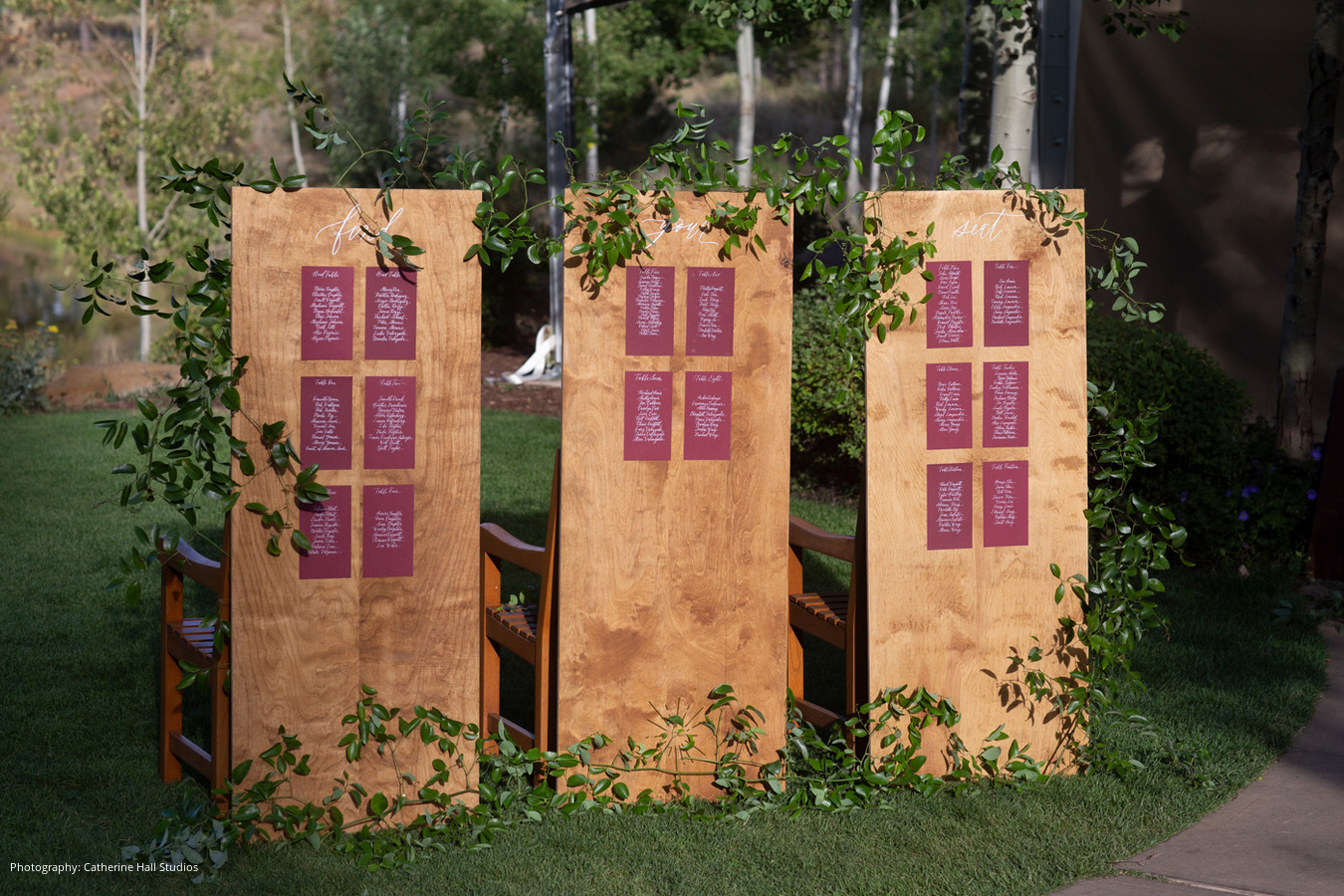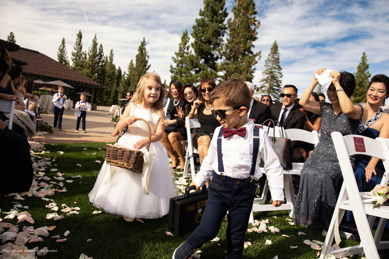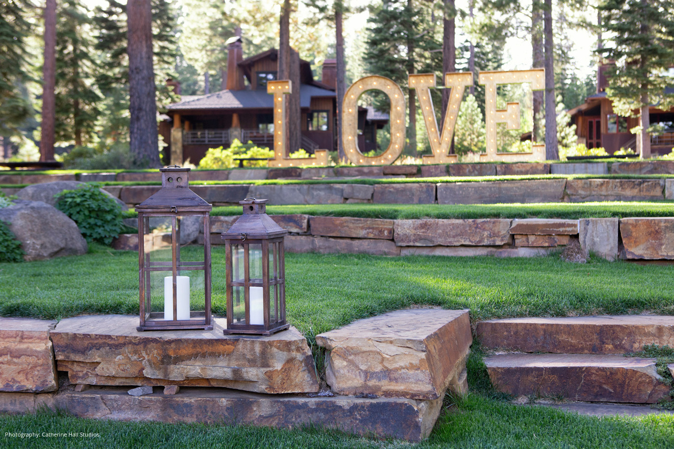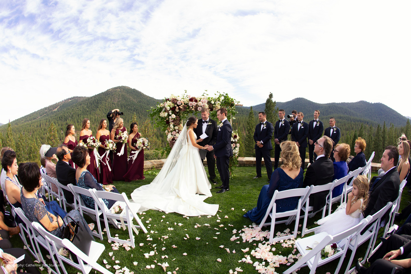 Envisioning a romantic autumn wedding set against spectacular views, the two worked closely with florist Diana Thale and wedding planner Kyleigh Stewart of Audere Events to bring their vision to life. Naturally, the verdant setting of Martis Camp served as a source of inspiration for their nuptials. From there, the couple chose deep jewel colors to enhance the emerald green of the outdoors. Breath-taking floral arrangements in bursts of white, peach, and burgundy rivaled the scenery. In front of their nearest and dearest, under a bright blue sky surrounded by hun-dreds of pine trees, Brandon and Leslie were pronounced husband and wife.