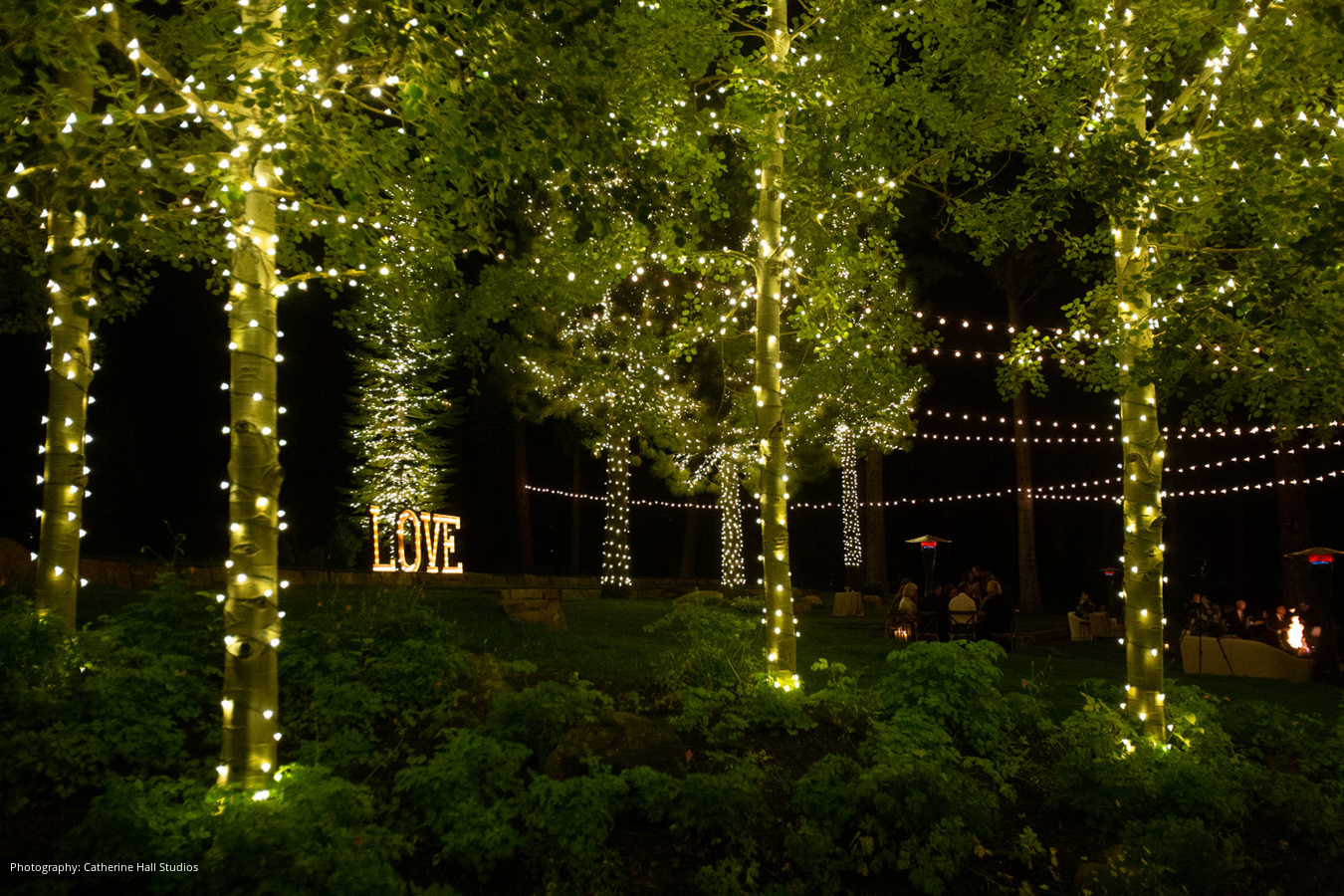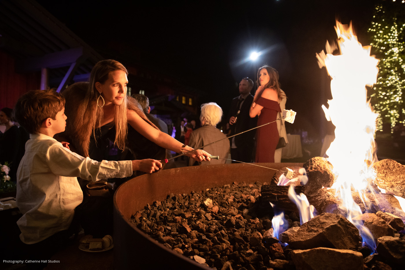 The celebration carried on long after sunset, illuminated by the glow of flickering candlelight, a roaring fire, and lights strung on trees like a scene from a fairy tale book. Friends and family danced under twinkling stars and roasted marshmal-lows at the fire pit, a playful nod to the lodge setting. Guests were also gifted freshly baked chocolate chip cookies as a sweet favor.