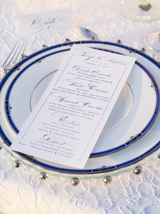 “We had the honor of collaborating with some extremely high-end Greek brands, including Mitheo Events who delivered on every detail, as well as truly fantastic and sought-after London brands such as John Nassari for our beautiful photography,” says Marie. “We also collaborated with Paul Antonio Scribe for our wedding menu and bride and groom signs in highly crafted calligraphy.”