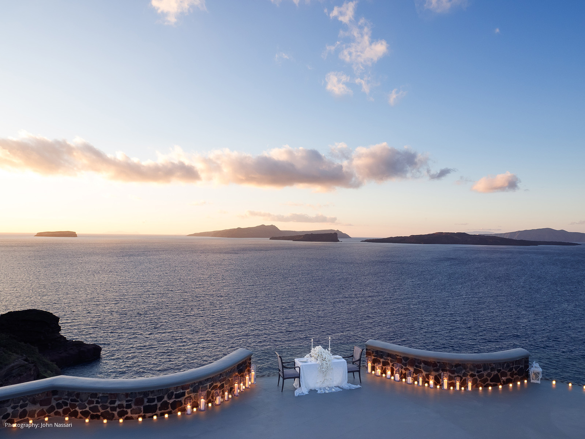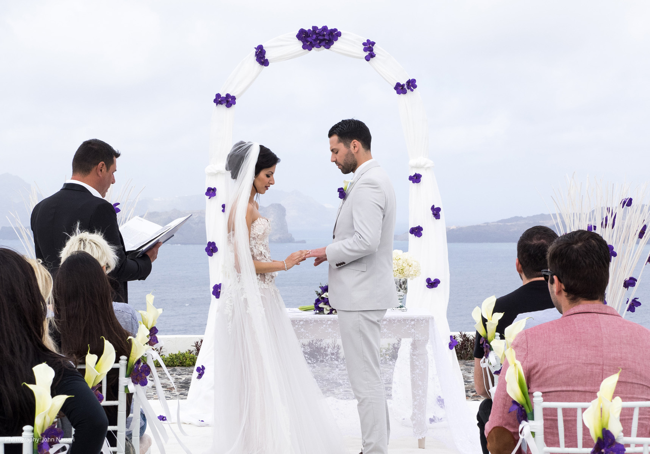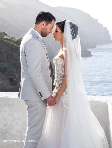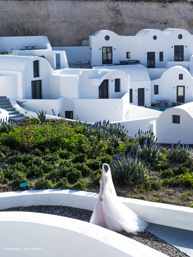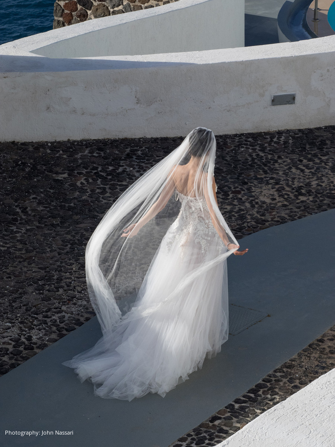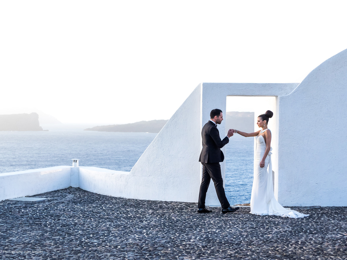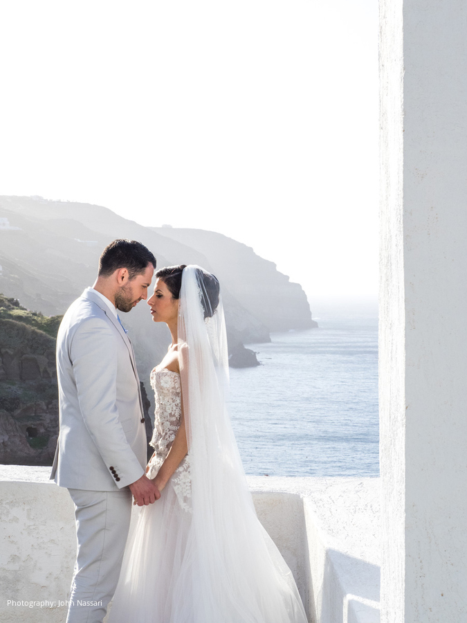 Location: Ambassador Aegean Luxury Hotel & Suites, Santorini, Santorini, Greece; Planner: Mitheo Events, Santorini, Greece; Floral Design: Petridis Floral Creations, Santorini, Greece; Stationery and Calligraphy: Paul Antonio Scribe, London, England; Bridal Salon: Morgan Davis Bridal, London, England; Bridal Accessories: Olivier Laudus London, England; Hair: Diamantopoulos Academy, Athens, Greece; Makeup: Makeup Art Irene Chaleli, Athens, Greece; Photography: John Nassari, London England